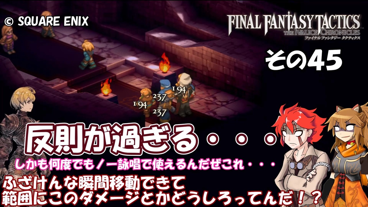 この動画はスチーム版ファイナルファンタジータクティクス イヴァリースクロニクルズの実況動画です。<br><br><br>難易度:タクティカル<br><br>※そのうち縛る縛り内容。<br>①ラムザくん 見習い戦士固定(まだいけてる)<br>②ネコ耳 斧or両手武器装備(両手持ちでもOK)<br>③ドラムカン 弓・ボウガン・銃装備<br>④きりたんです 武器攻撃禁止(たまに忘れる)<br>⑤あいちゃん 盾装備orサムラァイ<br><br><a href="https://www.nicovideo.jp/watch/sm45572711" class="watch">sm45572711</a> ← 前 次 → <a href="https://www.nicovideo.jp/watch/sm45576981" class="watch">sm45576981</a><br>マイリスト →<a href="https://www.nicovideo.jp/mylist/72149077" target="_blank" rel="noopener">mylist/72149077</a><br>その1リスト →<a href="https://www.nicovideo.jp/mylist/58364125" target="_blank" rel="noopener">mylist/58364125</a> <br><br>VOICEVOX:春日部つむぎ(ネコ耳) 玄野武宏(ラムザ・ベオルブ) 中部つるぎ(アグリアス様)<br> 青山龍星(ドラムカン) 東北きりたん(東北きりたん)<br> あいちゃん(中国うさぎ(立ち絵:akihiyo様作 立ち中国うさぎ素材 <a href="https://seiga.nicovideo.jp/seiga/im11211212" target="_blank" rel="noopener">im11211212</a>))<br>Voiceroid:東北きりたん(立ち絵:このりEX様作 東北きりたん立ち絵素材5 <a href="https://seiga.nicovideo.jp/seiga/im10819054" target="_blank" rel="noopener">im10819054</a>)<br><br>© SQUARE ENIX<br>