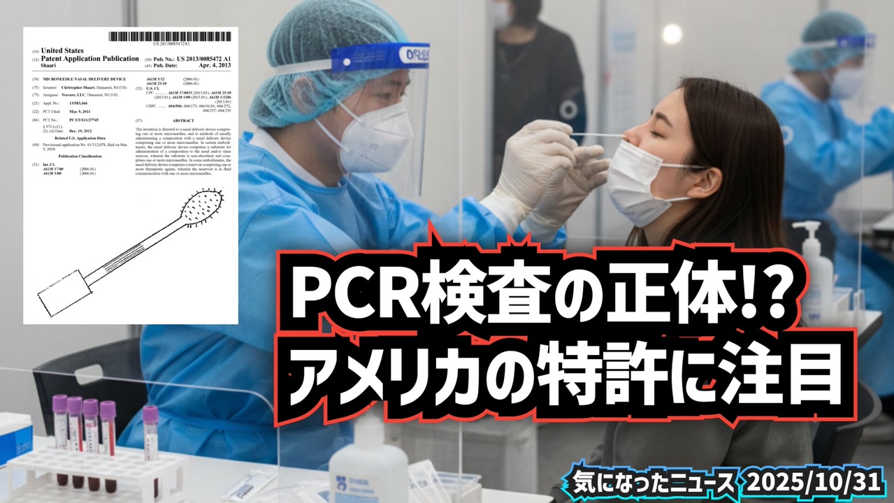 ◆え、これがPCR検査の正体!? 『マイクロニードル』特許に注目<br><br>米国特許「US20130085472A1」に記されたのは、“チップ”ではなく「マイクロニードル経鼻デリバリーデバイス」。<br>極細の針で鼻の粘膜に直接薬を届けるという、痛みを抑えた新しい投与方法の技術です。<br>この特許が公開されたのは2013年――PCR検査より前。<br>そして北海道大学のPCR検査への注意書きに注目<br><br>◆今回の台本(詳細)<a href="https://keiichiro8140.hatenablog.com/entry/25103111222" target="_blank" rel="noopener nofollow">https://keiichiro8140.hatenablog.com/entry/25103111222</a><br><br>◆これまでの動画<a href="https://x.gd/sPXoJ" target="_blank" rel="noopener nofollow">https://x.gd/sPXoJ</a><br><br>◆もしも(BAN)の時のためのマイリンク集<a href="https://lit.link/K16_888" target="_blank" rel="noopener nofollow">https://lit.link/K16_888</a><br><br>◆YouTubeチャンネル登録よろしくお願いします🙏 <a href="https://www.youtube.com/@K16news888" target="_blank" rel="noopener nofollow">https://www.youtube.com/@K16news888</a><br><br>ご覧いただきありがとうございます<br>m(_ _)m<br>気になったニュース 2025/10/31<br><br />著作権、肖像権に配慮して作成しております。<br><br>◆気になったニュースの台本!?<br>メモ代わりに作った台本をそのままあげてます<br><a href="https://keiichiro8140.hatenablog.com/." target="_blank" rel="noopener nofollow">https://keiichiro8140.hatenablog.com/.</a><br><br><br>ここからはシリーズ紹介<br><br><br>◆ ワクチン解毒・デトックス<br><a href="https://x.gd/fZweg" target="_blank" rel="noopener nofollow">https://x.gd/fZweg</a><br><br>◆ウイリアム・マキス博士のがん治療(イベルメクチン・フェンベンダゾール等)<br><a href="https://x.gd/AtFYS" target="_blank" rel="noopener nofollow">https://x.gd/AtFYS</a><br><br>◆予防接種健康被害救済制度<br><a href="https://x.gd/0xK9x" target="_blank" rel="noopener nofollow">https://x.gd/0xK9x</a><br><br>◆気になったニュース #1501~<br><br>◆ 【ショートver】気になったニュース<br><a href="https://x.gd/7MxXC" target="_blank" rel="noopener nofollow">https://x.gd/7MxXC</a><br><br>◆ 気になったニュース #1001~<br><a href="https://x.gd/Lp8gv" target="_blank" rel="noopener nofollow">https://x.gd/Lp8gv</a><br><br>◆ 気になったニュース #501~<br><a href="https://x.gd/EmbS4" target="_blank" rel="noopener nofollow">https://x.gd/EmbS4</a><br><br>◆ 気になったニュース #1~#500<br><a href="https://x.gd/uPhNb" target="_blank" rel="noopener nofollow">https://x.gd/uPhNb</a><br><br>◆ X(旧Twitter)・テレグラムで気になった情報<br><a href="https://x.gd/YG6FT" target="_blank" rel="noopener nofollow">https://x.gd/YG6FT</a><br><br>◆ 日比谷5万人パレードデ⚪生放送アーカイブ動画<br><a href="https://x.gd/3CHJv" target="_blank" rel="noopener nofollow">https://x.gd/3CHJv</a><br><br>◆日比谷5万人パレード⚪モのマイリスト作ってみました<br><a href="https://nico.ms/mylist/76828848?ref=sp_other" target="_blank" rel="noopener nofollow">https://nico.ms/mylist/76828848?ref=sp_other</a><br><br>◆3.30 令和の百姓⚪⚪<br><a href="https://www.nicovideo.jp/series/511791?ref=garage_share_other" target="_blank" rel="noopener nofollow">https://www.nicovideo.jp/series/511791?ref=garage_share_other</a><br><br>◆ 及川幸久さんの【XNEWS】シリーズ<br><a href="https://x.gd/3k78K" target="_blank" rel="noopener nofollow">https://x.gd/3k78K</a><br><br>◆これまでの動画<a href="https://x.gd/sPXoJ" target="_blank" rel="noopener nofollow">https://x.gd/sPXoJ</a><br><br>◆もしも(BAN)の時のためのマイリンク集<a href="https://lit.link/K-16_News44" target="_blank" rel="noopener nofollow">https://lit.link/K-16_News44</a><br><br>