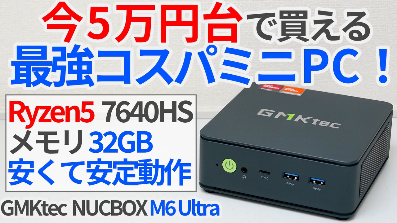 Zen4世代のミニPCがここまでお手頃に入手できるようになったのは嬉しいですね。<br>32GBメモリ版が5万円台なのもすごいけど、個人的にはベアボーン3万円台のほうがインパクトあるかも。<br><br>■今回紹介した製品<br>【GMKtec NUCBOX M6 Ultra】<br>・日本公式ストア (日本語・日本円支払い)<br><a href="https://jp.gmktec.com/products/gmktec-nucbox-m6-ultra-amd-ryzen-5-7640hs-mini-pc" target="_blank" rel="noopener nofollow">https://jp.gmktec.com/products/gmktec-nucbox-m6-ultra-amd-ryzen-5-7640hs-mini-pc</a><br><br>・Amazon<br>M6 Ultra 16+512:<a href="https://amzn.to/3LgsZQE" target="_blank" rel="noopener nofollow">https://amzn.to/3LgsZQE</a><br>M6 Ultra 32+512:<a href="https://amzn.to/4oryomr" target="_blank" rel="noopener nofollow">https://amzn.to/4oryomr</a><br>M6 Ultra 32+1TB:<a href="https://amzn.to/4odO2Sd" target="_blank" rel="noopener nofollow">https://amzn.to/4odO2Sd</a><br>M6 Ultra 16+1TB:<a href="https://amzn.to/47CSzGR" target="_blank" rel="noopener nofollow">https://amzn.to/47CSzGR</a><br><br>・楽天<br><a href="https://a.r10.to/hPdikX" target="_blank" rel="noopener nofollow">https://a.r10.to/hPdikX</a><br>※上記リンクにはアフィリエイトリンクを使用しています<br><br>■スペック<br>CPU:Ryzen5 7640HS<br>GPU:Radeon 760M<br>メモリ:DDR5-4800 16GB×2<br>SSD:PCIe3.0 ×4 1TB<br>OS:Windows11 Pro搭載<br><br>■比較対象のミニPC<br>【GMKtec NUCBOX M7】<br>レビュー動画:<a href="https://www.nicovideo.jp/watch/sm44885003" class="watch">sm44885003</a><br>Amazon:<a href="https://amzn.to/3YANVoW" target="_blank" rel="noopener nofollow">https://amzn.to/3YANVoW</a><br>公式ストア:<a href="https://www.gmktec.com/products/amd-ryzen-7-pro-6850h-mini-pc-nucbox-m7" target="_blank" rel="noopener nofollow">https://www.gmktec.com/products/amd-ryzen-7-pro-6850h-mini-pc-nucbox-m7</a><br><br>■Twitter<br><a href="https://twitter.com/midou_pcmovie?t=CswQClbF7dbVc44bT__4JA&s=09" target="_blank" rel="noopener nofollow">https://twitter.com/midou_pcmovie?t=CswQClbF7dbVc44bT__4JA&s=09</a><br><br>※上記リンクにはAmazonアソシエイツリンクを使用しています<br>#ゆっくり解説 #ミニPC #ryzen5