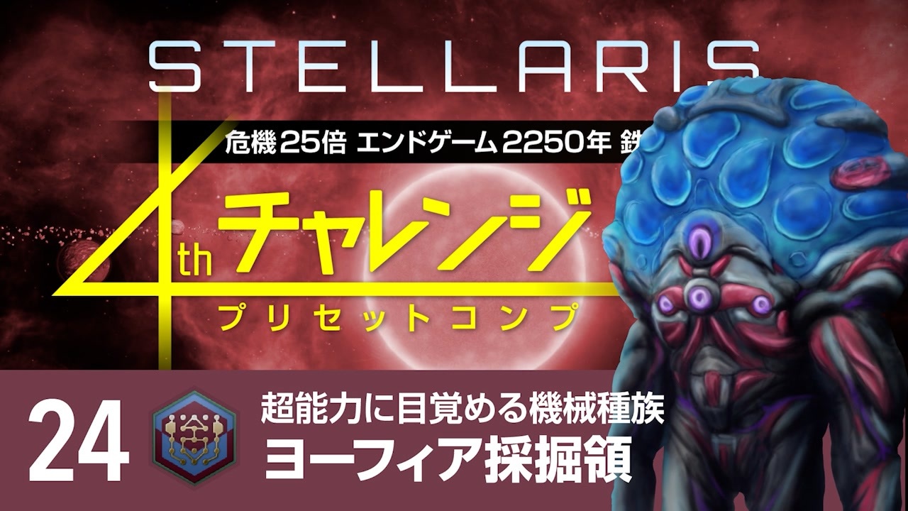 プリセット帝国で危機25倍エンドゲーム2250年鉄人モードに挑むシリーズのハイライト編集版です。<br>「いいね」にこのプリセット帝国のおすすめ度を入れています。<br><br>☆広告主のテロップに間違いがありましたので訂正いたします。<br>誤)Part22 テロンのブルームロット風景<br>正)Part23 アヴェブレン守護団<br><br>☆無編集版<br><a href="https://youtube.com/playlist?list=PLKTCcuX4WBFlbZDX8Xl4tjYh2cU4TzCos&si=Ln5jVFpzEakp3Ani" target="_blank" rel="noopener nofollow">https://youtube.com/playlist?list=PLKTCcuX4WBFlbZDX8Xl4tjYh2cU4TzCos&si=Ln5jVFpzEakp3Ani</a><br><br>☆チャレンジの詳細(予告編)<br><a href="https://www.nicovideo.jp/watch/sm39832845" class="watch">sm39832845</a><br><br>☆ゲーム<br>・Stellaris v4.1.5<br><br>☆設定<br>・危機:25倍<br>・ミッドゲーム:2225年<br>・エンドゲーム:2250年<br>・難易度:元帥<br>・鉄人モード:ON<br>・その他:デフォルト<br><br>☆DLC<br>・シャドウオブザシュラウドまで全部<br><br>☆MOD<br>・[4.0] Compact UI Topbar Expanded<br>・Improved Topbar - Extended<br>・Tech Tiers Revealed<br><br>☆ナレーション<br>四国めたん(VOICEVOX)<br><br /><br><span style="color: #262626;">1stチャレンジ(国際地球連合編)⇒ </span><span style="color: #0000ff;"><a href="https://www.nicovideo.jp/series/157544" target="_blank" rel="noopener">series/157544</a></span><br><span style="color: #262626;">2ndチャレンジ(人類共同体編)⇒ </span><span style="color: #0000ff;"><a href="https://www.nicovideo.jp/series/182469" target="_blank" rel="noopener">series/182469</a></span><br><span style="color: #262626;">3rdチャレンジ(ロク機械主義国編)⇒ </span><span style="color: #0000ff;"><a href="https://www.nicovideo.jp/series/207056" target="_blank" rel="noopener">series/207056</a></span><br><span style="color: #262626;">4thチャレンジ(プリセットコンプ)⇒ </span><span style="color: #0000ff;"><a href="https://www.nicovideo.jp/series/287612" target="_blank" rel="noopener">series/287612</a></span><br><span style="color: #262626;">Stellarisマルチプレイ ⇒ </span><span style="color: #0000ff;"><a href="https://www.nicovideo.jp/series/367123" target="_blank" rel="noopener">series/367123</a></span><br><span style="color: #262626;">Stellaris検証動画 ⇒ </span><span style="color: #0000ff;"><a href="https://www.nicovideo.jp/series/202576" target="_blank" rel="noopener">series/202576</a></span><br><span style="color: #262626;">Stellaris妄想動画 ⇒ </span><span style="color: #0000ff;"><a href="https://www.nicovideo.jp/series/310298" target="_blank" rel="noopener">series/310298</a></span><br>Stellaris1分動画祭 ⇒ <a href="https://www.nicovideo.jp/series/404730" target="_blank" rel="noopener">series/404730</a><br><br><br><a target="_blank" href="https://qa.nicovideo.jp/faq/show/19424?site_domain=default" style="font-size: 13px;color: #657586; text-decoration: underline; line-height: 1.4">この動画は投稿者によって修正されました</a>