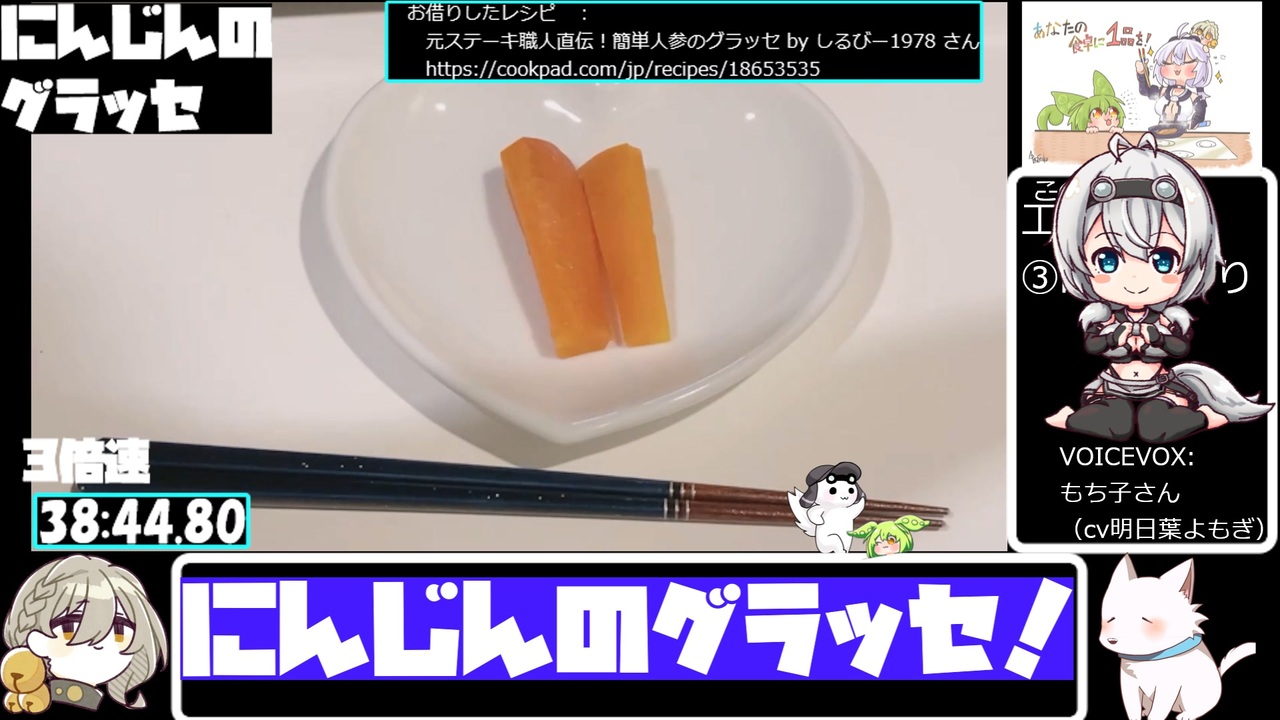 料理初心者がはじめて作る料理にチャレンジします!<br><br>参考にしたレシピはこちら<br> 元ステーキ職人直伝!簡単人参のグラッセ by しるびー1978 さん<br> <a href="https://cookpad.com/jp/recipes/18653535" target="_blank" rel="noopener nofollow">https://cookpad.com/jp/recipes/18653535</a><br /><br>編集に使用させていただいているものは、プロフィールみてね!<br><a href="https://www.nicovideo.jp/user/311366" target="_blank" rel="noopener nofollow">https://www.nicovideo.jp/user/311366</a><br><br>読み上げ:VOICEVOX もち子(cv明日葉よもぎ)、ずんだもん、四国めたん、青山龍星、WhiteCUL、伊織弓鶴、COEIROINK:猫米茶<br><br><strong>過去の動画にコメント、いいね!、ギフト、広告、フォロー、マイリストありがとうございました!</strong><br><br>とり料理祭ありがとうございました!<br>2023参加作品はこちら ⇒ <a href="https://www.nicovideo.jp/mylist/75430531" target="_blank" rel="noopener nofollow">https://www.nicovideo.jp/mylist/75430531</a><br>2024冬参加作品はこちら ⇒ <a href="https://www.nicovideo.jp/mylist/75862737" target="_blank" rel="noopener nofollow">https://www.nicovideo.jp/mylist/75862737</a><br>2024夏参加作品はこちら ⇒ <a href="https://www.nicovideo.jp/mylist/76572716" target="_blank" rel="noopener nofollow">https://www.nicovideo.jp/mylist/76572716</a><br>2025冬参加作品はこちら ⇒ <a href="https://www.nicovideo.jp/mylist/77171241" target="_blank" rel="noopener nofollow">https://www.nicovideo.jp/mylist/77171241</a><br>2025夏参加作品はこちら ⇒ <a href="https://www.nicovideo.jp/mylist/77600849" target="_blank" rel="noopener nofollow">https://www.nicovideo.jp/mylist/77600849</a><br><br>このその日ごとになんか出す定食屋か駄菓子屋のごとき動画を継続して投稿するために<br>スポンサーをひっそり募集しております、あなたも一口いかが?<br><a href="https://creator-support.nicovideo.jp/registration/311366" target="_blank" rel="noopener nofollow">https://creator-support.nicovideo.jp/registration/311366</a>