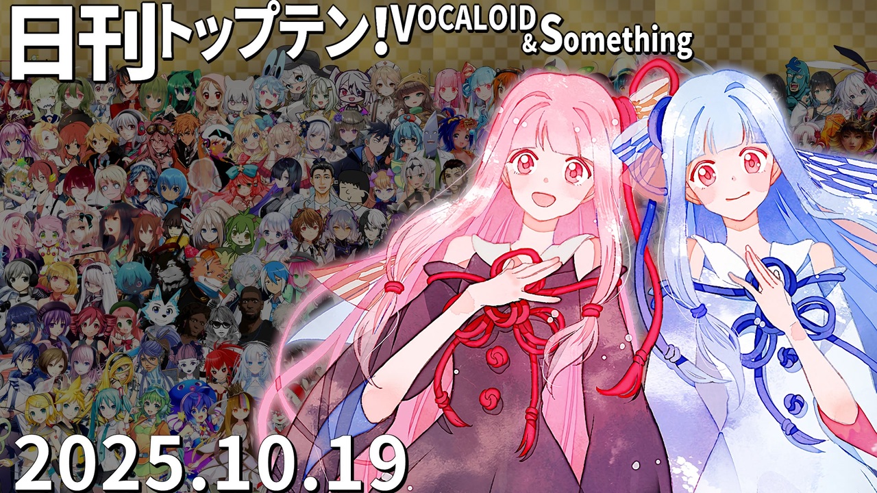 前日(10/18)←<a href="https://www.nicovideo.jp/watch/sm45579889" class="watch">sm45579889</a> <a href="https://www.nicovideo.jp/watch/sm45584640" class="watch">sm45584640</a>→翌日(10/20)<br>★各エンディングをXでまとめて確認できます!<a href="https://tinyurl.com/4pz498rk" target="_blank" rel="noopener nofollow">https://tinyurl.com/4pz498rk</a><br><br>★チャプター<br>昨日1位<a href="#" class="seekTime" data-seekTime="0:00" onclick="seekNicoPlayer('#0:00'); return false;">#0:00</a> TOP10<a href="#" class="seekTime" data-seekTime="0:36" onclick="seekNicoPlayer('#0:36'); return false;">#0:36</a> 1年前<a href="#" class="seekTime" data-seekTime="2:56" onclick="seekNicoPlayer('#2:56'); return false;">#2:56</a> TOP3<a href="#" class="seekTime" data-seekTime="3:24" onclick="seekNicoPlayer('#3:24'); return false;">#3:24</a> 10年前<a href="#" class="seekTime" data-seekTime="4:50" onclick="seekNicoPlayer('#4:50'); return false;">#4:50</a> PICKUP<a href="#" class="seekTime" data-seekTime="5:18" onclick="seekNicoPlayer('#5:18'); return false;">#5:18</a> <br><br>★トップテン<br>10:<a href="https://www.nicovideo.jp/watch/sm45529729" class="watch">sm45529729</a> 9:<a href="https://www.nicovideo.jp/watch/sm45502447" class="watch">sm45502447</a> 8:<a href="https://www.nicovideo.jp/watch/sm45518577" class="watch">sm45518577</a> 7:<a href="https://www.nicovideo.jp/watch/sm45509957" class="watch">sm45509957</a> <br>6:<a href="https://www.nicovideo.jp/watch/sm45422408" class="watch">sm45422408</a> 5:<a href="https://www.nicovideo.jp/watch/sm45526916" class="watch">sm45526916</a> 4:<a href="https://www.nicovideo.jp/watch/sm45527218" class="watch">sm45527218</a> 3:<a href="https://www.nicovideo.jp/watch/sm45524249" class="watch">sm45524249</a> 2:<a href="https://www.nicovideo.jp/watch/sm45523905" class="watch">sm45523905</a> 1:<a href="https://www.nicovideo.jp/watch/sm45528552" class="watch">sm45528552</a> <br><br>★ピックアップ(B~Jは超新着枠)<br>B:<a href="https://www.nicovideo.jp/watch/sm45527669" class="watch">sm45527669</a> C:<a href="https://www.nicovideo.jp/watch/sm45530139" class="watch">sm45530139</a> D:<a href="https://www.nicovideo.jp/watch/sm45527468" class="watch">sm45527468</a> E:<a href="https://www.nicovideo.jp/watch/sm45530290" class="watch">sm45530290</a> F:<a href="https://www.nicovideo.jp/watch/sm45519099" class="watch">sm45519099</a> G:<a href="https://www.nicovideo.jp/watch/sm45529781" class="watch">sm45529781</a> <br>H:<a href="https://www.nicovideo.jp/watch/sm45518868" class="watch">sm45518868</a> I:<a href="https://www.nicovideo.jp/watch/sm45527153" class="watch">sm45527153</a> J:<a href="https://www.nicovideo.jp/watch/sm45514835" class="watch">sm45514835</a> K:<a href="https://www.nicovideo.jp/watch/sm45503439" class="watch">sm45503439</a> L:<a href="https://www.nicovideo.jp/watch/sm45510376" class="watch">sm45510376</a> M:<a href="https://www.nicovideo.jp/watch/sm45506066" class="watch">sm45506066</a> <br>N:<a href="https://www.nicovideo.jp/watch/sm45527221" class="watch">sm45527221</a> O:<a href="https://www.nicovideo.jp/watch/sm45504484" class="watch">sm45504484</a> <br><br>★プレイバック <br>A(1年前):<a href="https://www.nicovideo.jp/watch/sm44231784" class="watch">sm44231784</a> 十(10年前):<a href="https://www.nicovideo.jp/watch/sm27404917" class="watch">sm27404917</a> 前日の第1位: <a href="https://www.nicovideo.jp/watch/sm45526465" class="watch">sm45526465</a>(琴葉茜・葵)<br><br>☆集計対象:2025/10/12~19 5時投稿の作品(10/19 5時集計)<br>★計算式:再生×1+コメント×最大12+いいね!×16+マイリスト×13<br>☆プレイリスト:<u><a href="https://nikkantop10.hatenablog.com/entry/ar20251019" target="_blank" rel="noopener nofollow">https://nikkantop10.hatenablog.com/entry/ar20251019</a></u> 、 <a href="https://www.nicovideo.jp/mylist/49271984" target="_blank" rel="noopener">mylist/49271984</a> <br>★1年前トップテン:<a href="https://www.nicovideo.jp/watch/sm44232761" class="watch">sm44232761</a><br />★日刊トップテン動画一覧マイリスト:<a href="https://www.nicovideo.jp/mylist/47849908" target="_blank" rel="noopener">mylist/47849908</a><br>☆ルールや計算式の詳細:<a href="https://nikkantop10-sub.hatenablog.com/entry/top10_rule" target="_blank" rel="noopener nofollow">https://nikkantop10-sub.hatenablog.com/entry/top10_rule</a><br><span style="color: #262626;">★K!!te Playlist LINK!:<a href="https://kiite.jp/user/AIST_playlist_bot" target="_blank" rel="noopener nofollow">https://kiite.jp/user/AIST_playlist_bot</a><br>☆Twitter:<a href="https://twitter.com/VOCALO_NEWRANK" target="_blank" rel="noopener nofollow">https://twitter.com/VOCALO_NEWRANK</a><br>★Thread:<a href="https://www.threads.net/@lukanan_p" target="_blank" rel="noopener nofollow">https://www.threads.net/@lukanan_p</a></span><br><br><span style="color: #0000ff;"><strong>◆今後の動画投稿イベント情報</strong></span><br>2025/12/29~31 <strong>先端映像音楽表現投稿祭</strong> <a href="https://twipla.jp/events/678401" target="_blank" rel="noopener nofollow">https://twipla.jp/events/678401</a><br>2026/1/1~4 <strong>ボカロサビ投稿祭2026 </strong><a href="https://twipla.jp/events/705936" target="_blank" rel="noopener nofollow">https://twipla.jp/events/705936</a> ※既存曲は新規投稿で参加可<br>2026/1/10~12 <strong>ポストロック投稿祭 </strong><a href="https://twipla.jp/events/694939" target="_blank" rel="noopener nofollow">https://twipla.jp/events/694939</a>