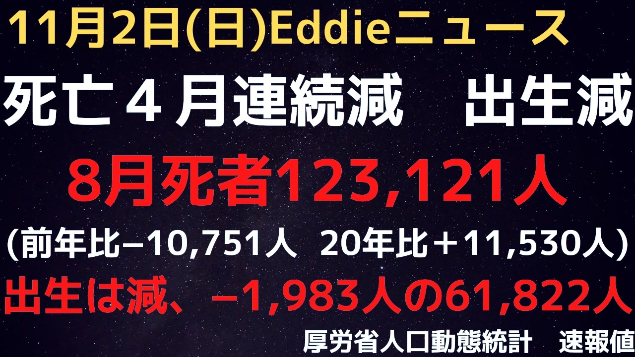 参考URL<br><a href="https://www.mhlw.go.jp/toukei/saikin/hw/jinkou/geppo/s2025/08.html" target="_blank" rel="noopener nofollow">https://www.mhlw.go.jp/toukei/saikin/hw/jinkou/geppo/s2025/08.html</a><br />Eddieと申します。<br>少し引棒めいたニュースを集めて喋っています。<br>よろしくお願いします。<br><br>23時過ぎYouTubeライブ配信(マイペース配信中)<br>「Eddieのホンマやと思うニュース3」<br><a href="https://www.youtube.com/channel/UCKaftD6X-qeHC5Vd9CMCedw" target="_blank" rel="noopener nofollow">https://www.youtube.com/channel/UCKaftD6X-qeHC5Vd9CMCedw</a><br><br>ニコ生は毎週土曜21時半〜(もしくは日曜21時半〜)<br><br>twitter<br>@Eddie2travel<br><br>YouTubeライブ配信1000回記念グッズなど販売中<br><a href="https://suzuri.jp/Eddie-Homma3" target="_blank" rel="noopener nofollow">https://suzuri.jp/Eddie-Homma3</a><br><br>