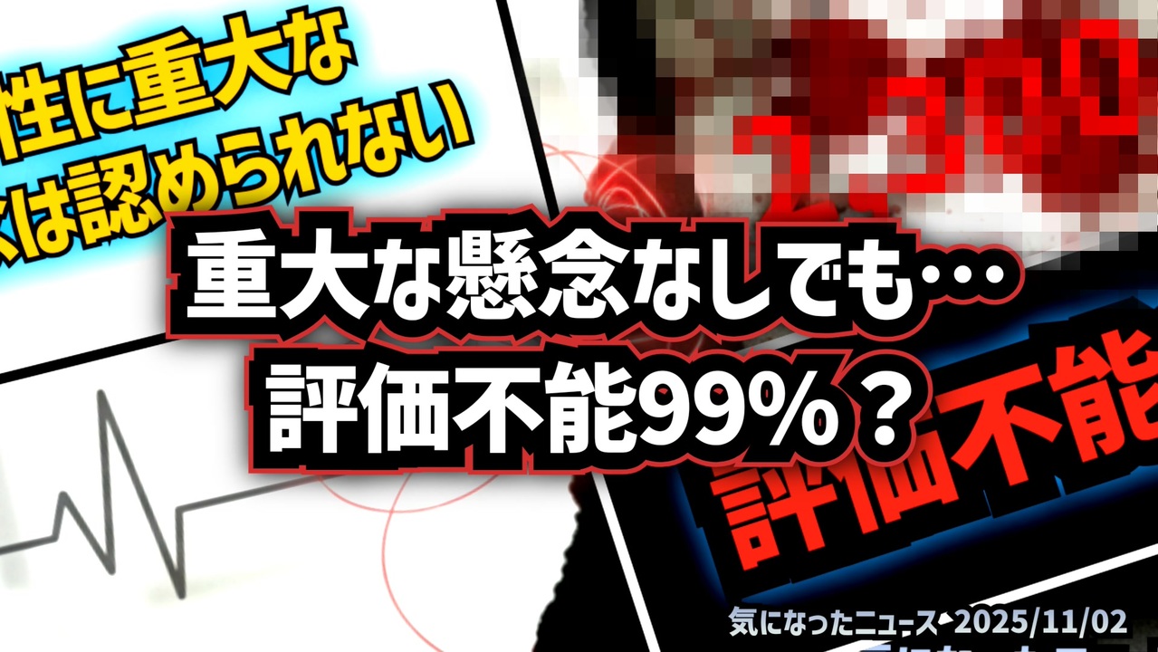 ◆安全性に重大な懸念は認められない…その裏では○亡報告の99%が“評価不能”<br><br>「重大な懸念なし、でも…」<br>「評価不能99%?」<br>「データが語る“現実”」<br><br>あらすじ <br>厚生労働省の公式会議資料によると、新型コロナワクチンの「副反応疑いによる死亡報告」は約2,300件。<br> しかし、そのうち99%が“評価不能”──つまり、因果関係を判断できなかったとされています。<br> 一方で、厚労大臣は「重大な懸念はない」と発言。<br> 果たして、この数字をどう受け止めればいいのでしょうか。<br> 信頼を築くために必要なのは、恐怖ではなく「情報の透明性」と「知る権利」。<br> データをもとに、冷静に“自分の選択”を考える必要性があります。<br><br>◆今回の台本(詳細)<a href="https://keiichiro8140.hatenablog.com/entry/25110222111" target="_blank" rel="noopener nofollow">https://keiichiro8140.hatenablog.com/entry/25110222111</a><br><br>◆これまでの動画<a href="https://x.gd/sPXoJ" target="_blank" rel="noopener nofollow">https://x.gd/sPXoJ</a><br><br>◆もしも(BAN)の時のためのマイリンク集<a href="https://lit.link/K16_888" target="_blank" rel="noopener nofollow">https://lit.link/K16_888</a><br><br>◆YouTubeチャンネル登録よろしくお願いします🙏 <a href="https://www.youtube.com/@K16news888" target="_blank" rel="noopener nofollow">https://www.youtube.com/@K16news888</a><br><br>ご覧いただきありがとうございます<br>m(_ _)m<br>気になったニュース 2025/11/02<br><br />著作権、肖像権に配慮して作成しております。<br><br>◆気になったニュースの台本!?<br>メモ代わりに作った台本をそのままあげてます<br><a href="https://keiichiro8140.hatenablog.com/." target="_blank" rel="noopener nofollow">https://keiichiro8140.hatenablog.com/.</a><br><br><br>ここからはシリーズ紹介<br><br><br>◆ ワクチン解毒・デトックス<br><a href="https://x.gd/fZweg" target="_blank" rel="noopener nofollow">https://x.gd/fZweg</a><br><br>◆ウイリアム・マキス博士のがん治療(イベルメクチン・フェンベンダゾール等)<br><a href="https://x.gd/AtFYS" target="_blank" rel="noopener nofollow">https://x.gd/AtFYS</a><br><br>◆予防接種健康被害救済制度<br><a href="https://x.gd/0xK9x" target="_blank" rel="noopener nofollow">https://x.gd/0xK9x</a><br><br>◆気になったニュース #1501~<br><br>◆ 【ショートver】気になったニュース<br><a href="https://x.gd/7MxXC" target="_blank" rel="noopener nofollow">https://x.gd/7MxXC</a><br><br>◆ 気になったニュース #1001~<br><a href="https://x.gd/Lp8gv" target="_blank" rel="noopener nofollow">https://x.gd/Lp8gv</a><br><br>◆ 気になったニュース #501~<br><a href="https://x.gd/EmbS4" target="_blank" rel="noopener nofollow">https://x.gd/EmbS4</a><br><br>◆ 気になったニュース #1~#500<br><a href="https://x.gd/uPhNb" target="_blank" rel="noopener nofollow">https://x.gd/uPhNb</a><br><br>◆ X(旧Twitter)・テレグラムで気になった情報<br><a href="https://x.gd/YG6FT" target="_blank" rel="noopener nofollow">https://x.gd/YG6FT</a><br><br>◆ 日比谷5万人パレードデ⚪生放送アーカイブ動画<br><a href="https://x.gd/3CHJv" target="_blank" rel="noopener nofollow">https://x.gd/3CHJv</a><br><br>◆日比谷5万人パレード⚪モのマイリスト作ってみました<br><a href="https://nico.ms/mylist/76828848?ref=sp_other" target="_blank" rel="noopener nofollow">https://nico.ms/mylist/76828848?ref=sp_other</a><br><br>◆3.30 令和の百姓⚪⚪<br><a href="https://www.nicovideo.jp/series/511791?ref=garage_share_other" target="_blank" rel="noopener nofollow">https://www.nicovideo.jp/series/511791?ref=garage_share_other</a><br><br>◆ 及川幸久さんの【XNEWS】シリーズ<br><a href="https://x.gd/3k78K" target="_blank" rel="noopener nofollow">https://x.gd/3k78K</a><br><br>◆これまでの動画<a href="https://x.gd/sPXoJ" target="_blank" rel="noopener nofollow">https://x.gd/sPXoJ</a><br><br>◆もしも(BAN)の時のためのマイリンク集<a href="https://lit.link/K-16_News44" target="_blank" rel="noopener nofollow">https://lit.link/K-16_News44</a><br><br>