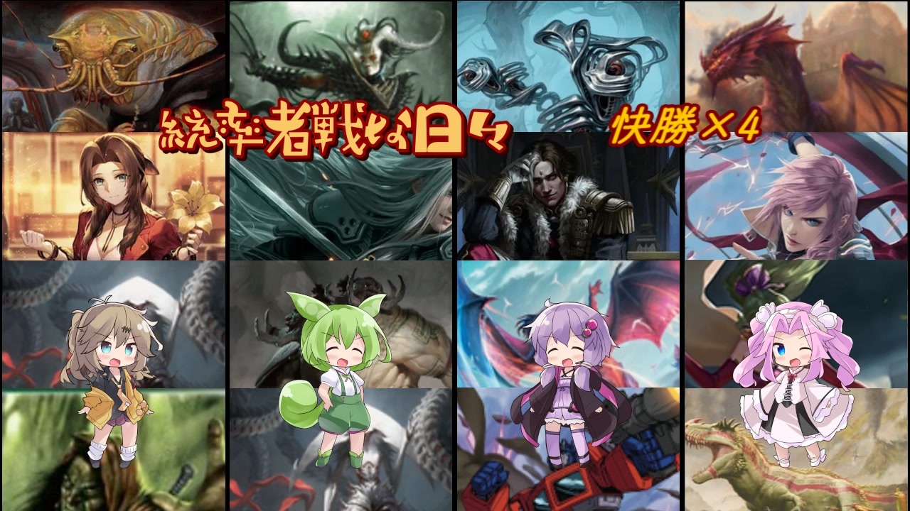 ボイロ(A.I.VOICE、VOICEVOX・VOICEPEAK)達による統率者戦のリプレイです<br>今回の統率者<br>・処刑者の族長、ヴラーン<br>・混合成体、ダイアドライン<br>・狡猾な扇動者、フィルクラーグ<br>・手際の良い宇宙調理士、ラゴスト<br>・エアリス・ゲインズブール<br>・星の継承者、セフィロス<br>・第三の座、エメトセルク<br>・シーンドライブ、ライトニング<br>・魔導戦士、ティナ<br>・エリシュ・ノーン<br>・自由なる者ルーリク・サー<br>・ガラゼス・プリズマリ<br>・英雄、オプティマスプライム/オートボット部隊長、オプティマスプライム<br>・暴走暴君、ガルタ<br>・クローサの拳バルー<br><br>Youtube版<br><a href="https://youtu.be/v5yZLwlVm58" target="_blank" rel="noopener nofollow">https://youtu.be/v5yZLwlVm58</a><br><br>[追記]<br>ミスが多かったので、いくつか修正しました<br />作ったやつ:<a href="https://www.nicovideo.jp/mylist/63489798" target="_blank" rel="noopener">mylist/63489798</a><br><br><a target="_blank" href="https://qa.nicovideo.jp/faq/show/19424?site_domain=default" style="font-size: 13px;color: #657586; text-decoration: underline; line-height: 1.4">この動画は投稿者によって修正されました</a>
