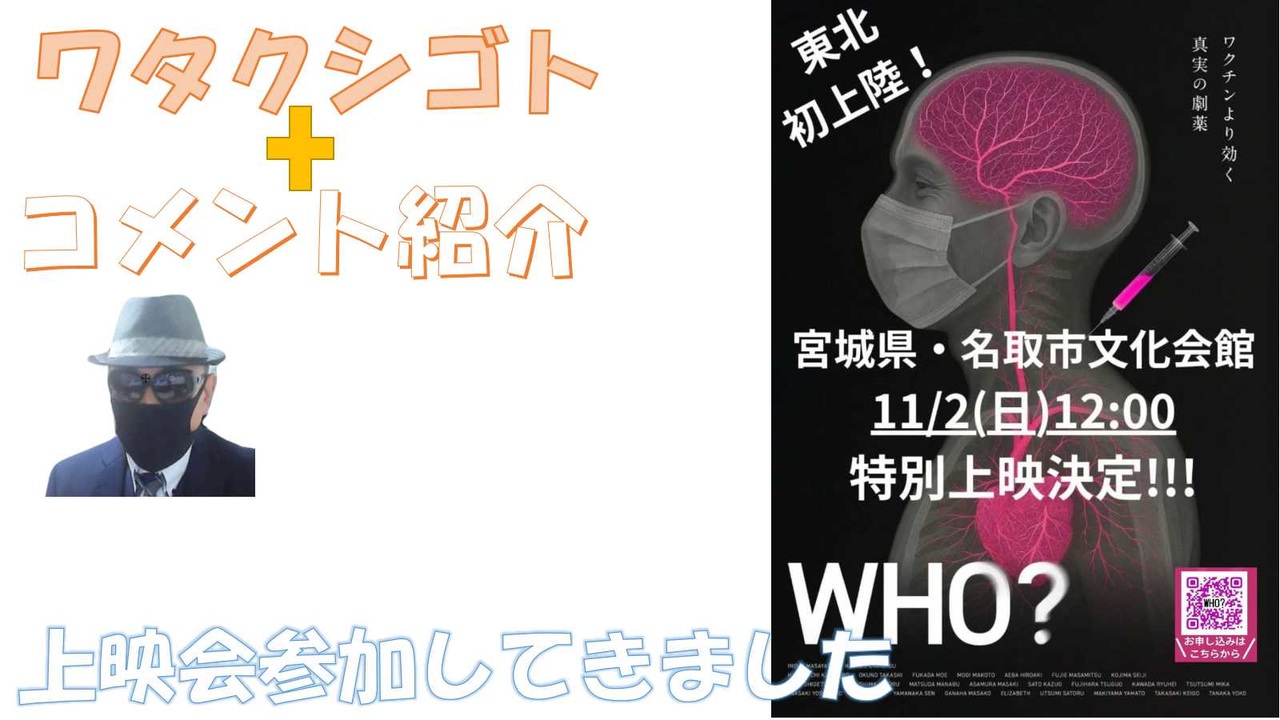 有明デモ:残念ながら私は映っていない<br><br>鵜川和久(駆け込み寺2020理事長)<br>・観てて辛くなった<br>・知らしめたい、分からせたい<br><br>父子で接種<br>息子が亡くなる。翌日、自殺<br>自分がもっと調べれば・・<br><br>遺族、登壇4人<br><br>・運よく救済制度で認められたが・・<br>・おばあちゃんがいるからワクチン打って(娘)<br><br>なるせゆせい監督×鵜川和久<br>司会:県民の健康を考える会・命の絆<br>鈴木花<br><br>な:有明デモのとき映画にしてくれと依頼された。<br> 断ろうと思ったが、歴史の1ページとして作った<br><br>鵜:盗聴されていたことも<br><br>な:鵜川さんは炎の人、僕は水の人。<br> 最初は有明デモ(見かけた一般通行人の感想)<br> 熱い思いに引いちゃう人もいる<br> なるべくマイルドに<br> 親父はなくなった、多分、ワクチンが原因<br> 言葉を変えれば説得できなかった・・<br> 映画なら説得できたかも<br> <br>質疑応答<br>1 君トン、解決策をお聞きしたく<br> 三橋TVの内容で良いのでは?<br><br>な:僕としては考えてもらう(専門家ではないので解決策は・・)<br> <br>2 ワクチン接種のデータを調べて打ちませんでした<br> 近い内に発表されると思ったら4年も発表されない。<br> 今回も特別上映、上映会とかを企画できるのでしょうか?<br><br>鈴:3年前に初めて上映会をしましたが、素人でもなんとかなるものです。<br> 仙台フォーラムでやってほしかったのですが、断られました。<br> <br>な:上映期間中だと映画館が嫌がるのですが、東北は上映されていない、ということで。<br>鵜:遺族はどういう形になっても満足は無いです。自分がどれだけ納得して死ねるか?なんです。<br>な:テレビのワクが買える<br>鈴:皆さんがマスコミになって広げてください<br><br><br>【コメント】<br><br>ツバでワクチン成分が感染します<br><br>コロナが今も流行ってるの? 初耳ですw<br><br>話さないで下さい:未だにそんな感覚の人がいるのが凄いですね。恐らくコロナを信じて、マスクをして、個人的なシェディング恐怖症なんでしょうね。<br><br>メガソーラー規制に舵を切れたのはDSの意向かも。ゲイツが地球温暖化は技術革新でどうにかなるからそちらはもう辞めにすると言い出した。→<br><br>→トランプ大統領は地球温暖化は今世紀最大の詐欺とか言ってはいたが、ゲイツとディールを交わしたか。しかしゲイツは毒ワク事業の大切さを唱え、トラ氏も→<br><br>最近はそちらを重視するような発言もある。