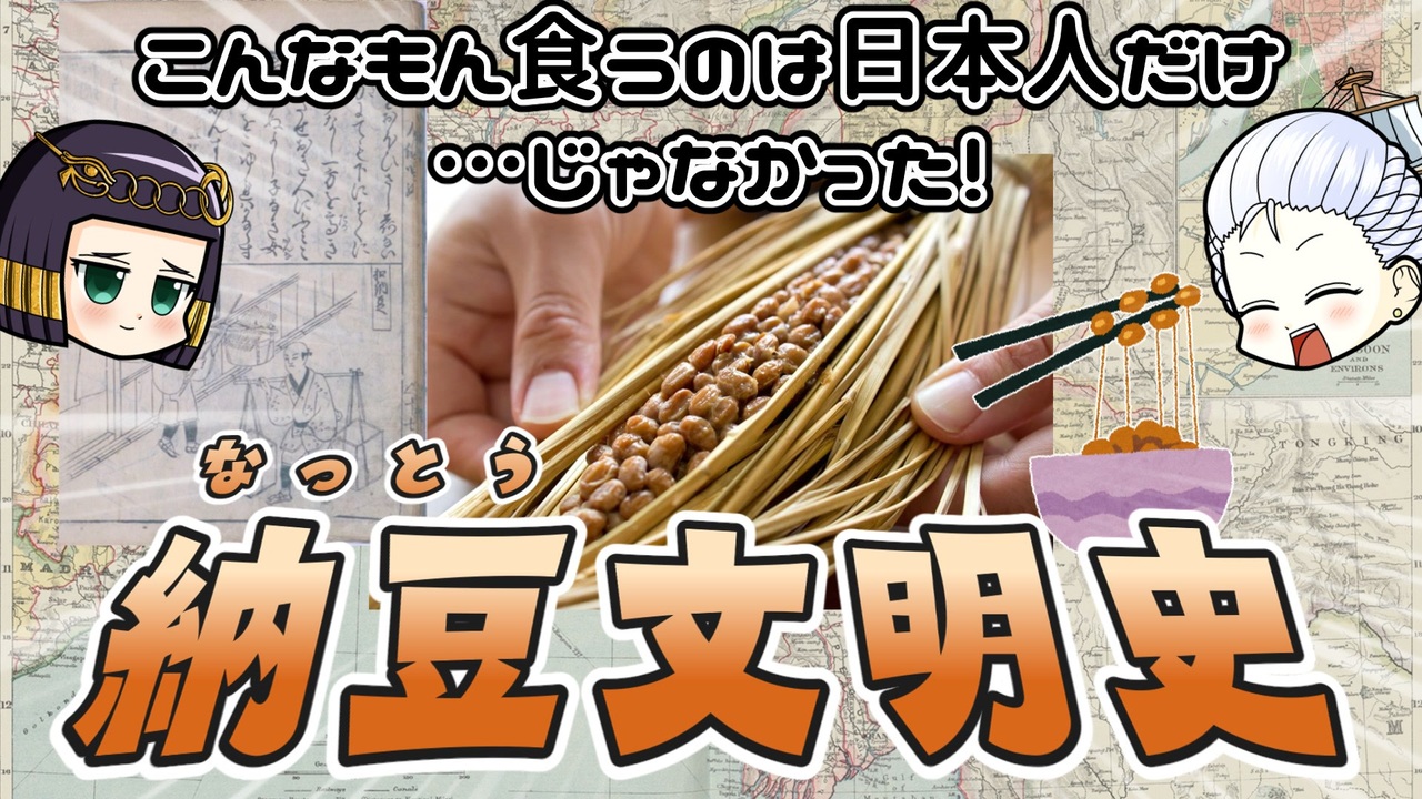マリーは匂いに敏感なようです。 <br>「文明史」ってなんだよって話ですが、納豆の話です。いいタイトルが浮かばなかったので大袈裟に名付けた釣りです。 <br>日本独自の食べ物と思われがちな納豆ですが、古くから大豆が栽培されていた地域にはけっこう普通にあったりしたようです。 <br><br>☆ファンアートありがとうございました☆ <br>化歌さんのアカウント↓↓↓ <br>Twitter(X?):<a href="https://x.com/swichsp39" target="_blank" rel="noopener nofollow">https://x.com/swichsp39</a> <br>Pixiv: <a href="https://www.pixiv.net/users/5345508" target="_blank" rel="noopener nofollow">https://www.pixiv.net/users/5345508</a> <br><br>☆ニコニコチャンネル「モンド・ヒストリカの離宮」 →<a href="https://ch.nicovideo.jp/mond-historica" target="_blank" rel="noopener nofollow">https://ch.nicovideo.jp/mond-historica</a> <br><br>今回の参考文献: <br>横山智(2014)『納豆の起源』NHK出版<br>高野秀行(2016)『謎のアジア納豆 そして帰ってきた<日本納豆>』新潮社<br>全国納豆協同組合連合会 納豆PRセンターHP → <a href="https://natto.or.jp/index.php" target="_blank" rel="noopener nofollow">https://natto.or.jp/index.php</a> <br>タカノフーズ HP → <a href="https://www.takanofoods.co.jp/" target="_blank" rel="noopener nofollow">https://www.takanofoods.co.jp/</a> <br><br>その他 Wikipediaなど <br><br>江戸時代の納豆売りの図像の出典(22:02)京都大学貴重資料デジタルアーカイブ → <a href="https://rmda.kulib.kyoto-u.ac.jp/item/rb00013050" target="_blank" rel="noopener nofollow">https://rmda.kulib.kyoto-u.ac.jp/item/rb00013050</a> twitter→<a href="https://twitter.com/mond_historica" target="_blank" rel="noopener nofollow">https://twitter.com/mond_historica</a><br />━━━━━━━━━━━━━━━━━━━━━<br><br>この動画はクリエイティブ・コモンズ継承(CC-BY-SA)ライセンスの素材を使用して制作しています。(<a href="https://creativecommons.org/licenses/by-sa/4.0/)" target="_blank" rel="noopener nofollow">https://creativecommons.org/licenses/by-sa/4.0/)</a><br>規約に基づき、この動画もCC-BY-SA 4.0 のもとで公開します。<br><br>投稿者共通情報☆彡<br><br>BGM, SE:ニコニ・コモンズ様<br><a href="http://commons.nicovideo.jp/" target="_blank" rel="noopener nofollow">http://commons.nicovideo.jp/</a><br>魔王魂様<br><a href="https://maoudamashii.jokersounds.com/" target="_blank" rel="noopener nofollow">https://maoudamashii.jokersounds.com/</a><br>Audiostock様<br><a href="https://audiostock.jp/" target="_blank" rel="noopener nofollow">https://audiostock.jp/</a><br><br>立ち絵 霊夢・魔理沙(黒子式):nicotalk様<br><a href="http://www.nicotalk.com/charasozai.html" target="_blank" rel="noopener nofollow">http://www.nicotalk.com/charasozai.html</a><br><br>立ち絵 パトラ、マリー、アン、メアリ:ライフライフ様<br><a href="https://0801lifelife.tumblr.com/" target="_blank" rel="noopener nofollow">https://0801lifelife.tumblr.com/</a><br><br>使用ツール1:ゆっくりムービーメーカー4<br><a href="https://manjubox.net/ymm4/" target="_blank" rel="noopener nofollow">https://manjubox.net/ymm4/</a><br><br>使用ツール2:AviUtl<br><a href="http://spring-fragrance.mints.ne.jp/aviutl/" target="_blank" rel="noopener nofollow">http://spring-fragrance.mints.ne.jp/aviutl/</a><br><br>各時代の地図 : World History Maps & Timelines <br><a href="http://geacron.com/home-en/" target="_blank" rel="noopener nofollow">http://geacron.com/home-en/</a><br><br>ゆっくりボイスについて:AquesTalkライセンス取得済み<br><br>キャラクターボイス<br>アン・ボニー:羽ノ華(A.I.VOICE)<br>メアリ・リード:琴葉 葵(A.I.VOICE)<br>クレオパトラ:結月ゆかり(VOICEROID2)<br>マリー‐アントワネット:東北きりたん (VOICEROID EX)<br>その他キャラ:青山龍星(A.I.VOICE)、伊織弓鶴(A.I.VOICE2)、栗田まろん(A.I.VOICE)、宮舞モカ(VOICEPEAK)、フリモメン(VOICEPEAK)<br><br><br><br>その他フリー素材ご提供元の皆様に圧倒的感謝<br>