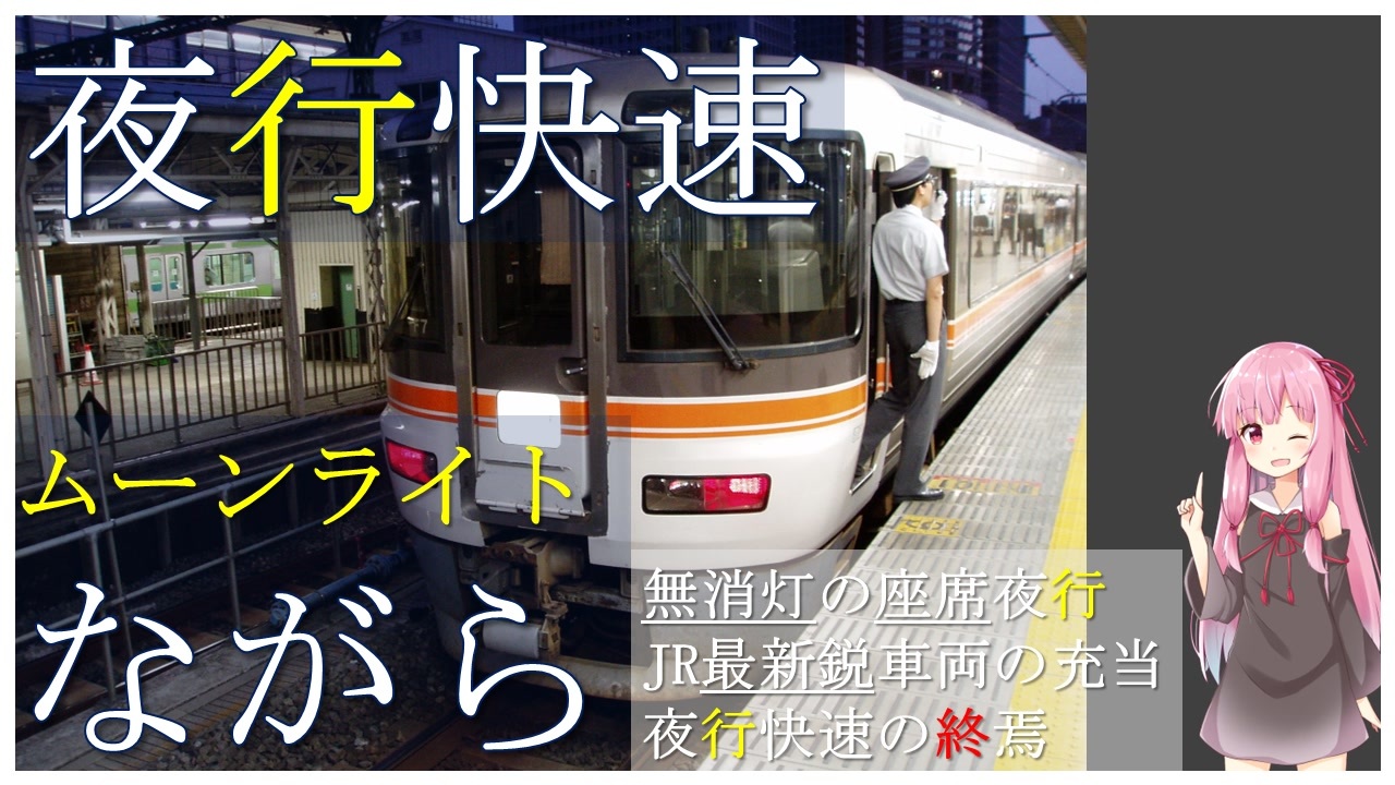 <a href="#" class="seekTime" data-seekTime="0:00" onclick="seekNicoPlayer('#0:00'); return false;">#0:00</a> イントロダクション<br><a href="#" class="seekTime" data-seekTime="0:27" onclick="seekNicoPlayer('#0:27'); return false;">#0:27</a> 大垣夜行の設定<br><a href="#" class="seekTime" data-seekTime="3:31" onclick="seekNicoPlayer('#3:31'); return false;">#3:31</a> ムーンライトながらの設定<br><a href="#" class="seekTime" data-seekTime="4:48" onclick="seekNicoPlayer('#4:48'); return false;">#4:48</a> 臨時列車化<br><a href="#" class="seekTime" data-seekTime="5:43" onclick="seekNicoPlayer('#5:43'); return false;">#5:43</a> 運行終了<br><br>BGM: <br>【BGM素材】夜想ラヂオ <br><a href="https://www.nicovideo.jp/watch/sm40399432" class="watch">sm40399432</a> <br>【BGM素材】晴色カレイドスコープ <br><a href="https://www.nicovideo.jp/watch/sm43328363" class="watch">sm43328363</a> <br>夏色ビードロ <br><a href="https://youtu.be/Muv7CXBlsLo?si=2EFp1YdiZbYo8AQG" target="_blank" rel="noopener nofollow">https://youtu.be/Muv7CXBlsLo?si=2EFp1YdiZbYo8AQG</a> <br>Stream <br><a href="https://youtu.be/_bJr0OjB8g4?si=lTJlCSR17A_sNnRv" target="_blank" rel="noopener nofollow">https://youtu.be/_bJr0OjB8g4?si=lTJlCSR17A_sNnRv</a> <br>【フリーBGM】流星のサイトシーイング - sister cape feat.日暮 Lyric Video【歌もの】 <br><a href="https://youtu.be/cLeEILno51o?si=ZjUHI3noJAuu7QIB" target="_blank" rel="noopener nofollow">https://youtu.be/cLeEILno51o?si=ZjUHI3noJAuu7QIB</a> <br><br>入力文字読み上げソフト: <br>VOICEROID2琴葉茜・葵 <br><a href="https://www.ah-soft.com/voiceroid/kotonoha/" target="_blank" rel="noopener nofollow">https://www.ah-soft.com/voiceroid/kotonoha/</a> <br><br>立ち絵: <br>おみなえし さん <br><a href="https://seiga.nicovideo.jp/seiga/im8261050" target="_blank" rel="noopener">im8261050</a> <br><br>OSM: <br><a href="http://www.openstreetmap.org/copyright" target="_blank" rel="noopener nofollow">http://www.openstreetmap.org/copyright</a> <br><br>製作ツール: <br>AviUtl <br><a href="https://seiga.nicovideo.jp/seiga/im1696493" target="_blank" rel="noopener">im1696493</a> <br><br>YouTubeで見る:<br><a href="https://youtu.be/rsRWDRdtS4M" target="_blank" rel="noopener nofollow">https://youtu.be/rsRWDRdtS4M</a>