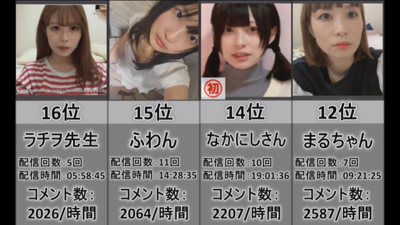 ニコ生女性配信者の1時間あたり平均コメント数ランキング【2025年10月版】です<br>※月に5回以上配信し1時間以上の配信が3回以上もしくは累計4時間以上配信した人のみ<br>時速1000コメント以上の人のみ集計しています<br>フリーBGM使用<br><br>***<br>【2025年9月版】女性配信者勢いランキングTOP33<br><a href="https://www.nicovideo.jp/watch/sm45468540" target="_blank" rel="noopener nofollow">https://www.nicovideo.jp/watch/sm45468540</a><br>【2025年8月版】女性配信者勢いランキングTOP35<br><a href="https://www.nicovideo.jp/watch/sm45361680" target="_blank" rel="noopener nofollow">https://www.nicovideo.jp/watch/sm45361680</a><br>【2025年7月版】女性配信者勢いランキングTOP22<br><a href="https://www.nicovideo.jp/watch/sm45247795" target="_blank" rel="noopener nofollow">https://www.nicovideo.jp/watch/sm45247795</a><br>【2025年6月版】女性配信者勢いランキングTOP26<br><a href="https://www.nicovideo.jp/watch/sm45143838" target="_blank" rel="noopener nofollow">https://www.nicovideo.jp/watch/sm45143838</a><br>【2025年5月版】女性配信者勢いランキングTOP33<br><a href="https://www.nicovideo.jp/watch/sm45044855" target="_blank" rel="noopener nofollow">https://www.nicovideo.jp/watch/sm45044855</a><br>【2025年4月版】女性配信者勢いランキングTOP30<br><a href="https://www.nicovideo.jp/watch/sm44935935" target="_blank" rel="noopener nofollow">https://www.nicovideo.jp/watch/sm44935935</a><br>【2025年3月版】女性配信者勢いランキングTOP34<br><a href="https://www.nicovideo.jp/watch/sm44832905" target="_blank" rel="noopener nofollow">https://www.nicovideo.jp/watch/sm44832905</a><br>【2025年2月版】女性配信者勢いランキングTOP38<br><a href="https://www.nicovideo.jp/watch/sm44722845" target="_blank" rel="noopener nofollow">https://www.nicovideo.jp/watch/sm44722845</a><br>【2025年1月版】女性配信者勢いランキングTOP44<br><a href="https://www.nicovideo.jp/watch/sm44602817" target="_blank" rel="noopener nofollow">https://www.nicovideo.jp/watch/sm44602817</a><br><br>【2024年版】ニコ生女性配信者 年間勢いランキングTOP100<br><a href="https://www.nicovideo.jp/watch/sm44496450" target="_blank" rel="noopener nofollow">https://www.nicovideo.jp/watch/sm44496450</a><br>【2024年12月版】女性配信者勢いランキングBEST39<br><a href="https://www.nicovideo.jp/watch/sm44493130" target="_blank" rel="noopener nofollow">https://www.nicovideo.jp/watch/sm44493130</a><br>【2024年11月版】女性配信者勢いランキングBEST40<br><a href="https://www.nicovideo.jp/watch/sm44383315" target="_blank" rel="noopener nofollow">https://www.nicovideo.jp/watch/sm44383315</a><br><br>2020年1月~2024年8月 女性配信者勢いランキング<br><a href="https://www.nicovideo.jp/watch/sm44118401" target="_blank" rel="noopener nofollow">https://www.nicovideo.jp/watch/sm44118401</a>