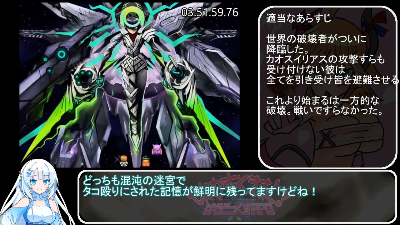 もんむす・くえすと!ぱらどっくすRPG終章 Ver3.04<br>コンバートなし<br><br>レギュ補足<br>難易度変更の禁止<br>ルーラールーラー使用禁止<br>システムデータは空っぽの状態で始める<br><br>前<a href="https://www.nicovideo.jp/watch/sm45447185" class="watch">sm45447185</a><br>次<a href="https://www.nicovideo.jp/watch/sm45620602" class="watch">sm45620602</a><br><br>区間<br>天界都市救援イベント から 天界の破壊者終了 まで<br><br>11月1日に間に合わせようと思ったら、思ったより動画長くなってこんな時間に<br><br><span style="color: #ff0000; font-size: 18px;">ご視聴の注意<br>もんぱらの深刻なネタバレがあります<br>ゲームプレイ後の視聴を推奨いたします</span><br><br><span style="color: #262626; font-size: 13px;">計測区間 NEWGAME選択から エンディングのタイトルロゴが表示された 瞬間まで</span><br><br><span style="color: #262626; font-size: 13px;">もんぱら用まいりすと<a href="https://www.nicovideo.jp/mylist/62081897" target="_blank" rel="noopener">mylist/62081897</a></span><br>BLACKSOULSⅡ<a href="https://www.nicovideo.jp/mylist/63878502" target="_blank" rel="noopener">mylist/63878502</a><br><span style="color: #262626; font-size: 13px;">BLACKSOULS </span><a href="https://www.nicovideo.jp/mylist/59887561" target="_blank" rel="noopener">mylist/59887561</a><br>その他<a href="https://www.nicovideo.jp/mylist/63112367" target="_blank" rel="noopener">mylist/63112367</a><br><br><br>実はもんぱらのdiscordサーバー作ってます。<br>なんか語りたい人がいたらどうぞ。<br><a href="https://discord.gg/MspJUkHYBn" target="_blank" rel="noopener nofollow">https://discord.gg/MspJUkHYBn</a><br><br><br>VOICEVOX:whitecul<br>