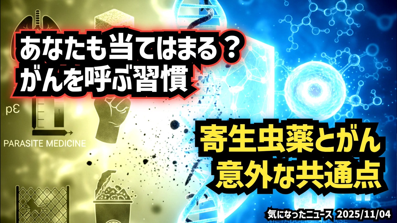 ◆知らずにやってる!? がんを招く15の生活習慣◆なぜ“寄生虫薬”ががん研究で注目されているのか?<br><br>あなたも当てはまる?がんを呼ぶ習慣<br>寄生虫薬とがん、意外な共通点<br><br>あらすじ<br>がんの発症には、日常のちょっとした生活習慣が深く関係していることが分かっています。<br>体温の低下、睡眠不足、糖質の摂りすぎ、ストレスや過労など、現代人が抱えやすい要因ばかり。<br>こうした生活リズムの乱れが、体内環境を変化させることで、がん細胞が好む条件を作り出してしまうのです。<br>一方、研究者トーマス・セイフリード博士は、がんを「代謝の病気」として捉え、寄生虫薬が注目される理由を代謝経路の共通点から説明しています。<br>がんの“燃料経路”をどう断つか——。<br>いま、生活と代謝の両面から新しいアプローチが模索されています。<br><br>◆今回の台本(詳細)<a href="https://keiichiro8140.hatenablog.com/entry/25110333999333" target="_blank" rel="noopener nofollow">https://keiichiro8140.hatenablog.com/entry/25110333999333</a><br><br>◆これまでの動画<a href="https://x.gd/sPXoJ" target="_blank" rel="noopener nofollow">https://x.gd/sPXoJ</a><br><br>◆もしも(BAN)の時のためのマイリンク集<a href="https://lit.link/K16_888" target="_blank" rel="noopener nofollow">https://lit.link/K16_888</a><br><br>◆YouTubeチャンネル登録よろしくお願いします🙏 <a href="https://www.youtube.com/@K16news888" target="_blank" rel="noopener nofollow">https://www.youtube.com/@K16news888</a><br><br>ご覧いただきありがとうございます<br>m(_ _)m<br>気になったニュース 2025/11/04<br><br />著作権、肖像権に配慮して作成しております。<br><br>◆気になったニュースの台本!?<br>メモ代わりに作った台本をそのままあげてます<br><a href="https://keiichiro8140.hatenablog.com/." target="_blank" rel="noopener nofollow">https://keiichiro8140.hatenablog.com/.</a><br><br><br>ここからはシリーズ紹介<br><br><br>◆ ワクチン解毒・デトックス<br><a href="https://x.gd/fZweg" target="_blank" rel="noopener nofollow">https://x.gd/fZweg</a><br><br>◆ウイリアム・マキス博士のがん治療(イベルメクチン・フェンベンダゾール等)<br><a href="https://x.gd/AtFYS" target="_blank" rel="noopener nofollow">https://x.gd/AtFYS</a><br><br>◆予防接種健康被害救済制度<br><a href="https://x.gd/0xK9x" target="_blank" rel="noopener nofollow">https://x.gd/0xK9x</a><br><br>◆気になったニュース #1501~<br><br>◆ 【ショートver】気になったニュース<br><a href="https://x.gd/7MxXC" target="_blank" rel="noopener nofollow">https://x.gd/7MxXC</a><br><br>◆ 気になったニュース #1001~<br><a href="https://x.gd/Lp8gv" target="_blank" rel="noopener nofollow">https://x.gd/Lp8gv</a><br><br>◆ 気になったニュース #501~<br><a href="https://x.gd/EmbS4" target="_blank" rel="noopener nofollow">https://x.gd/EmbS4</a><br><br>◆ 気になったニュース #1~#500<br><a href="https://x.gd/uPhNb" target="_blank" rel="noopener nofollow">https://x.gd/uPhNb</a><br><br>◆ X(旧Twitter)・テレグラムで気になった情報<br><a href="https://x.gd/YG6FT" target="_blank" rel="noopener nofollow">https://x.gd/YG6FT</a><br><br>◆ 日比谷5万人パレードデ⚪生放送アーカイブ動画<br><a href="https://x.gd/3CHJv" target="_blank" rel="noopener nofollow">https://x.gd/3CHJv</a><br><br>◆日比谷5万人パレード⚪モのマイリスト作ってみました<br><a href="https://nico.ms/mylist/76828848?ref=sp_other" target="_blank" rel="noopener nofollow">https://nico.ms/mylist/76828848?ref=sp_other</a><br><br>◆3.30 令和の百姓⚪⚪<br><a href="https://www.nicovideo.jp/series/511791?ref=garage_share_other" target="_blank" rel="noopener nofollow">https://www.nicovideo.jp/series/511791?ref=garage_share_other</a><br><br>◆ 及川幸久さんの【XNEWS】シリーズ<br><a href="https://x.gd/3k78K" target="_blank" rel="noopener nofollow">https://x.gd/3k78K</a><br><br>◆これまでの動画<a href="https://x.gd/sPXoJ" target="_blank" rel="noopener nofollow">https://x.gd/sPXoJ</a><br><br>◆もしも(BAN)の時のためのマイリンク集<a href="https://lit.link/K-16_News44" target="_blank" rel="noopener nofollow">https://lit.link/K-16_News44</a><br><br>