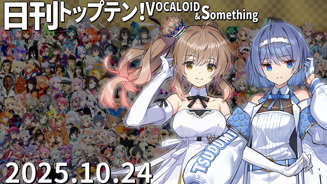 前日(10/23)←<a href="https://www.nicovideo.jp/watch/sm45591440" class="watch">sm45591440</a> <a href="https://www.nicovideo.jp/watch/sm45597832" class="watch">sm45597832</a>→翌日(10/25)<br>★ボカコレルーキー対象期間(2024年2月19日)以降で初紹介となる投稿者には「★NEW COMER!!★」マークを表記します。<br><br>★チャプター<br>昨日1位<a href="#" class="seekTime" data-seekTime="0:00" onclick="seekNicoPlayer('#0:00'); return false;">#0:00</a> TOP10<a href="#" class="seekTime" data-seekTime="0:36" onclick="seekNicoPlayer('#0:36'); return false;">#0:36</a> 1年前<a href="#" class="seekTime" data-seekTime="2:56" onclick="seekNicoPlayer('#2:56'); return false;">#2:56</a> TOP3<a href="#" class="seekTime" data-seekTime="3:24" onclick="seekNicoPlayer('#3:24'); return false;">#3:24</a> 10年前<a href="#" class="seekTime" data-seekTime="4:55" onclick="seekNicoPlayer('#4:55'); return false;">#4:55</a> PICKUP<a href="#" class="seekTime" data-seekTime="5:23" onclick="seekNicoPlayer('#5:23'); return false;">#5:23</a> <br><br>★トップテン<br>10:<a href="https://www.nicovideo.jp/watch/sm45543566" class="watch">sm45543566</a> 9:<a href="https://www.nicovideo.jp/watch/sm45538698" class="watch">sm45538698</a> 8:<a href="https://www.nicovideo.jp/watch/sm45449574" class="watch">sm45449574</a> 7:<a href="https://www.nicovideo.jp/watch/sm45527153" class="watch">sm45527153</a> <br>6:<a href="https://www.nicovideo.jp/watch/sm45529781" class="watch">sm45529781</a> 5:<a href="https://www.nicovideo.jp/watch/sm45528922" class="watch">sm45528922</a> 4:<a href="https://www.nicovideo.jp/watch/sm45528003" class="watch">sm45528003</a> 3:<a href="https://www.nicovideo.jp/watch/sm45545645" class="watch">sm45545645</a> 2:<a href="https://www.nicovideo.jp/watch/sm45538071" class="watch">sm45538071</a> 1:<a href="https://www.nicovideo.jp/watch/sm45544168" class="watch">sm45544168</a> <br><br>★ピックアップ(B~Dは超新着枠)<br>B:<a href="https://www.nicovideo.jp/watch/sm45546649" class="watch">sm45546649</a> C:<a href="https://www.nicovideo.jp/watch/sm45544910" class="watch">sm45544910</a> D:<a href="https://www.nicovideo.jp/watch/sm45538949" class="watch">sm45538949</a> E:<a href="https://www.nicovideo.jp/watch/sm45527631" class="watch">sm45527631</a> F:<a href="https://www.nicovideo.jp/watch/sm45526282" class="watch">sm45526282</a> G:<a href="https://www.nicovideo.jp/watch/sm45527435" class="watch">sm45527435</a> <br><br><br>★プレイバック <br>A(1年前):<a href="https://www.nicovideo.jp/watch/sm44247386" class="watch">sm44247386</a> 十(10年前):<a href="https://www.nicovideo.jp/watch/sm27438584" class="watch">sm27438584</a> 前日の第1位: <a href="https://www.nicovideo.jp/watch/sm45537847" class="watch">sm45537847</a>(さとうささら・すずきつづみ)<br><br>☆集計対象:2025/10/17~24 5時投稿の作品(10/24 5時集計)<br>★計算式:再生×1+コメント×最大12+いいね!×19+マイリスト×13<br>☆プレイリスト:<u><a href="https://nikkantop10.hatenablog.com/entry/ar20251024" target="_blank" rel="noopener nofollow">https://nikkantop10.hatenablog.com/entry/ar20251024</a></u> 、 <a href="https://www.nicovideo.jp/mylist/49271984" target="_blank" rel="noopener">mylist/49271984</a> <br>★1年前トップテン:<a href="https://www.nicovideo.jp/watch/sm44249843" class="watch">sm44249843</a><br />★日刊トップテン動画一覧マイリスト:<a href="https://www.nicovideo.jp/mylist/47849908" target="_blank" rel="noopener">mylist/47849908</a><br>☆ルールや計算式の詳細:<a href="https://nikkantop10-sub.hatenablog.com/entry/top10_rule" target="_blank" rel="noopener nofollow">https://nikkantop10-sub.hatenablog.com/entry/top10_rule</a><br><span style="color: #262626;">★K!!te Playlist LINK!:<a href="https://kiite.jp/user/AIST_playlist_bot" target="_blank" rel="noopener nofollow">https://kiite.jp/user/AIST_playlist_bot</a><br>☆Twitter:<a href="https://twitter.com/VOCALO_NEWRANK" target="_blank" rel="noopener nofollow">https://twitter.com/VOCALO_NEWRANK</a><br>★Thread:<a href="https://www.threads.net/@lukanan_p" target="_blank" rel="noopener nofollow">https://www.threads.net/@lukanan_p</a></span><br><br><span style="color: #0000ff;"><strong>◆今後の動画投稿イベント情報</strong></span><br>2025/12/29~31 <strong>先端映像音楽表現投稿祭</strong> <a href="https://twipla.jp/events/678401" target="_blank" rel="noopener nofollow">https://twipla.jp/events/678401</a><br>2026/1/1~4 <strong>ボカロサビ投稿祭2026 </strong><a href="https://twipla.jp/events/705936" target="_blank" rel="noopener nofollow">https://twipla.jp/events/705936</a> ※既存曲は新規投稿で参加可<br>2026/1/10~12 <strong>ポストロック投稿祭 </strong><a href="https://twipla.jp/events/694939" target="_blank" rel="noopener nofollow">https://twipla.jp/events/694939</a>