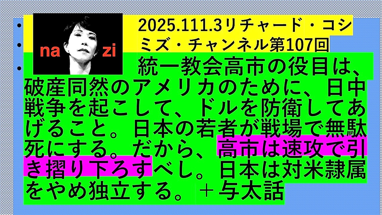 <span style="color: #cc0000;"><strong>◐『 テーマ : 新型コロナウイルス戦争⦅ 784 ⦆⦅ 改良版 ⦆ 』</strong></span><br><br> <span style="color: #ff0000;"><strong>「『 統一教会・高市早苗 』の『 役目 』は、『 破産 』同然の『 アメリカ 』のために、『 日中戦争 』を起こして、『 ドル 』を『 防衛 』してあげること。『 日本 』の『 若者 』が『 戦場 』で『 無駄死に 』する。だから、『 高市早苗 』は『 速攻 』で『 引き摺り下ろす 』べし。『 日本 』は『 対米隷属 』をやめ『 独立 』する。+『 与太話 』」</strong></span><br><br> <span style="color: #38761d;"><strong>◐『 リチャード・コシミズ・チャンネル</strong></span><span style="color: #ff0000;"><strong>⦅ ニコニコ チャンネル ⦆</strong></span><span style="color: #38761d;"><strong>』</strong></span><br> <span style="color: #0000ff;"><strong><a href="https://ch.nicovideo.jp/richardkoshimizu" target="_blank" rel="noopener nofollow">https://ch.nicovideo.jp/richardkoshimizu</a></strong></span><br><br> <span style="color: #38761d;"><strong>◐『「 リチャード・コシミズ 講演会 」公式「 動画ギャラリー 」</strong></span><span style="color: #ff0000;"><strong>⦅ 最新動画 ⦆⦅ YouTube 版 ⦆</strong></span><span style="color: #38761d;"><strong>』</strong></span><br> <span style="color: #0000ff;"><strong><a href="https://www.youtube.com/@richardkoshimizu-video-gallery" target="_blank" rel="noopener nofollow">https://www.youtube.com/@richardkoshimizu-video-gallery</a></strong></span><br>
