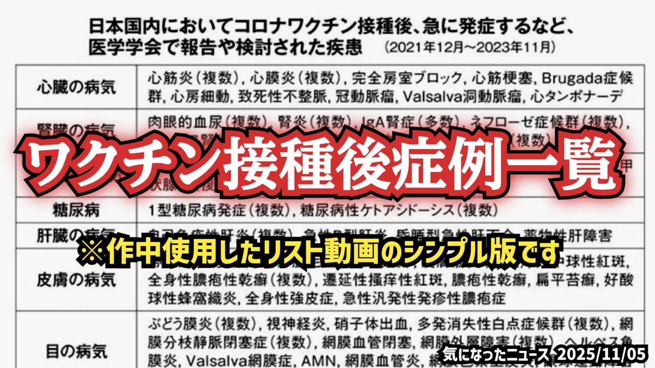 ◆ワクチン接種後症例一覧リスト<br>前回作中使用したリスト動画のシンプル版です<br><br><a href="https://bunshun.jp/articles/-/69377?utm_source=twitter.com&utm_medium=social&utm_campaign=socialLink" target="_blank" rel="noopener nofollow">https://bunshun.jp/articles/-/69377?utm_source=twitter.com&utm_medium=social&utm_campaign=socialLink</a><br><br>◆今回の台本(詳細)<a href="https://keiichiro8140.hatenablog.com/entry/25110555222" target="_blank" rel="noopener nofollow">https://keiichiro8140.hatenablog.com/entry/25110555222</a><br><br>◆これまでの動画<a href="https://x.gd/sPXoJ" target="_blank" rel="noopener nofollow">https://x.gd/sPXoJ</a><br><br>◆もしも(BAN)の時のためのマイリンク集<a href="https://lit.link/K16_888" target="_blank" rel="noopener nofollow">https://lit.link/K16_888</a><br><br>◆YouTubeチャンネル登録よろしくお願いします🙏 <a href="https://www.youtube.com/@K16news888" target="_blank" rel="noopener nofollow">https://www.youtube.com/@K16news888</a><br><br>ご覧いただきありがとうございます<br>m(_ _)m<br>気になったニュース 2025/11/05<br><br />著作権、肖像権に配慮して作成しております。<br><br>◆気になったニュースの台本!?<br>メモ代わりに作った台本をそのままあげてます<br><a href="https://keiichiro8140.hatenablog.com/." target="_blank" rel="noopener nofollow">https://keiichiro8140.hatenablog.com/.</a><br><br><br>ここからはシリーズ紹介<br><br><br>◆ ワクチン解毒・デトックス<br><a href="https://x.gd/fZweg" target="_blank" rel="noopener nofollow">https://x.gd/fZweg</a><br><br>◆ウイリアム・マキス博士のがん治療(イベルメクチン・フェンベンダゾール等)<br><a href="https://x.gd/AtFYS" target="_blank" rel="noopener nofollow">https://x.gd/AtFYS</a><br><br>◆予防接種健康被害救済制度<br><a href="https://x.gd/0xK9x" target="_blank" rel="noopener nofollow">https://x.gd/0xK9x</a><br><br>◆気になったニュース #1501~<br><br>◆ 【ショートver】気になったニュース<br><a href="https://x.gd/7MxXC" target="_blank" rel="noopener nofollow">https://x.gd/7MxXC</a><br><br>◆ 気になったニュース #1001~<br><a href="https://x.gd/Lp8gv" target="_blank" rel="noopener nofollow">https://x.gd/Lp8gv</a><br><br>◆ 気になったニュース #501~<br><a href="https://x.gd/EmbS4" target="_blank" rel="noopener nofollow">https://x.gd/EmbS4</a><br><br>◆ 気になったニュース #1~#500<br><a href="https://x.gd/uPhNb" target="_blank" rel="noopener nofollow">https://x.gd/uPhNb</a><br><br>◆ X(旧Twitter)・テレグラムで気になった情報<br><a href="https://x.gd/YG6FT" target="_blank" rel="noopener nofollow">https://x.gd/YG6FT</a><br><br>◆ 日比谷5万人パレードデ⚪生放送アーカイブ動画<br><a href="https://x.gd/3CHJv" target="_blank" rel="noopener nofollow">https://x.gd/3CHJv</a><br><br>◆日比谷5万人パレード⚪モのマイリスト作ってみました<br><a href="https://nico.ms/mylist/76828848?ref=sp_other" target="_blank" rel="noopener nofollow">https://nico.ms/mylist/76828848?ref=sp_other</a><br><br>◆3.30 令和の百姓⚪⚪<br><a href="https://www.nicovideo.jp/series/511791?ref=garage_share_other" target="_blank" rel="noopener nofollow">https://www.nicovideo.jp/series/511791?ref=garage_share_other</a><br><br>◆ 及川幸久さんの【XNEWS】シリーズ<br><a href="https://x.gd/3k78K" target="_blank" rel="noopener nofollow">https://x.gd/3k78K</a><br><br>◆これまでの動画<a href="https://x.gd/sPXoJ" target="_blank" rel="noopener nofollow">https://x.gd/sPXoJ</a><br><br>◆もしも(BAN)の時のためのマイリンク集<a href="https://lit.link/K-16_News44" target="_blank" rel="noopener nofollow">https://lit.link/K-16_News44</a><br><br>