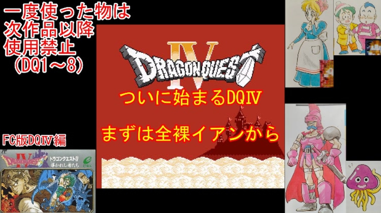 DQⅣの1周目、FCDQⅣ編part1です。<br>ついに天空編のⅣが始まります。<br>章形式になった結果、まずは装備がない全裸イアンが最初から苦労します。<br><br><br>前→<a href="https://www.nicovideo.jp/watch/sm45533675" class="watch">sm45533675</a><br>次→<a href="https://www.nicovideo.jp/watch/sm45594905" class="watch">sm45594905</a><br><br>YouTube版→<a href="https://youtu.be/HXnT8gxkwvs" target="_blank" rel="noopener nofollow">https://youtu.be/HXnT8gxkwvs</a><br><br>縛りルール(詳細はpart1参照)<br>①一度使った武器・防具・装飾品・道具・呪文・特技は<br> 次作品以降使用禁止。(売却も解禁扱い)<br><br> 一度使った職業(3,6,7)・仲間モンスター(5,6)・スカウトモンスター(8)は<br> 戦士(Ⅲ)、戦士(Ⅵ)のようにナンバリングで分類し次作品以降使用禁止。<br> また複数体加入できる仲間モンスターは一体まで。<br><br>②裏技、バグ技、全滅、逃走、おどかす禁止。<br> またダンジョン攻略とボス戦における状況再現禁止。<br><br>③ダンジョンとボス攻略は、全キャラのレベルを突入時、<br> 1周目は目標レベル+5。2周目は+10。3周目は+15まで。<br> ラスボスの目標レベルは45。裏ボスは50とする。<br>(目標レベルは各公式ガイドブックを参照)<br><br>④1周目はEDまで。2周目は裏ボス撃破まで。<br> 3周目は全てのボスを規定回数、規定ターン以内に倒す。<br>(回避可能なボスも倒し、闇ゾーマは3周全てで倒す)<br><br><br><span style="color: #262626;">※一部機種は互換機を使用してのプレイとなりますが、倍速機能やクイックセーブ・ロード、チートなどは一切使用しません。</span><br><br>※ネタバレ注意です<br><br>この動画で利用している株式会社スクウェア・エニックスを代表とする共同著作者が権利を所有する著作物及びスギヤマ工房有限会社が権利を所有する楽曲の転載・配布は禁止いたします。<br>(C) ARMOR PROJECT/BIRD STUDIO/SQUARE ENIX All Rights Reserved.<br>(C) SUGIYAMA KOBO (P) SUGIYAMA KOBO<br><br>AquesTalk2ライセンスID:AQTK2WINUSR23122185<br /><br><br>❤いいねを押していただけるとモチベーションと投稿速度が上がるので宜しくお願い致します!<br><br>作者ツイッター→ <a href="https://twitter.com/nig0117" target="_blank" rel="noopener nofollow">https://twitter.com/nig0117</a><br>PIXIV FANBOX→ <a href="https://sutanokeiji.fanbox.cc/" target="_blank" rel="noopener nofollow">https://sutanokeiji.fanbox.cc/</a><br><br>( 以前はWEB小説書いてました→ <a href="https://kakuyomu.jp/works/1177354054884910267" target="_blank" rel="noopener nofollow">https://kakuyomu.jp/works/1177354054884910267</a> )