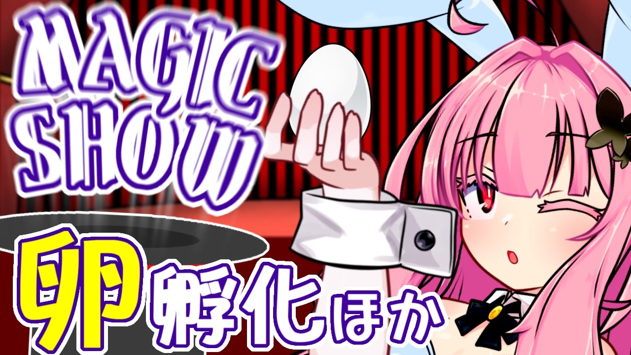 今日は卵を使ったマジックを披露する茜ちゃん。<br>解説もありますのでキミも早速試してみよう!<br><br>いいね欄には今回使ったアニメーション効果「弾む」の、1周期の求め方を載せました。<br>知っておくとほかの動作と同期させたい時などに役に立つかもしれません<br><br>マジックショーシリーズは原石祭以降からは1~2週に1回の投稿を目指していますが、来週は他投稿祭に参加予定のためお休みします<br><br>過去イチ絵面がヤバい回(風船飲み)<br><a href="https://www.nicovideo.jp/watch/sm45014463" class="watch">sm45014463</a><br><br>過去イチ絵面がヤバい回に誘導した回(トランプ)<br><a href="https://www.nicovideo.jp/watch/sm45523966" class="watch">sm45523966</a><br><br>偶然にも同じ卵素材を使っていた劇場動画(卵かニワトリか)<br><a href="https://www.nicovideo.jp/watch/sm45500451" class="watch">sm45500451</a><br><br>【使用音声合成ソフト】<br>VOICEROID2:琴葉姉妹<br>VOICEPEAK:東北きりたん<br>【立ち絵】<br>琴葉茜、手:ぴぴ様 <a href="https://seiga.nicovideo.jp/seiga/im11484646" target="_blank" rel="noopener">im11484646</a><br>琴葉葵、各種漫符:Noname様 <a href="https://seiga.nicovideo.jp/seiga/im8015257" target="_blank" rel="noopener">im8015257</a><br>東北きりたん:りょうご様 <a href="https://seiga.nicovideo.jp/seiga/im11119649" target="_blank" rel="noopener">im11119649</a><br>【素材】<br>シルクハット:?箱様 <a href="https://commons.nicovideo.jp/works/nc99777" target="_blank" rel="noopener">nc99777</a><br>背景:RεïзN様 <a href="https://commons.nicovideo.jp/works/nc232424" target="_blank" rel="noopener">nc232424</a><br>机:華音3R様 <a href="https://commons.nicovideo.jp/works/nc221400" target="_blank" rel="noopener">nc221400</a><br>吹き出し、いいねボタン、卵、ひよこちゃん:フリー素材あそび様 <a href="https://commons.nicovideo.jp/works/nc360071" target="_blank" rel="noopener">nc360071</a> <a href="https://commons.nicovideo.jp/works/nc293334" target="_blank" rel="noopener">nc293334</a> <a href="https://commons.nicovideo.jp/works/nc256597" target="_blank" rel="noopener">nc256597</a> <a href="https://commons.nicovideo.jp/works/nc256598" target="_blank" rel="noopener">nc256598</a><br>【BGM】<br>ワツィ@フリーBGM「ガレトコ」様 <a href="https://commons.nicovideo.jp/works/nc285919" target="_blank" rel="noopener">nc285919</a><br>【効果音】<br>効果音ラボ様 <a href="https://soundeffect-lab.info/" target="_blank" rel="noopener nofollow">https://soundeffect-lab.info/</a>