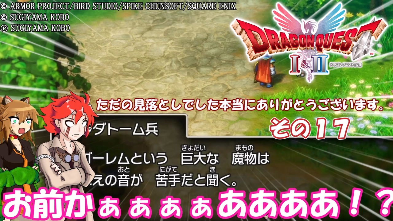 この動画はドラゴンクエストI&II<br>の実況プレイ動画となります。<br><br>難易度:いばらの道だぜ!<br><br>ネコ耳縛り?知らない子ですね・・・。<br><br><span style="font-size: 18px;"><strong>※シナリオに関わるネタバレあり。ご注意ください。</strong></span><br>(動画投稿ガイドラインより)<br><br>この動画で利用している株式会社スクウェア・エニックスを代表とする共同著作者が権利を所有する著作物及びスギヤマ工房有限会社が権利を所有する楽曲の転載・配布は禁止いたします。<br>© ARMOR PROJECT/BIRD STUDIO/SPIKE CHUNSOFT/SQUARE ENIX<br>© SUGIYAMA KOBO<br>℗ SUGIYAMA KOBO<br><br><a href="https://www.nicovideo.jp/watch/sm45596409" class="watch">sm45596409</a> ← 前 次→ そのうち<br>マイリスト → <a href="https://www.nicovideo.jp/mylist/77305494" target="_blank" rel="noopener">mylist/77305494</a><br>その1リスト → <a href="https://www.nicovideo.jp/mylist/58364125" target="_blank" rel="noopener">mylist/58364125</a><br><br>※使用Voice(及び配役)<br>VOICEVOX:春日部つむぎ(ネコ耳) 青山龍星(ドラムカン) 九州そら(山城) 雨晴はう(妖夢)<br>立ち絵:ネコ耳・ドラムカン(470/43様より頂きました)
