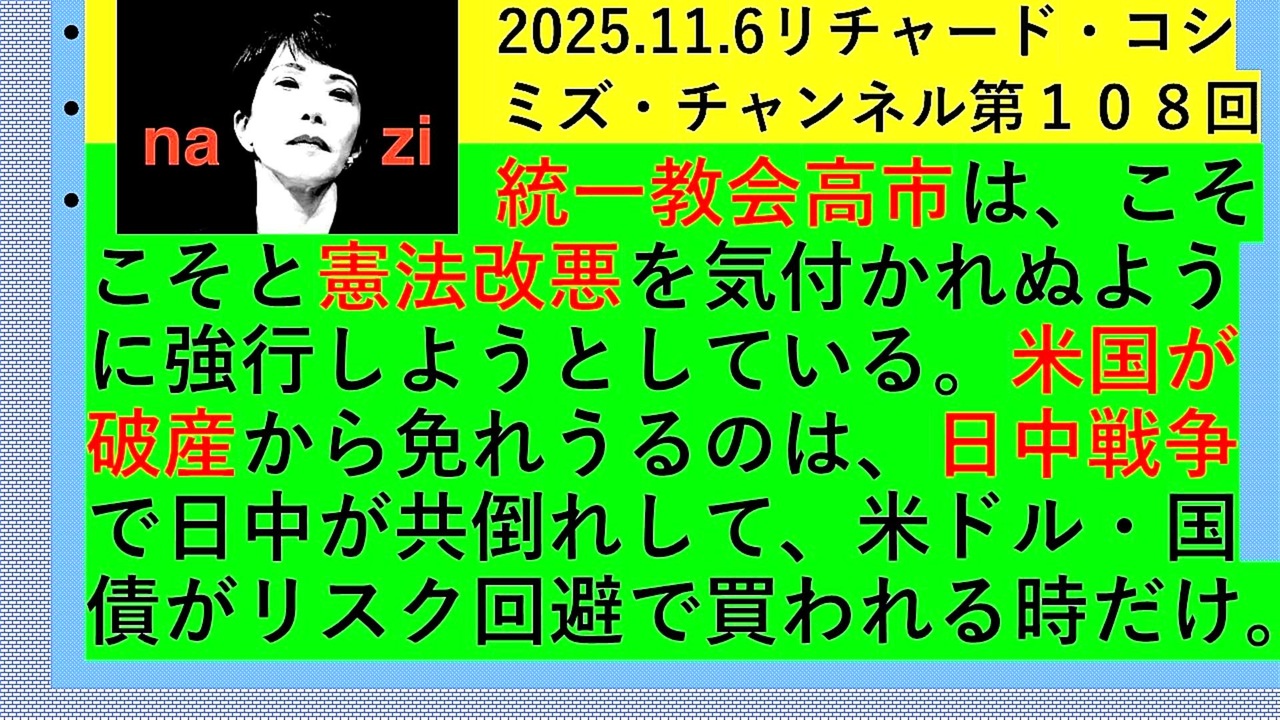 <span style="color: #cc0000;"><strong>◐『「 リチャード・コシミズ・チャンネル 」⦅ 第108回放送 ⦆①⦅ 改良版 ⦆』</strong></span><br><br> <span style="color: #ff0000;"><strong>「『 統一教会・高市早苗 』は、こそこそと『 憲法改悪 』を『 気付かれぬ 』ように『 強行 』しようとしている。『 米国 』が『 破産 』から<br> 『 免れうる 』のは、『 日中戦争 』で『 日中 』が『 共倒れ 』して、『 米ドル 』・『 国債 』が『 リスク回避 』で『 買われる時 』だけ 」</strong></span><br><br> <span style="color: #38761d;"><strong>◐『 リチャード・コシミズ・チャンネル</strong></span><span style="color: #ff0000;"><strong>⦅ ニコニコ チャンネル ⦆</strong></span><span style="color: #38761d;"><strong>』</strong></span><br> <span style="color: #0000ff;"><strong><a href="https://ch.nicovideo.jp/richardkoshimizu" target="_blank" rel="noopener nofollow">https://ch.nicovideo.jp/richardkoshimizu</a></strong></span><br><br> <span style="color: #38761d;"><strong>◐『 リチャード・コシミズ</strong></span><span style="color: #ff0000;"><strong>「 ニコニコ生放送⦅ LIVE ⦆」</strong></span><span style="color: #38761d;"><strong>』</strong></span><br> <span style="color: #0000ff;"><strong><a href="https://www.nicovideo.jp/user/120930363/live_programs" target="_blank" rel="noopener nofollow">https://www.nicovideo.jp/user/120930363/live_programs</a></strong></span><br><br>