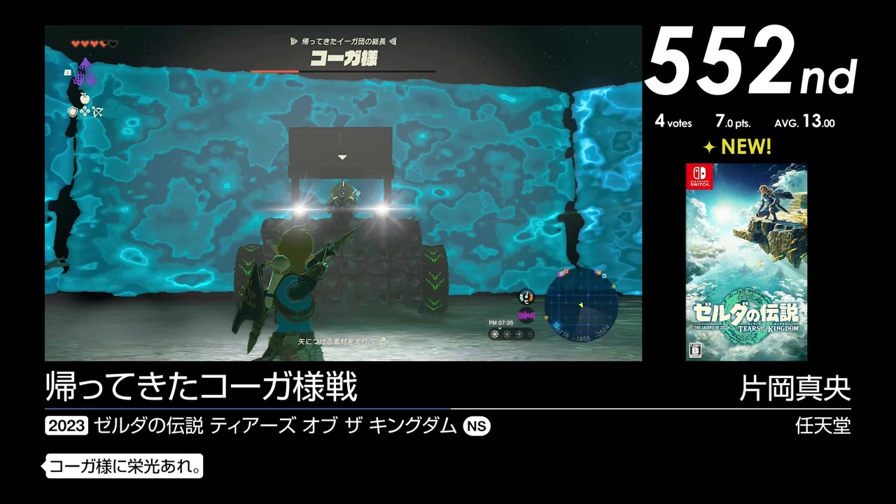 576位~551位の26曲を収録。<br><br>2024年6月11日~2024年8月1日で行われた「第17回みんなで決めるゲーム音楽ベスト100」の投票結果動画です。集計人≠動画制作者<br>PS2やGCはレトロ機じゃないだろといつも思っている(発売からおよそ四半世紀経っていることを受け入れられていないだけ)<br><br><a href="https://www.nicovideo.jp/watch/sm45573164" class="watch">sm45573164</a>←前 次→<a href="https://www.nicovideo.jp/watch/sm45625603" class="watch">sm45625603</a><br><a href="https://www.nicovideo.jp/mylist/78315745" target="_blank" rel="noopener">mylist/78315745</a> <a href="https://www.nicovideo.jp/series/523562" target="_blank" rel="noopener">series/523562</a><br><br>576位 <a href="#" class="seekTime" data-seekTime="0:40" onclick="seekNicoPlayer('#0:40'); return false;">#0:40</a> / 575位 <a href="#" class="seekTime" data-seekTime="3:04" onclick="seekNicoPlayer('#3:04'); return false;">#3:04</a> / 574位 <a href="#" class="seekTime" data-seekTime="8:09" onclick="seekNicoPlayer('#8:09'); return false;">#8:09</a> / 572位 <a href="#" class="seekTime" data-seekTime="10:39" onclick="seekNicoPlayer('#10:39'); return false;">#10:39</a>, <a href="#" class="seekTime" data-seekTime="15:10" onclick="seekNicoPlayer('#15:10'); return false;">#15:10</a> / 570位 <a href="#" class="seekTime" data-seekTime="17:51" onclick="seekNicoPlayer('#17:51'); return false;">#17:51</a>, <a href="#" class="seekTime" data-seekTime="19:32" onclick="seekNicoPlayer('#19:32'); return false;">#19:32</a> / 566位 <a href="#" class="seekTime" data-seekTime="22:22" onclick="seekNicoPlayer('#22:22'); return false;">#22:22</a>, <a href="#" class="seekTime" data-seekTime="24:44" onclick="seekNicoPlayer('#24:44'); return false;">#24:44</a>, <a href="#" class="seekTime" data-seekTime="27:52" onclick="seekNicoPlayer('#27:52'); return false;">#27:52</a>, <a href="#" class="seekTime" data-seekTime="31:06" onclick="seekNicoPlayer('#31:06'); return false;">#31:06</a> / 565位 <a href="#" class="seekTime" data-seekTime="35:10" onclick="seekNicoPlayer('#35:10'); return false;">#35:10</a> / 564位 <a href="#" class="seekTime" data-seekTime="38:29" onclick="seekNicoPlayer('#38:29'); return false;">#38:29</a> / 562位 <a href="#" class="seekTime" data-seekTime="42:17" onclick="seekNicoPlayer('#42:17'); return false;">#42:17</a>, <a href="#" class="seekTime" data-seekTime="44:32" onclick="seekNicoPlayer('#44:32'); return false;">#44:32</a> / 561位 <a href="#" class="seekTime" data-seekTime="46:57" onclick="seekNicoPlayer('#46:57'); return false;">#46:57</a> / 559位 <a href="#" class="seekTime" data-seekTime="48:42" onclick="seekNicoPlayer('#48:42'); return false;">#48:42</a>, <a href="#" class="seekTime" data-seekTime="51:21" onclick="seekNicoPlayer('#51:21'); return false;">#51:21</a> / 557位 <a href="#" class="seekTime" data-seekTime="56:26" onclick="seekNicoPlayer('#56:26'); return false;">#56:26</a>, <a href="#" class="seekTime" data-seekTime="58:09" onclick="seekNicoPlayer('#58:09'); return false;">#58:09</a> / 556位 <a href="#" class="seekTime" data-seekTime="60:30" onclick="seekNicoPlayer('#60:30'); return false;">#60:30</a> / 555位 <a href="#" class="seekTime" data-seekTime="64:15" onclick="seekNicoPlayer('#64:15'); return false;">#64:15</a> / 554位 <a href="#" class="seekTime" data-seekTime="67:35" onclick="seekNicoPlayer('#67:35'); return false;">#67:35</a> / 553位 <a href="#" class="seekTime" data-seekTime="70:47" onclick="seekNicoPlayer('#70:47'); return false;">#70:47</a> / 552位 <a href="#" class="seekTime" data-seekTime="72:33" onclick="seekNicoPlayer('#72:33'); return false;">#72:33</a> / 551位 <a href="#" class="seekTime" data-seekTime="74:36" onclick="seekNicoPlayer('#74:36'); return false;">#74:36</a><br><br>----------<br><br>スクリーンショット募集中!詳細はこちら↓<br><a href="https://gamemusic17.vercel.app/" target="_blank" rel="noopener nofollow">https://gamemusic17.vercel.app/</a><br><br>結果詳細↓<br><a href="https://w.atwiki.jp/gamemusicbest100/pages/10538.html" target="_blank" rel="noopener nofollow">https://w.atwiki.jp/gamemusicbest100/pages/10538.html</a><br /><br>----------<br><br>第2回みんなで決める和風曲ランキング 2/28まで投票受付中!<br><a href="https://jbbs.shitaraba.net/bbs/read.cgi/music/25545/1764514793/" target="_blank" rel="noopener nofollow">https://jbbs.shitaraba.net/bbs/read.cgi/music/25545/1764514793/</a><br><br>みんなで決める2025年の新曲ゲーム音楽ランキング 3/31まで投票受付中!<br><a href="https://jbbs.shitaraba.net/bbs/read.cgi/music/25545/1769870472/" target="_blank" rel="noopener nofollow">https://jbbs.shitaraba.net/bbs/read.cgi/music/25545/1769870472/</a>