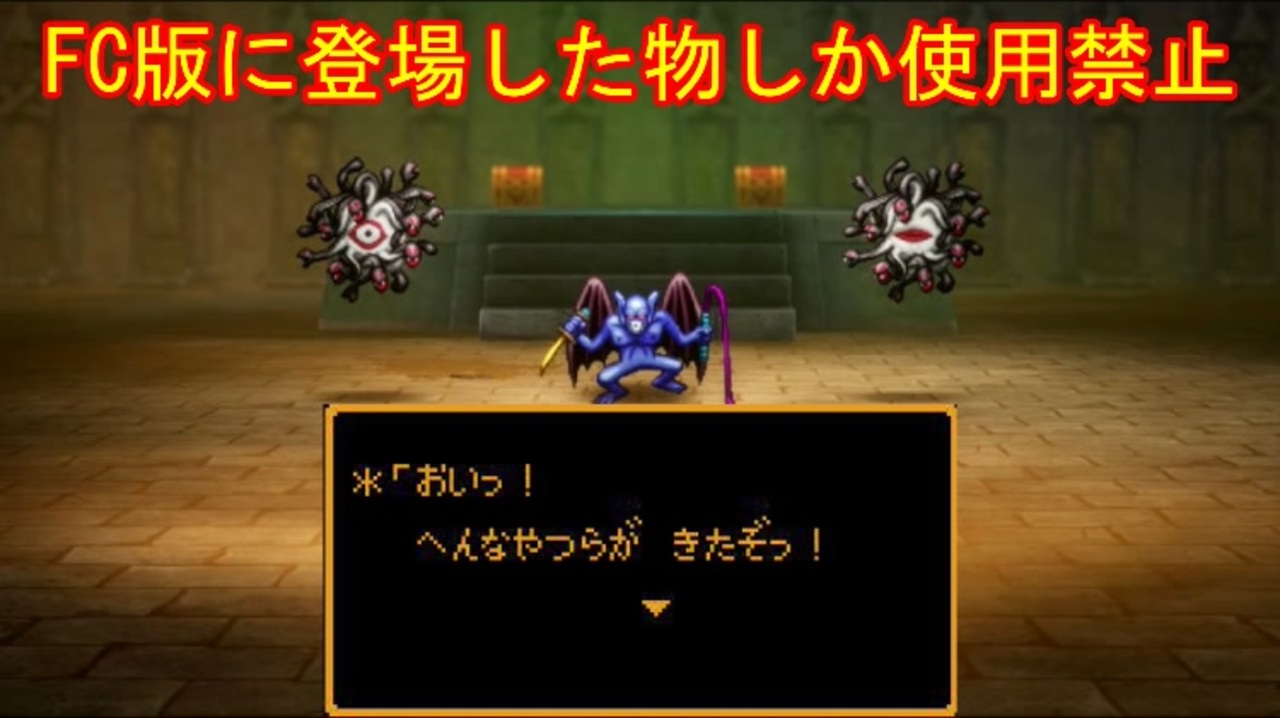 「キミ、FC版にいなかったよね?」<br>「え? あ、はあ……」<br>「禁止」<br><br>ってできたら、楽だったんだけどなあ……。<br>ちなみにマミーズアイは大辞典によると左があやしいひとみ。右がホイミ担当らしいですが、収録時はそういった情報が更新されていなかったので全然知りませんでした。<br><br><br>前→<a href="https://www.nicovideo.jp/watch/sm45601201" class="watch">sm45601201</a><br>次→<a href="https://www.nicovideo.jp/watch/sm45662445" class="watch">sm45662445</a><br>YouTube版→<a href="https://youtu.be/vWmOSCWrUbk" target="_blank" rel="noopener nofollow">https://youtu.be/vWmOSCWrUbk</a><br><br>縛りルール<br>①FC版にない武器・防具・道具・呪文・特技・職業は使用禁止。<br><br>②アイテム回収禁止。<br><br>③バトルロード禁止。<br><br>④遊び人には転職不可。<br><br>⑤めいれいさせろ固定。<br><br>⑥ふくろは使わない。<br><br>⑦上限レベルはHD2D版公式ガイドブックの目標レベル+3まで。<br><br><br>※ネタバレ注意です<br><br>この動画で利用している株式会社スクウェア・エニックスを代表とする共同著作者が権利を所有する著作物及びスギヤマ工房有限会社が権利を所有する楽曲の転載・配布は禁止いたします。<br>© ARMOR PROJECT/BIRD STUDIO/SPIKE CHUNSOFT/SQUARE ENIX<br>© SUGIYAMA KOBO<br>℗ SUGIYAMA KOBO<br><br>AquesTalk2ライセンスID:AQTK2WINUSR23122185<br /><br><br>❤いいねを押していただけるとモチベーションと投稿速度が上がるので宜しくお願い致します!<br><br>作者ツイッター→ <a href="https://twitter.com/nig0117" target="_blank" rel="noopener nofollow">https://twitter.com/nig0117</a><br>PIXIV FANBOX→ <a href="https://sutanokeiji.fanbox.cc/" target="_blank" rel="noopener nofollow">https://sutanokeiji.fanbox.cc/</a><br><br>( 以前はWEB小説書いてました→ <a href="https://kakuyomu.jp/works/1177354054884910267" target="_blank" rel="noopener nofollow">https://kakuyomu.jp/works/1177354054884910267</a> )
