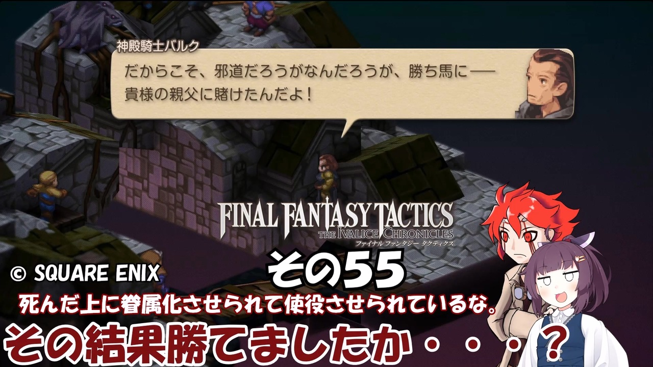 この動画はスチーム版ファイナルファンタジータクティクス イヴァリースクロニクルズの実況動画です。<br><br><br>難易度:タクティカル<br><br>※そのうち縛る縛り内容。<br>①ラムザくん 見習い戦士固定(まだいけてる)<br>②ネコ耳 斧or両手武器装備(両手持ちでもOK)<br>③ドラムカン 弓・ボウガン・銃装備<br>④きりたんです 武器攻撃禁止(たまに忘れる)<br>⑤あいちゃん 盾装備orサムラァイ<br><br><a href="https://www.nicovideo.jp/watch/sm45599922" class="watch">sm45599922</a> ← 前 次 → <a href="https://www.nicovideo.jp/watch/sm45608205" class="watch">sm45608205</a><br>マイリスト →<a href="https://www.nicovideo.jp/mylist/72149077" target="_blank" rel="noopener">mylist/72149077</a><br>その1リスト →<a href="https://www.nicovideo.jp/mylist/58364125" target="_blank" rel="noopener">mylist/58364125</a> <br><br>VOICEVOX:春日部つむぎ(ネコ耳) 玄野武宏(ラムザ・ベオルブ) 中部つるぎ(アグリアス様)<br> 青山龍星(ドラムカン) 東北きりたん(東北きりたん)<br> あいちゃん(中国うさぎ(立ち絵:akihiyo様作 立ち中国うさぎ素材 <a href="https://seiga.nicovideo.jp/seiga/im11211212" target="_blank" rel="noopener">im11211212</a>))<br>Voiceroid:東北きりたん(立ち絵:このりEX様作 東北きりたん立ち絵素材5 <a href="https://seiga.nicovideo.jp/seiga/im10819054" target="_blank" rel="noopener">im10819054</a>)<br><br>© SQUARE ENIX<br>
