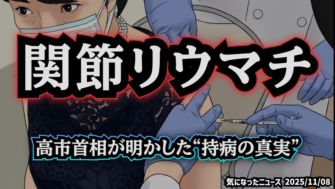 ◆関節リウマチ ~ 高市首相が明かした“持病の真実”<br><br>あらすじ<br>高市早苗首相が国会で明かした「関節リウマチ」の持病。その発言は、高額療養費制度の見直し議論の最中に飛び出したものでした。<br>一方で、彼女は過去にワクチン接種後の不調を語ったとされ、専門家とのやり取りもSNSで情報が見れます。<br>それでも首相としては「重大な懸念は認められない」との政府方針を繰り返す――。<br>果たして、これは個人の信念なのか、それとも“言わざるを得ない構造”なのか。<br>日本のワクチン政策と首相自身の病が交錯する、その静かな緊張を追います。<br><br>◆今回の台本(詳細)<a href="https://keiichiro8140.hatenablog.com/entry/25110888333999" target="_blank" rel="noopener nofollow">https://keiichiro8140.hatenablog.com/entry/25110888333999</a><br><br>◆これまでの動画<a href="https://x.gd/sPXoJ" target="_blank" rel="noopener nofollow">https://x.gd/sPXoJ</a><br><br>◆もしも(BAN)の時のためのマイリンク集<a href="https://lit.link/K16_888" target="_blank" rel="noopener nofollow">https://lit.link/K16_888</a><br><br>ご覧いただきありがとうございます<br>m(_ _)m<br>気になったニュース 2025/11/08<br><br />著作権、肖像権に配慮して作成しております。<br><br>◆気になったニュースの台本!?<br>メモ代わりに作った台本をそのままあげてます<br><a href="https://keiichiro8140.hatenablog.com/." target="_blank" rel="noopener nofollow">https://keiichiro8140.hatenablog.com/.</a><br><br><br>ここからはシリーズ紹介<br><br><br>◆ ワクチン解毒・デトックス<br><a href="https://x.gd/fZweg" target="_blank" rel="noopener nofollow">https://x.gd/fZweg</a><br><br>◆ウイリアム・マキス博士のがん治療(イベルメクチン・フェンベンダゾール等)<br><a href="https://x.gd/AtFYS" target="_blank" rel="noopener nofollow">https://x.gd/AtFYS</a><br><br>◆予防接種健康被害救済制度<br><a href="https://x.gd/0xK9x" target="_blank" rel="noopener nofollow">https://x.gd/0xK9x</a><br><br>◆気になったニュース #1501~<br><br>◆ 【ショートver】気になったニュース<br><a href="https://x.gd/7MxXC" target="_blank" rel="noopener nofollow">https://x.gd/7MxXC</a><br><br>◆ 気になったニュース #1001~<br><a href="https://x.gd/Lp8gv" target="_blank" rel="noopener nofollow">https://x.gd/Lp8gv</a><br><br>◆ 気になったニュース #501~<br><a href="https://x.gd/EmbS4" target="_blank" rel="noopener nofollow">https://x.gd/EmbS4</a><br><br>◆ 気になったニュース #1~#500<br><a href="https://x.gd/uPhNb" target="_blank" rel="noopener nofollow">https://x.gd/uPhNb</a><br><br>◆ X(旧Twitter)・テレグラムで気になった情報<br><a href="https://x.gd/YG6FT" target="_blank" rel="noopener nofollow">https://x.gd/YG6FT</a><br><br>◆ 日比谷5万人パレードデ⚪生放送アーカイブ動画<br><a href="https://x.gd/3CHJv" target="_blank" rel="noopener nofollow">https://x.gd/3CHJv</a><br><br>◆日比谷5万人パレード⚪モのマイリスト作ってみました<br><a href="https://nico.ms/mylist/76828848?ref=sp_other" target="_blank" rel="noopener nofollow">https://nico.ms/mylist/76828848?ref=sp_other</a><br><br>◆3.30 令和の百姓⚪⚪<br><a href="https://www.nicovideo.jp/series/511791?ref=garage_share_other" target="_blank" rel="noopener nofollow">https://www.nicovideo.jp/series/511791?ref=garage_share_other</a><br><br>◆ 及川幸久さんの【XNEWS】シリーズ<br><a href="https://x.gd/3k78K" target="_blank" rel="noopener nofollow">https://x.gd/3k78K</a><br><br>◆これまでの動画<a href="https://x.gd/sPXoJ" target="_blank" rel="noopener nofollow">https://x.gd/sPXoJ</a><br><br>◆もしも(BAN)の時のためのマイリンク集<a href="https://lit.link/K-16_News44" target="_blank" rel="noopener nofollow">https://lit.link/K-16_News44</a><br><br>