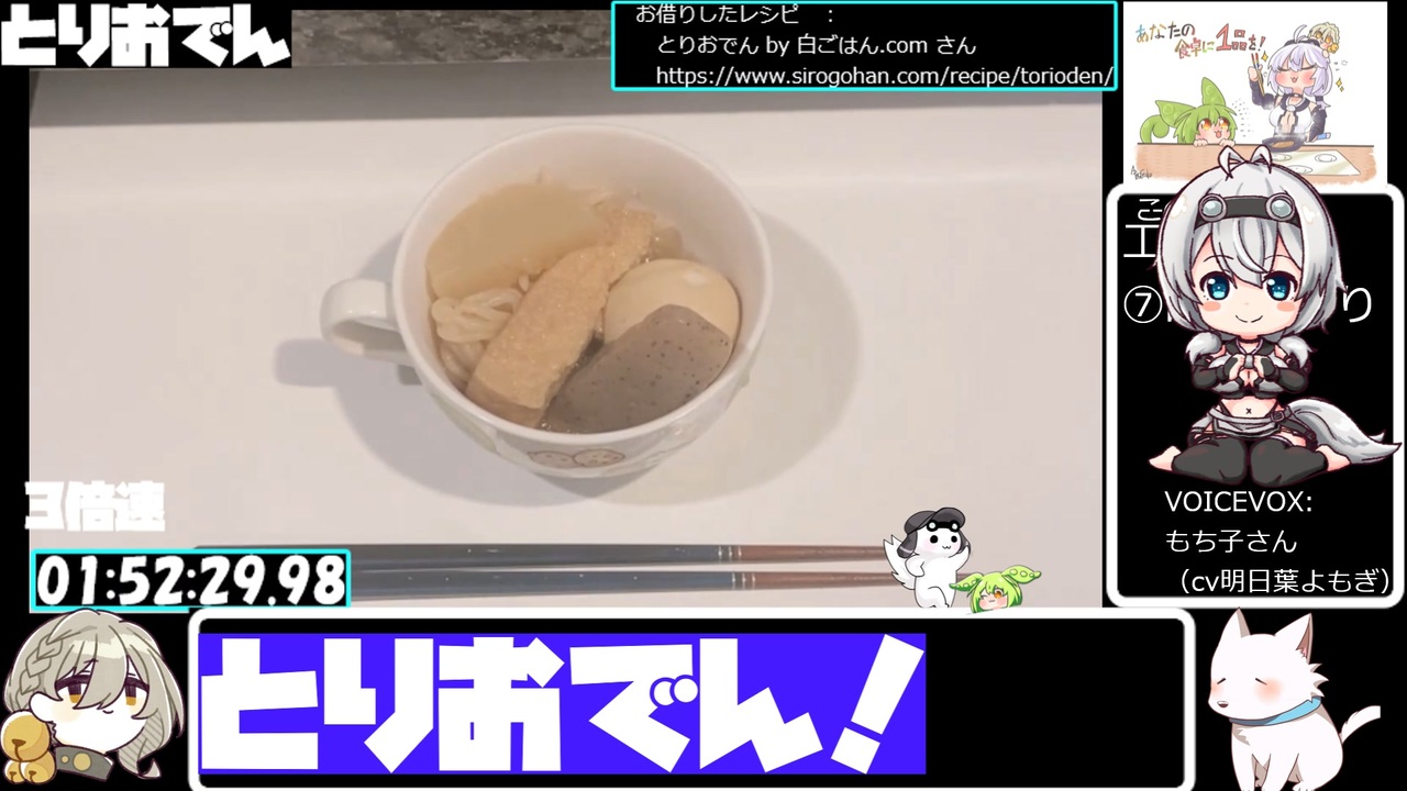料理初心者が久々に作る料理にチャレンジします!<br><br>参考にしたレシピはこちら<br> とりおでん by 白ごはん.com さん<br> <a href="https://www.sirogohan.com/recipe/torioden/" target="_blank" rel="noopener nofollow">https://www.sirogohan.com/recipe/torioden/</a><br /><br>編集に使用させていただいているものは、プロフィールみてね!<br><a href="https://www.nicovideo.jp/user/311366" target="_blank" rel="noopener nofollow">https://www.nicovideo.jp/user/311366</a><br><br>読み上げ:VOICEVOX もち子(cv明日葉よもぎ)、ずんだもん、四国めたん、青山龍星、WhiteCUL、伊織弓鶴、COEIROINK:猫米茶<br><br><strong>過去の動画にコメント、いいね!、ギフト、広告、フォロー、マイリストありがとうございました!</strong><br><br>とり料理祭ありがとうございました!<br>2023参加作品はこちら ⇒ <a href="https://www.nicovideo.jp/mylist/75430531" target="_blank" rel="noopener nofollow">https://www.nicovideo.jp/mylist/75430531</a><br>2024冬参加作品はこちら ⇒ <a href="https://www.nicovideo.jp/mylist/75862737" target="_blank" rel="noopener nofollow">https://www.nicovideo.jp/mylist/75862737</a><br>2024夏参加作品はこちら ⇒ <a href="https://www.nicovideo.jp/mylist/76572716" target="_blank" rel="noopener nofollow">https://www.nicovideo.jp/mylist/76572716</a><br>2025冬参加作品はこちら ⇒ <a href="https://www.nicovideo.jp/mylist/77171241" target="_blank" rel="noopener nofollow">https://www.nicovideo.jp/mylist/77171241</a><br>2025夏参加作品はこちら ⇒ <a href="https://www.nicovideo.jp/mylist/77600849" target="_blank" rel="noopener nofollow">https://www.nicovideo.jp/mylist/77600849</a><br><br>このその日ごとになんか出す定食屋か駄菓子屋のごとき動画を継続して投稿するために<br>スポンサーをひっそり募集しております、あなたも一口いかが?<br><a href="https://creator-support.nicovideo.jp/registration/311366" target="_blank" rel="noopener nofollow">https://creator-support.nicovideo.jp/registration/311366</a>