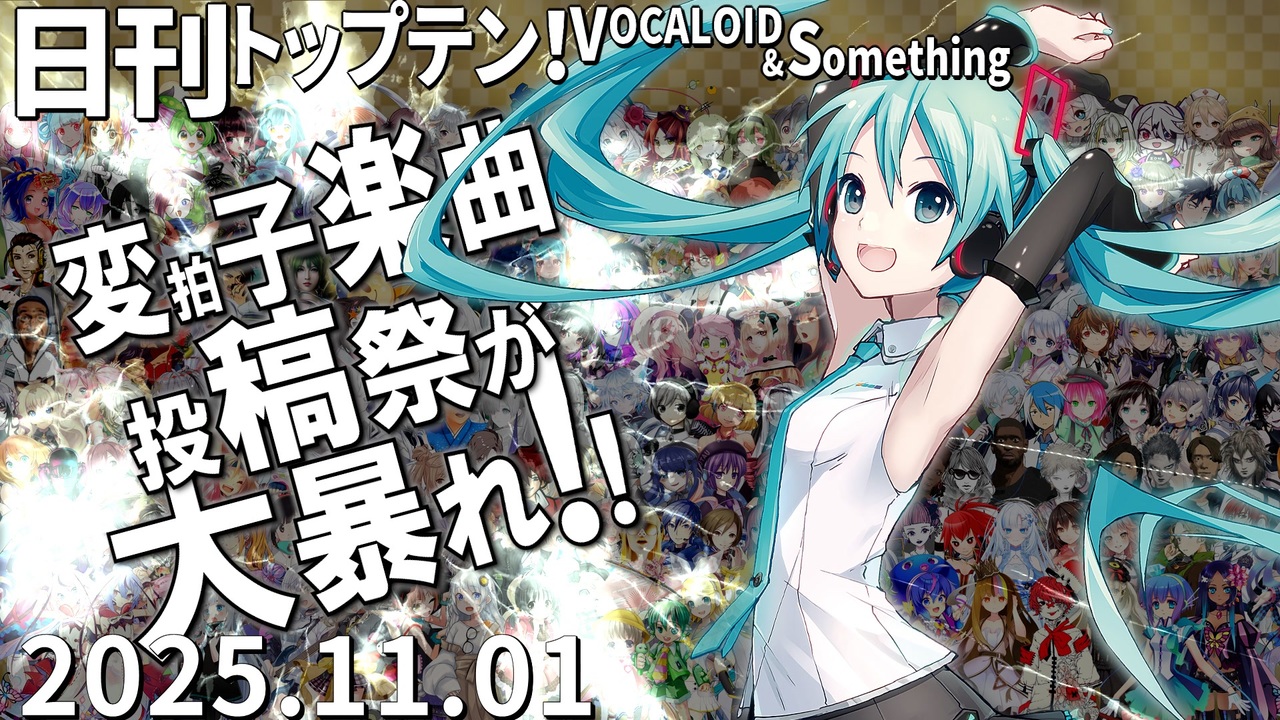 前日(10/31)←<a href="https://www.nicovideo.jp/watch/sm45609298" class="watch">sm45609298</a> <a href="https://www.nicovideo.jp/watch/sm45612403" class="watch">sm45612403</a>→翌日(11/2)<br>★Mixi2にもいます。<a href="https://mixi.social/@LUKANAN_P" target="_blank" rel="noopener nofollow">https://mixi.social/@LUKANAN_P</a><br><br>★チャプター<br>昨日1位<a href="#" class="seekTime" data-seekTime="0:00" onclick="seekNicoPlayer('#0:00'); return false;">#0:00</a> TOP10<a href="#" class="seekTime" data-seekTime="0:36" onclick="seekNicoPlayer('#0:36'); return false;">#0:36</a> 1年前<a href="#" class="seekTime" data-seekTime="2:56" onclick="seekNicoPlayer('#2:56'); return false;">#2:56</a> TOP3<a href="#" class="seekTime" data-seekTime="3:24" onclick="seekNicoPlayer('#3:24'); return false;">#3:24</a> 10年前<a href="#" class="seekTime" data-seekTime="4:55" onclick="seekNicoPlayer('#4:55'); return false;">#4:55</a> 超新着PICKUP<a href="#" class="seekTime" data-seekTime="5:23" onclick="seekNicoPlayer('#5:23'); return false;">#5:23</a> 通常PICKUP<a href="#" class="seekTime" data-seekTime="10:50" onclick="seekNicoPlayer('#10:50'); return false;">#10:50</a> <br><br>★トップテン<br>10:<a href="https://www.nicovideo.jp/watch/sm45562007" class="watch">sm45562007</a> 9:<a href="https://www.nicovideo.jp/watch/sm45551498" class="watch">sm45551498</a> 8:<a href="https://www.nicovideo.jp/watch/sm45574854" class="watch">sm45574854</a> 7:<a href="https://www.nicovideo.jp/watch/sm45562495" class="watch">sm45562495</a> <br>6:<a href="https://www.nicovideo.jp/watch/sm45548171" class="watch">sm45548171</a> 5:<a href="https://www.nicovideo.jp/watch/sm45563727" class="watch">sm45563727</a> 4:<a href="https://www.nicovideo.jp/watch/sm45573152" class="watch">sm45573152</a> 3:<a href="https://www.nicovideo.jp/watch/sm45566370" class="watch">sm45566370</a> 2:<a href="https://www.nicovideo.jp/watch/sm45566227" class="watch">sm45566227</a> 1:<a href="https://www.nicovideo.jp/watch/sm45561299" class="watch">sm45561299</a> <br><br>★ピックアップ(B~Qは超新着枠)<br>B:<a href="https://www.nicovideo.jp/watch/sm45574247" class="watch">sm45574247</a> C:<a href="https://www.nicovideo.jp/watch/sm45567948" class="watch">sm45567948</a> D:<a href="https://www.nicovideo.jp/watch/sm45571200" class="watch">sm45571200</a> E:<a href="https://www.nicovideo.jp/watch/sm45574407" class="watch">sm45574407</a> F:<a href="https://www.nicovideo.jp/watch/sm45574936" class="watch">sm45574936</a> G:<a href="https://www.nicovideo.jp/watch/sm45566117" class="watch">sm45566117</a> <br>H:<a href="https://www.nicovideo.jp/watch/sm45575996" class="watch">sm45575996</a> I:<a href="https://www.nicovideo.jp/watch/sm45571052" class="watch">sm45571052</a> J:<a href="https://www.nicovideo.jp/watch/sm45574571" class="watch">sm45574571</a> K:<a href="https://www.nicovideo.jp/watch/sm45467653" class="watch">sm45467653</a> L:<a href="https://www.nicovideo.jp/watch/sm45575958" class="watch">sm45575958</a> M:<a href="https://www.nicovideo.jp/watch/sm45574908" class="watch">sm45574908</a> <br>N:<a href="https://www.nicovideo.jp/watch/sm45568912" class="watch">sm45568912</a> O:<a href="https://www.nicovideo.jp/watch/sm45574449" class="watch">sm45574449</a> P:<a href="https://www.nicovideo.jp/watch/sm45563419" class="watch">sm45563419</a> Q:<a href="https://www.nicovideo.jp/watch/sm45569485" class="watch">sm45569485</a> R:<a href="https://www.nicovideo.jp/watch/sm45551600" class="watch">sm45551600</a> S:<a href="https://www.nicovideo.jp/watch/sm45551874" class="watch">sm45551874</a> <br>T:<a href="https://www.nicovideo.jp/watch/sm45556794" class="watch">sm45556794</a> U:<a href="https://www.nicovideo.jp/watch/sm45551153" class="watch">sm45551153</a> <br><br>★プレイバック <br>A(1年前):<a href="https://www.nicovideo.jp/watch/sm44274650" class="watch">sm44274650</a> 十(10年前):<a href="https://www.nicovideo.jp/watch/sm27497499" class="watch">sm27497499</a> 前日の第1位: <a href="https://www.nicovideo.jp/watch/sm45571742" class="watch">sm45571742</a>(初音ミク)<br><br>☆集計対象:2025/10/25~11/1 5時投稿の作品(11/1 5時集計)<br>★計算式:再生×1+コメント×最大12+いいね!×15+マイリスト×13<br>☆プレイリスト:<u><a href="https://nikkantop10.hatenablog.com/entry/ar20251101" target="_blank" rel="noopener nofollow">https://nikkantop10.hatenablog.com/entry/ar20251101</a></u> 、 <a href="https://www.nicovideo.jp/mylist/49271984" target="_blank" rel="noopener">mylist/49271984</a> <br>★1年前トップテン:<a href="https://www.nicovideo.jp/watch/sm44282071" class="watch">sm44282071</a><br />★日刊トップテン動画一覧マイリスト:<a href="https://www.nicovideo.jp/mylist/47849908" target="_blank" rel="noopener">mylist/47849908</a><br>☆ルールや計算式の詳細:<a href="https://nikkantop10-sub.hatenablog.com/entry/top10_rule" target="_blank" rel="noopener nofollow">https://nikkantop10-sub.hatenablog.com/entry/top10_rule</a><br><span style="color: #262626;">★K!!te Playlist LINK!:<a href="https://kiite.jp/user/AIST_playlist_bot" target="_blank" rel="noopener nofollow">https://kiite.jp/user/AIST_playlist_bot</a><br>☆Twitter:<a href="https://twitter.com/VOCALO_NEWRANK" target="_blank" rel="noopener nofollow">https://twitter.com/VOCALO_NEWRANK</a><br>★Thread:<a href="https://www.threads.net/@lukanan_p" target="_blank" rel="noopener nofollow">https://www.threads.net/@lukanan_p</a></span><br><br><span style="color: #0000ff;"><strong>◆今後の動画投稿イベント情報</strong></span><br>2025/12/29~31 <strong>先端映像音楽表現投稿祭</strong> <a href="https://twipla.jp/events/678401" target="_blank" rel="noopener nofollow">https://twipla.jp/events/678401</a><br>2026/1/1~4 <strong>ボカロサビ投稿祭2026 </strong><a href="https://twipla.jp/events/705936" target="_blank" rel="noopener nofollow">https://twipla.jp/events/705936</a> ※既存曲