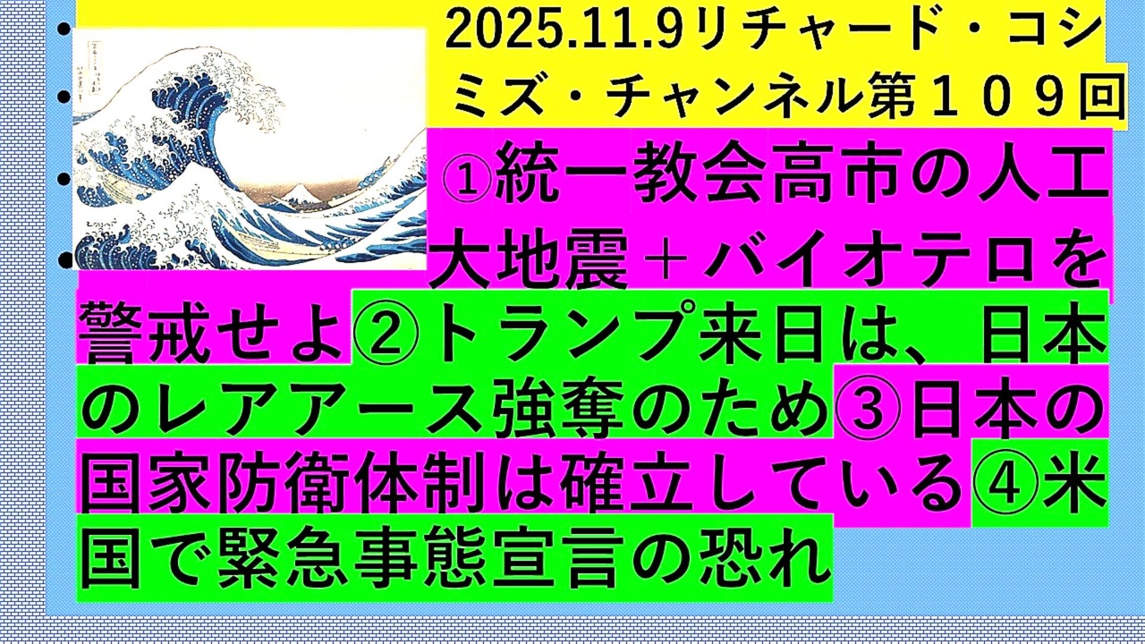 <span style="color: #cc0000;"><strong>◐『「 リチャード・コシミズ・チャンネル 」⦅ 第109回放送 ⦆⦅ 改良版 ⦆』</strong></span><br><br> <span style="color: #ff0000;"><strong>「 ① .『 統一教会・高市早苗 』の『 人工大地震 』+『 バイオテロ 』を『 警戒 』せよ。② .『 トランプ来日 』は 、『 日本 』の『 レアアース強奪 』のため。③ .『 日本 』の『 国家防衛体制 』は『 確立 』している。④ .『 米国 』で『 緊急事態宣言 』の『 恐れ 』」</strong></span><br><br> <span style="color: #38761d;"><strong>◐『 リチャード・コシミズ・チャンネル</strong></span><span style="color: #ff0000;"><strong>⦅ ニコニコ チャンネル ⦆</strong></span><span style="color: #38761d;"><strong>』</strong></span><br> <span style="color: #0000ff;"><strong><a href="https://ch.nicovideo.jp/richardkoshimizu" target="_blank" rel="noopener nofollow">https://ch.nicovideo.jp/richardkoshimizu</a></strong></span><br><br> <span style="color: #38761d;"><strong>◐『「 リチャード・コシミズ 講演会 」</strong></span><span style="color: #ff0000;"><strong>公式「 動画ギャラリー 」⦅ 最新動画 ⦆⦅ YouTube版 ⦆</strong></span><span style="color: #38761d;"><strong>』</strong></span><br> <span style="color: #0000ff;"><strong> <a href="https://www.youtube.com/@richardkoshimizu-video-gallery" target="_blank" rel="noopener nofollow">https://www.youtube.com/@richardkoshimizu-video-gallery</a></strong></span><br>