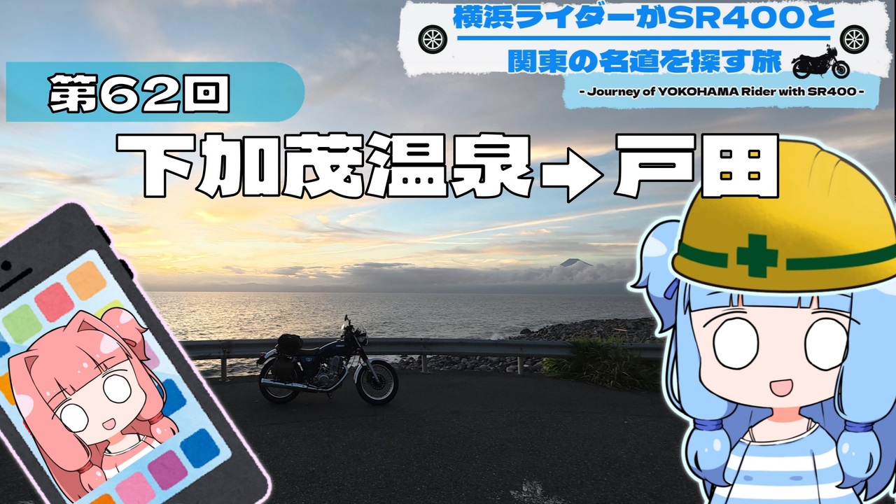 皆さまこんにちは。でぃーごです。<br>真夏の伊豆巡り後編、今回は西伊豆を巡ります。<br>涼しくなるまで温泉施設でくつろいでから、夕日を眺めに出発です。<br>天気は晴れ。富士山くっきり。落日までの時間もたっぷり。勝ったなガハハ!<br><br><br>今回の立ち寄りスポット(Google Map):<br>■下賀茂温泉 銀の湯会館:<br><a href="https://maps.app.goo.gl/ZHEMMDLC2DteMzLP7" target="_blank" rel="noopener nofollow">https://maps.app.goo.gl/ZHEMMDLC2DteMzLP7</a><br><br>■扇屋製菓:<br><a href="https://maps.app.goo.gl/9wNvwKCgHuSAtHN9A" target="_blank" rel="noopener nofollow">https://maps.app.goo.gl/9wNvwKCgHuSAtHN9A</a><br><br>■石部の棚田:<br><a href="https://maps.app.goo.gl/CEdUKAZ9w39yKgTaA" target="_blank" rel="noopener nofollow">https://maps.app.goo.gl/CEdUKAZ9w39yKgTaA</a><br><br>■堂ヶ島公園:<br><a href="https://maps.app.goo.gl/Wsam4fvWmKW4QSH3A" target="_blank" rel="noopener nofollow">https://maps.app.goo.gl/Wsam4fvWmKW4QSH3A</a><br><br>■西天城高原:<br><a href="https://maps.app.goo.gl/pWZpRQkBR7trjtGx8" target="_blank" rel="noopener nofollow">https://maps.app.goo.gl/pWZpRQkBR7trjtGx8</a><br><br>■潮風のベンチ碑:<br><a href="https://maps.app.goo.gl/QX2eLMQLHZukKXAf7" target="_blank" rel="noopener nofollow">https://maps.app.goo.gl/QX2eLMQLHZukKXAf7</a><br><br><br><br>前回(第61回):<a href="https://www.nicovideo.jp/watch/sm45598599" target="_blank" rel="noopener nofollow">https://www.nicovideo.jp/watch/sm45598599</a><br><br>次回(第63回):<a href="https://www.nicovideo.jp/watch/sm45648092" target="_blank" rel="noopener nofollow">https://www.nicovideo.jp/watch/sm45648092</a><br><br /><br><br><strong>※動画中のブレーキ音(キーっという音)について<br> SR400では、ダストや湿気の影響により、リアドラムブレーキの鳴きがよく発生します。<br> 制動・安全面に問題はありませんので、ご安心ください⛑️</strong><br><br>★旅の記録(マイマップ):<br><a href="https://www.google.com/maps/d/u/0/edit?mid=1p4buVBeW28-PViCUlkDPFQ4ogu1G2vg&usp=sharing" target="_blank" rel="noopener nofollow">https://www.google.com/maps/d/u/0/edit?mid=1p4buVBeW28-PViCUlkDPFQ4ogu1G2vg&usp=sharing</a><br><br>★第23回以降、本編のBGMに「ソルフェジオ周波数(528Hz)」を含む、蒲鉾さちこさんの「Fancy Pop(Track 3)」を使用しています。視聴ページ(DOVA-SYNDROME):<br><a href="https://dova-s.jp/bgm/play17438.html" target="_blank" rel="noopener nofollow">https://dova-s.jp/bgm/play17438.html</a><br><br>ソルフェジオ周波数って何ぞ?と気になった方は調べてみてください(`・ω・´)(丸投げ)<br>癒し効果があるとかないとか<br><br><a target="_blank" href="https://qa.nicovideo.jp/faq/show/19424?site_domain=default" style="font-size: 13px;color: #657586; text-decoration: underline; line-height: 1.4">この動画は投稿者によって修正されました</a>