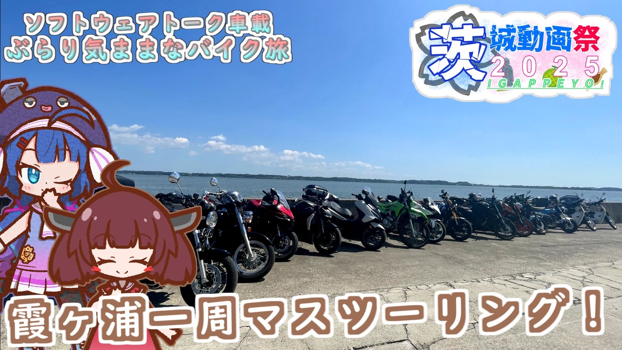 ・告知動画<br>「茨城動画祭2025告知動画」syageki 様 (<a href="https://www.nicovideo.jp/watch/sm44892649" class="watch">sm44892649</a>)<br><br>・一緒に走ってくださった車載主様<br>雪華 様 (<a href="https://www.nicovideo.jp/user/15363671" target="_blank" rel="noopener">user/15363671</a>)<br>ゆきだるま 様 (<a href="https://www.nicovideo.jp/user/90956732" target="_blank" rel="noopener">user/90956732</a>)<br>ABBA 様 (<a href="https://www.nicovideo.jp/user/53840440" target="_blank" rel="noopener">user/53840440</a>)<br>だわ(終わった人) 様 (<a href="https://www.nicovideo.jp/user/440220" target="_blank" rel="noopener">user/440220</a>)<br>山上りすこ 様 (<a href="https://www.nicovideo.jp/user/130380191" target="_blank" rel="noopener">user/130380191</a>)<br>雪波 様 (<a href="https://www.nicovideo.jp/user/79373653" target="_blank" rel="noopener">user/79373653</a>)<br>IGOMAS 様 (<a href="https://www.nicovideo.jp/user/34814877" target="_blank" rel="noopener">user/34814877</a>)<br>レイ 様 (<a href="https://www.nicovideo.jp/user/27195384" target="_blank" rel="noopener">user/27195384</a>)<br>タロウNC 様 (<a href="https://www.nicovideo.jp/user/12498749" target="_blank" rel="noopener">user/12498749</a>)<br>暴力 様 (<a href="https://www.nicovideo.jp/user/85003236" target="_blank" rel="noopener">user/85003236</a>)<br>スマル 様 (<a href="https://www.nicovideo.jp/user/31234342" target="_blank" rel="noopener">user/31234342</a>)<br>湊(みなと) 様 (<a href="https://www.nicovideo.jp/user/383044" target="_blank" rel="noopener">user/383044</a>)<br>yamakiyo 様 (<a href="https://www.nicovideo.jp/user/3098460" target="_blank" rel="noopener">user/3098460</a>)<br><br>・使用ソフト<br>AviUtl (<a href="https://seiga.nicovideo.jp/seiga/im1696493" target="_blank" rel="noopener">im1696493</a>)<br>PSDToolKit<br>VOICEROID2 音街ウナ<br>VOICEROID+ 東北きりたん EX<br><br>・乗り物<br>CB1300SF<br><br>・撮影機器<br>GoPro HERO11 Black CHDHX-111-FW<br><br>・立ち絵<br>「音街ウナ立ち絵素材」ソラベー 様 (<a href="https://seiga.nicovideo.jp/seiga/im10898260" target="_blank" rel="noopener">im10898260</a>)<br>「東北きりたん 立ち絵素材」ソラベー 様 (<a href="https://seiga.nicovideo.jp/seiga/im10705379" target="_blank" rel="noopener">im10705379</a>)<br><br>・BGM<br>「Morning」しゃろう 様 (<a href="https://commons.nicovideo.jp/works/nc98117" target="_blank" rel="noopener">nc98117</a>)<br>「夏色ビードロ」まんぼう二等兵 様 (<a href="https://commons.nicovideo.jp/works/nc142027" target="_blank" rel="noopener">nc142027</a>)<br>「カナリアスキップ」まんぼう二等兵 様 (<a href="https://commons.nicovideo.jp/works/nc163920" target="_blank" rel="noopener">nc163920</a>)<br><br>・ロゴ画像<br>「茨城動画祭2025公式ロゴ(枠なし)」syageki 様 (<a href="https://seiga.nicovideo.jp/seiga/im11597344" target="_blank" rel="noopener">im11597344</a>)