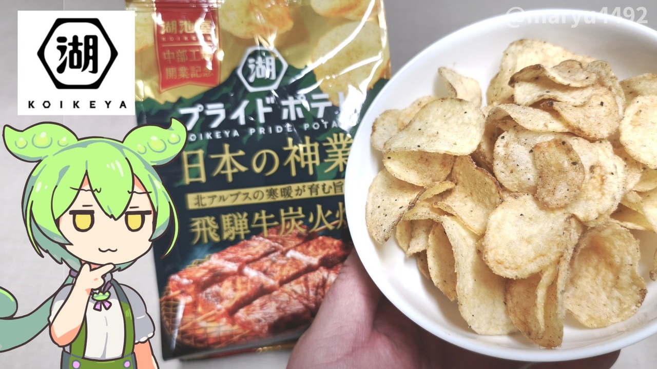 岐阜県海津市に出来た、湖池屋の中部工場開業を記念して<br>「湖池屋プライドポテト 日本の神業 飛騨牛炭火焼」が<br>11月3日からコンビニ先行発売<br>11月10日より食品スーパーなどで販売されています。<br>どんな味なのでしょうか?<br><br><br>【関連動画】<br>【岐阜県ニュース】岐阜県海津市に湖池屋の新工場がやってくる!2024.03.25<br><a href="https://www.nicovideo.jp/watch/sm43573732" target="_blank" rel="noopener nofollow">https://www.nicovideo.jp/watch/sm43573732</a><br>ロピアのすぐ近くにある「トミダヤ宿地店」に行ってきた 2025.02.22<br><a href="https://www.nicovideo.jp/watch/sm44675569" target="_blank" rel="noopener nofollow">https://www.nicovideo.jp/watch/sm44675569</a><br>ワゴンセール品!UAEからの輸入品、トップバリュの<br>「グルメポテトチップス(オリジナルフレンチチーズ風味)」2025.04.17<br><a href="https://www.nicovideo.jp/watch/sm44877903" target="_blank" rel="noopener nofollow">https://www.nicovideo.jp/watch/sm44877903</a><br><br>【参考】<br>【「湖池屋 中部工場」開業記念商品】<br>「湖池屋プライドポテト 日本の神業 飛騨牛炭火焼」新登場 2025.11.04(湖池屋)<br><a href="https://koikeya.co.jp/news/detail/1754.html" target="_blank" rel="noopener nofollow">https://koikeya.co.jp/news/detail/1754.html</a><br>海津市長インスタグラム 2025.11.04<br><a href="https://www.instagram.com/p/DQoYbtQEyhq/?img_index=1" target="_blank" rel="noopener nofollow">https://www.instagram.com/p/DQoYbtQEyhq/?img_index=1</a><br>湖池屋が岐阜県海津市に中部地方初となる工場を建設 11.10(ヤフーニュース)<br><a href="https://news.yahoo.co.jp/articles/372a39bd5bd5092746a5750ef83f13360af3104d" target="_blank" rel="noopener nofollow">https://news.yahoo.co.jp/articles/372a39bd5bd5092746a5750ef83f13360af3104d</a><br>飛騨牛のルーツをたどる(JAひだ)<br><a href="https://www.ja-hida.or.jp/product/hidagyu.php" target="_blank" rel="noopener nofollow">https://www.ja-hida.or.jp/product/hidagyu.php</a><br>和牛のルーツ「但馬牛」とは? その歴史とおいしさの秘密に迫る(ルアンマガジン)<br><a href="https://www.vmg.co.jp/restaurants/magazine/tajima/" target="_blank" rel="noopener nofollow">https://www.vmg.co.jp/restaurants/magazine/tajima/</a><br><br>【使用した素材】(※敬称略) <br>(合成音声)VOICEVOX/ずんだもん/四国めたん<br><a href="https://voicevox.hiroshiba.jp/" target="_blank" rel="noopener nofollow">https://voicevox.hiroshiba.jp/</a> <br>(立ち絵)坂本アヒル<br> <a href="https://seiga.nicovideo.jp/seiga/im10788496" target="_blank" rel="noopener nofollow">https://seiga.nicovideo.jp/seiga/im10788496</a><br>(楽曲)甘茶の音楽工房/「楽しい麦畑」「フルーツパフェ」「お城の舞踏会」<br><a href="https://amachamusic.chagasi.com/" target="_blank" rel="noopener nofollow">https://amachamusic.chagasi.com/</a>