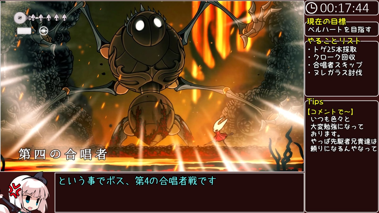 ないです<前 次><a href="https://www.nicovideo.jp/watch/sm45620965" class="watch">sm45620965</a><br><br>動画内で触れさせていただいた方々<br>DryEye兄貴<br><a href="https://www.twitch.tv/dryeye_game" target="_blank" rel="noopener nofollow">https://www.twitch.tv/dryeye_game</a><br><a href="https://www.youtube.com/@dryeye_game" target="_blank" rel="noopener nofollow">https://www.youtube.com/@dryeye_game</a><br>前回のレースの模様→<a href="https://www.twitch.tv/videos/2583544539" target="_blank" rel="noopener nofollow">https://www.twitch.tv/videos/2583544539</a><br>さわよしさん<br><a href="https://www.twitch.tv/sawayoshiyt" target="_blank" rel="noopener nofollow">https://www.twitch.tv/sawayoshiyt</a><br><a href="https://www.youtube.com/@sawayoshisy" target="_blank" rel="noopener nofollow">https://www.youtube.com/@sawayoshisy</a><br>any%1時間切りの映像→<a href="https://www.youtube.com/watch?v=1zfNPpO91sA" target="_blank" rel="noopener nofollow">https://www.youtube.com/watch?v=1zfNPpO91sA</a><br>ーーーーーーーーーーーーーーーーーーーーーー<br>市民ランナーが走るRTA第16弾。<br>Steam版「Hollow Knight:Silksong」の呪いEDを目指すRTA動画です。<br>「一般人がRTA走者のまねごとをするとどうなるのか」<br>という試験的内容も含んでいますので<br>生暖かい目でご視聴ください<br>ーーーーーーーーーーーーーーーーーーーーーー<br>前走:ホロウナイトシルクソングany% RTA<br><a href="https://www.nicovideo.jp/watch/sm44624438" class="watch">sm44624438</a>