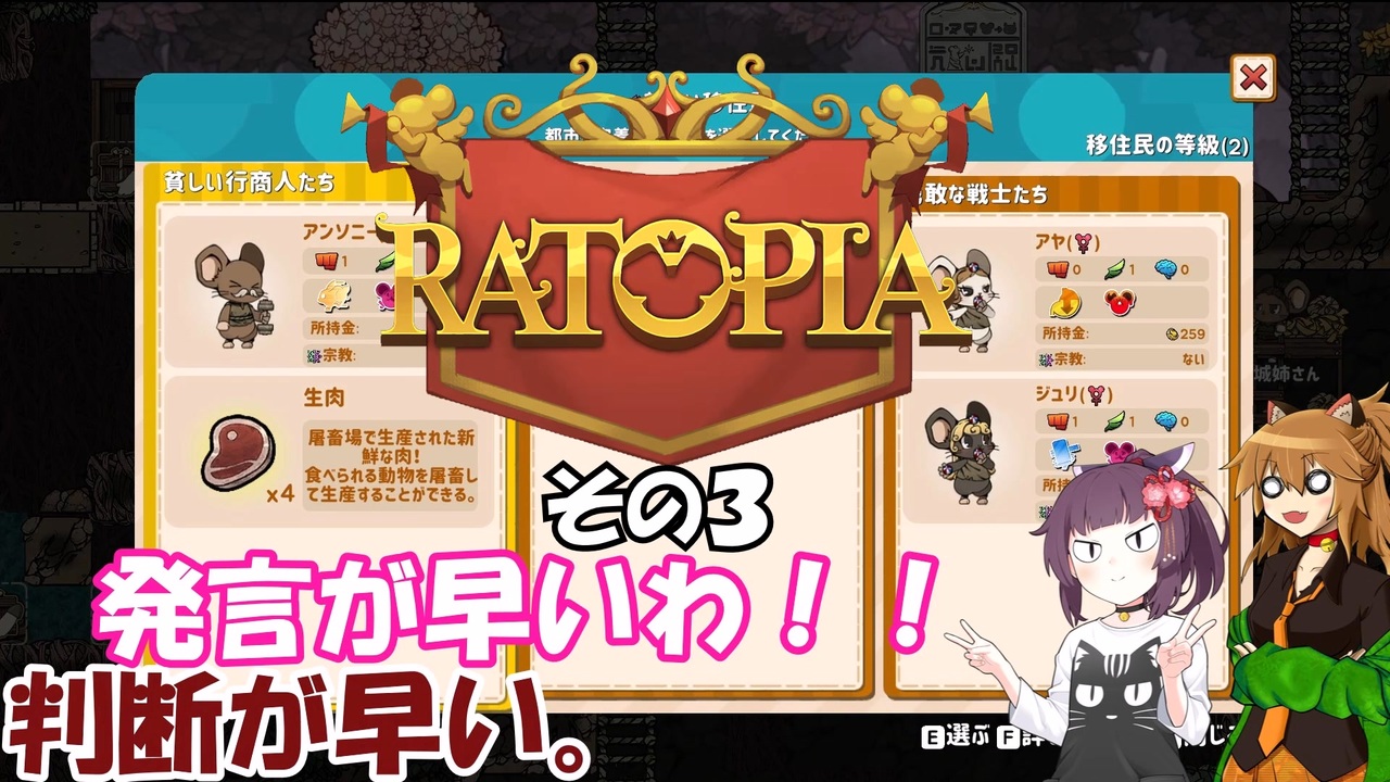 この動画はスチーム版Ratopiaの実況動画です。<br><br>※幾つか難易度を優しくするMODが導入されております。<br>また、高確率で失踪予定!<br><br><br><a href="https://www.nicovideo.jp/watch/sm45622221" class="watch">sm45622221</a> ← 前 次 → <a href="https://www.nicovideo.jp/watch/sm45629902" class="watch">sm45629902</a><br>その1リスト →<a href="https://www.nicovideo.jp/mylist/58364125" target="_blank" rel="noopener">mylist/58364125</a> <br><br>VOICEVOX:春日部つむぎ(ネコ耳) 九州そら(山城) 雨晴はう(妖夢)<br> 青山龍星(ドラムカン) 東北きりたん(東北きりたん)<br> あいちゃん(中国うさぎ(立ち絵:akihiyo様作 立ち中国うさぎ素材 <a href="https://seiga.nicovideo.jp/seiga/im11211212" target="_blank" rel="noopener">im11211212</a>))<br>Voiceroid:東北きりたん(立ち絵:このりEX様作 東北きりたん立ち絵素材5 <a href="https://seiga.nicovideo.jp/seiga/im10819054" target="_blank" rel="noopener">im10819054</a>)<br>