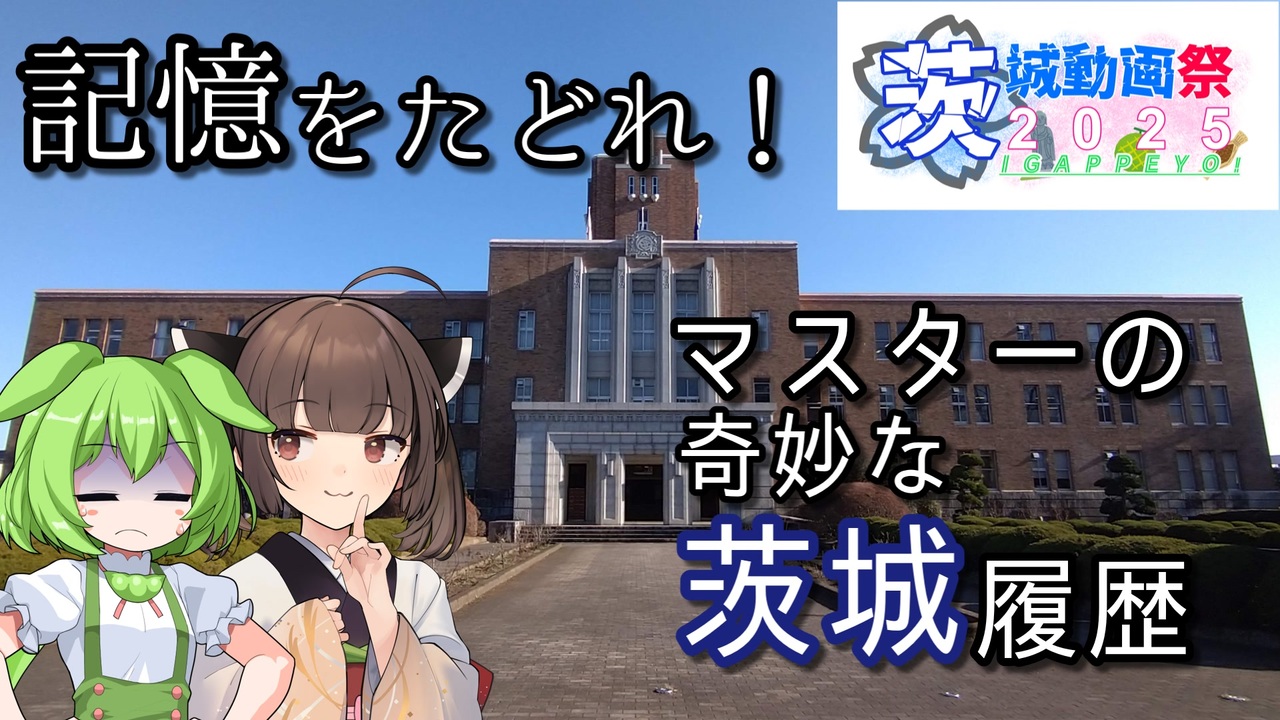 <strong>私は言いましたからね。壮大な自分語りだって。</strong><br><br>ということで、syageki(<a href="https://www.nicovideo.jp/user/21575316" target="_blank" rel="noopener nofollow">https://www.nicovideo.jp/user/21575316</a> )様主催の「茨城動画祭」参加動画です。<br>何とか間に合いましたね。<br>※チェックもほどほどに上げているので、ミスはご容赦ください<br><br>茨城がテーマであればなんでもいいとのことだったので、都道府県市区町村(<a href="https://uub.jp/" target="_blank" rel="noopener nofollow">https://uub.jp/</a> )様で算出した、茨城県の「経県値」をもとに動画を作ってきました。<br>人生という名の旅行を共にした場所なので、ジャンルは旅行ということで…(???)<br><br />〇BGM<br>DOVA-SYNDROME様(曲名は動画内に記載しています) <a href="https://dova-s.jp/" target="_blank" rel="noopener nofollow">https://dova-s.jp/</a><br><br>〇効果音<br>効果音ラボ様 <a href="https://soundeffect-lab.info/" target="_blank" rel="noopener nofollow">https://soundeffect-lab.info/</a><br><br>お借りしている立ち絵は親作品からご確認を。