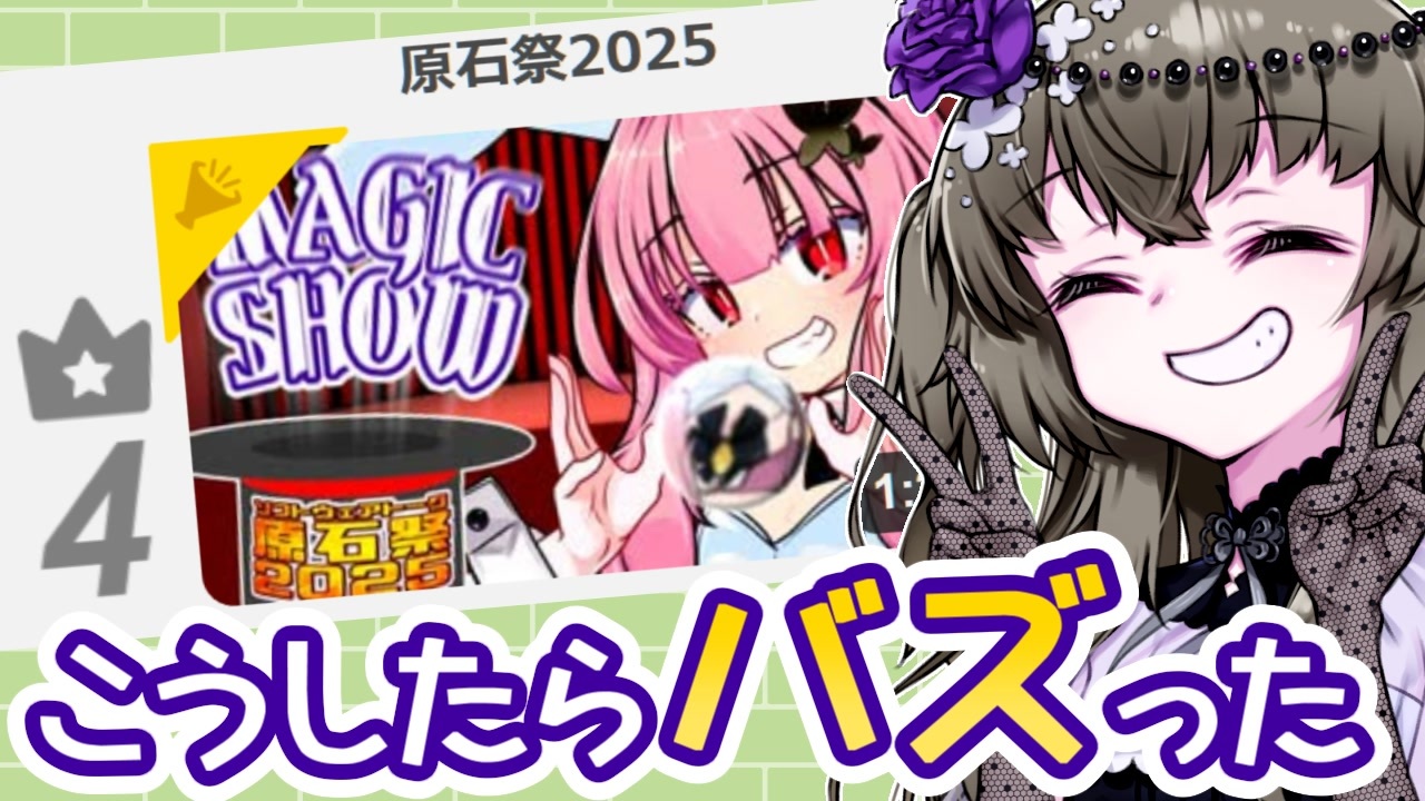 Q.<span style="color: #980000; font-size: 16px;"><strong>「原石祭でバズる準備、できてますか?」</strong></span><br>A.<span style="color: #351c75; font-size: 18px;"><strong>「できました!」</strong></span><br><br><strong>結果</strong><br><span style="color: #9900ff; font-size: 24px;"><strong>「バズりました!」</strong></span><br><br>という訳で何をしたらバズったか語らせてください!<br><br><span style="font-size: 18px;"><strong>1.4万文字あるnote:<a href="https://note.com/many_baggage/n/nbe560eddd99f" target="_blank" rel="noopener nofollow">https://note.com/many_baggage/n/nbe560eddd99f</a></strong></span><br><br><span style="color: #0000ff;"><strong>Twitter:<a href="https://x.com/many_baggage" target="_blank" rel="noopener nofollow">https://x.com/many_baggage</a></strong></span>(11/17追記)<br><br><strong>マジックショー原石祭回:<a href="https://www.nicovideo.jp/watch/sm45427949" class="watch">sm45427949</a></strong><br><br>マイリスト<br>・原石祭関係の投稿:<a href="https://www.nicovideo.jp/mylist/78942639" target="_blank" rel="noopener">mylist/78942639</a><br>・マジックショーシリーズ:my/<a href="https://www.nicovideo.jp/mylist/78017990" target="_blank" rel="noopener">mylist/78017990</a><br>・そっちなのシリーズ:<a href="https://www.nicovideo.jp/mylist/78978635" target="_blank" rel="noopener">mylist/78978635</a><br><br>本動画は、メシと蒸し風呂と私様主催のボイロ(広義)エッセイ投稿祭に参加しています。<br>告知動画:<a href="https://www.nicovideo.jp/watch/sm45427872" class="watch">sm45427872</a><br><br>また、原石祭2025後夜祭に3週間6日2時間1分遅刻して参加しています。<br>原石祭インフォ:<a href="https://blog.nicovideo.jp/niconews/255025.html" target="_blank" rel="noopener nofollow">https://blog.nicovideo.jp/niconews/255025.html</a><br>原石祭告知動画:合法少女 アルカ・フェニコ様 <a href="https://www.nicovideo.jp/watch/sm45285324" class="watch">sm45285324</a><br><br>【使用音声合成ソフト】<br>VOICEVOX:冥鳴ひまり<br>VOICEVOX:栗田まろん<br>VOICEROID2:琴葉姉妹<br>【立ち絵】<br>冥鳴ひまり:聡間まこと様 <a href="https://seiga.nicovideo.jp/seiga/im11515552" target="_blank" rel="noopener">im11515552</a><br>【素材】<br>面白い動画を見てる牛さん:ぶちも様 <a href="https://www.ac-illust.com/main/detail.php?id=23894025" target="_blank" rel="noopener nofollow">https://www.ac-illust.com/main/detail.php?id=23894025</a><br>【効果音】<br>効果音ラボ様 <a href="https://soundeffect-lab.info/" target="_blank" rel="noopener nofollow">https://soundeffect-lab.info/</a><br><br>上記以外の立ち絵や素材等は親作品リスト及び、各動画の概要欄や親作品リストを参照ください<br><br><a target="_blank" href="https://qa.nicovideo.jp/faq/show/19424?site_domain=default" style="font-size: 13px;color: #657586; text-decoration: underline; line-height: 1.4">この動画は投稿者によって修正されました</a>