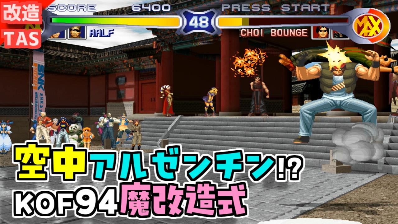 KOF94レインボー 怒チーム<br><br>うーん、予想通りキャラが二人かぶっているのと<br>投げ技主体の人たちはストリートファイター同様改造化のメリットを享受できませんね・・<br><br><br>現在の所バージョン1となり、以下の改造が入っています<br>・飛び道具速度変更<br>・飛び道具連発可能<br>・溜め無しで必殺技可能<br>・気合溜め即MAX<br>・足払いから追撃可能<br>・ダメージ半減(2周目から3分の1)<br>・気絶値4分の1<br>・空中で必殺技可能<br>・必殺技から必殺技をキャンセルして発動可能<br><br>使用ソフト:PS2版KOF94<br />動画に「いいね!」「マイリスト登録」よろしくお願いします。<br><br>・おすすめ<br>[TAS]Grand Theft Auto 3 Part1→<a href="https://www.nicovideo.jp/watch/sm14718961" class="watch">sm14718961</a><br>[TAS]MaxPayne デッドターゲット Part1→<a href="https://www.nicovideo.jp/watch/sm15093299" class="watch">sm15093299</a><br>[TAS]michigan Part1→<a href="https://www.nicovideo.jp/watch/sm18393230" class="watch">sm18393230</a><br><br>サポート頂けると励みになります<br>魔界塔士のサポーターになる→<a href="https://creator-support.nicovideo.jp/registration/15153622" target="_blank" rel="noopener nofollow">https://creator-support.nicovideo.jp/registration/15153622</a><br><br>TAS動画まとめ→<a href="https://koeiprogenitor.com/tas/matome/" target="_blank" rel="noopener nofollow">https://koeiprogenitor.com/tas/matome/</a><br>つべ→<a href="https://www.youtube.com/user/koeiprogenitor1/" target="_blank" rel="noopener nofollow">https://www.youtube.com/user/koeiprogenitor1/</a><br>インスタ→<a href="https://www.instagram.com/makaitoshi" target="_blank" rel="noopener nofollow">https://www.instagram.com/makaitoshi</a><br><br>本編→シリーズ一覧見てね<br>
