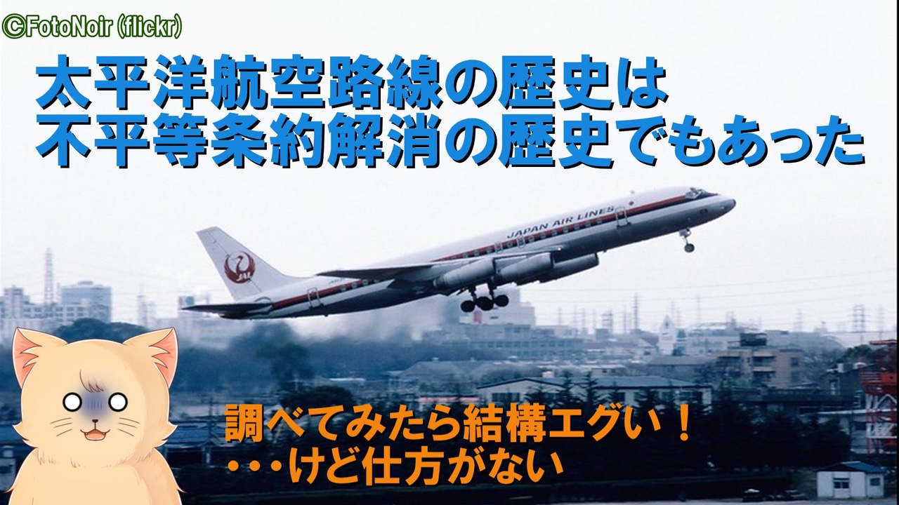 久しぶりの「裁判所猫と学ぶ」シリーズ。今回は前後編に分けて、アジアと北アメリカ大陸(と言うか日本とアメリカ)を結ぶ太平洋路線の歴史をご紹介します。 今でこそ日米様々な会社が乗り入れ、カナダやメキシコ、アジア各地の航空会社も飛び交い、日本以外からもアジア各地の主要都市から航空便が行き交う太平洋路線。しかし80年代まではほぼ日本~アメリカ間の航空路線であり、日本とアメリカの間には戦後すぐに結ばれた航空協定によって企業努力では埋められない「格差」が存在しました。詳しくは本編で。 前編は戦前の太平洋路線から日本航空の世界一周路線開設までをご紹介します。<br><br>一瞬だけ出てきたカナディアン航空はこちら→<a href="https://www.nicovideo.jp/watch/sm31914675" class="watch">sm31914675</a><br>707vsDC-8についてはこちら→<a href="https://www.nicovideo.jp/watch/sm39816964" class="watch">sm39816964</a><br><br>後編→まだだよ<br /><span style="color: #000000; font-size: 14px;">迷航空会社列伝</span><span style="color: #006699; font-size: 14px;"><a href="https://www.nicovideo.jp/mylist/24098760" target="_blank" rel="noopener">mylist/24098760</a></span><span style="color: #000000; font-size: 14px;"> 迷列車北陸編</span><span style="color: #006699; font-size: 14px;"><a href="https://www.nicovideo.jp/mylist/19084652" target="_blank" rel="noopener">mylist/19084652</a> </span><span style="color: #000000; font-size: 14px;">東海道交通戦争</span><span style="color: #006699; font-size: 14px;"><a href="https://www.nicovideo.jp/mylist/57958388" target="_blank" rel="noopener">mylist/57958388</a></span><span style="color: #000000; font-size: 14px;"> 交通機関の栄枯盛衰 </span><a href="https://www.nicovideo.jp/mylist/66898301" target="_blank" rel="noopener">mylist/66898301</a><br><span style="color: #000000; font-size: 14px;">ブログ→</span><span style="color: #006699; font-size: 14px;"><a href="http://www.meihokuriku-alps.com" target="_blank" rel="noopener nofollow">http://www.meihokuriku-alps.com</a></span><br>note→<a href="https://note.com/meihokuriku" target="_blank" rel="noopener nofollow">https://note.com/meihokuriku</a><br><span style="color: #000000; font-size: 14px;">使用BGM<br>甘茶の音楽工房様 </span><span style="color: #006699; font-size: 14px;"><a href="http://amachamusic.chagasi.com/index.html" target="_blank" rel="noopener nofollow">http://amachamusic.chagasi.com/index.html</a></span><br><span style="color: #000000; font-size: 14px;">魔王魂様 </span><span style="color: #006699; font-size: 14px;"><a href="https://maoudamashii.jokersounds.com/list/bgm5.html" target="_blank" rel="noopener nofollow">https://maoudamashii.jokersounds.com/list/bgm5.html</a></span>