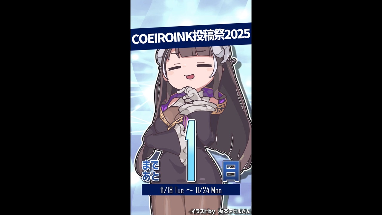 #COEIROINK投稿祭2025 までのカウントダウン!<br>【11/18】の開催まであと1日だよ💜<br><br>■COEIROINK投稿祭2025開催期間<br>2025年11月18日(火)20:00~11月24日(月)23:59<br><br>■投稿祭の詳しい説明はこちら!<br><a href="https://www.nicovideo.jp/watch/sm45523733" target="_blank" rel="noopener nofollow">https://www.nicovideo.jp/watch/sm45523733</a><br><br>◆アルマちゃん@twitter<br><a href="https://twitter.com/arma_prg" target="_blank" rel="noopener nofollow">https://twitter.com/arma_prg</a><br><br>◆Lusty*Kiss Production 公式サイト<br><a href="https://production.lusty-kiss.com/" target="_blank" rel="noopener nofollow">https://production.lusty-kiss.com/</a><br><br>◆Lusty*Kiss Production YouTubeチャンネル<br><a href="https://www.youtube.com/channel/UCfxvv69Q0j0k2Rvm8x9vEhQ" target="_blank" rel="noopener nofollow">https://www.youtube.com/channel/UCfxvv69Q0j0k2Rvm8x9vEhQ</a><br><br>◆COEIROINK 公式サイト<br><a href="https://coeiroink.com/" target="_blank" rel="noopener nofollow">https://coeiroink.com/</a><br><br>------出演------<br>アンジーさん:アンジーさん@COEIROINK<br><a href="https://coeiroink.com/character/audio-character/andzie-p" target="_blank" rel="noopener nofollow">https://coeiroink.com/character/audio-character/andzie-p</a><br><br>------立ち絵------<br>アンジーさん立ち絵素材(坂本アヒル 様)<br><a href="https://seiga.nicovideo.jp/seiga/im11696563" target="_blank" rel="noopener nofollow">https://seiga.nicovideo.jp/seiga/im11696563</a><br><br>------使用素材 ------<br>ディアちゃんの休日<br><a href="https://commons.nicovideo.jp/material/nc266496" target="_blank" rel="noopener nofollow">https://commons.nicovideo.jp/material/nc266496</a>