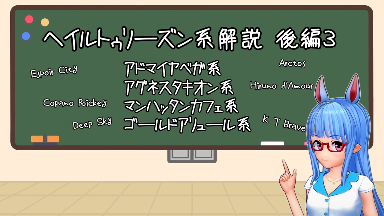 ご視聴ありがとうございます<br>サンデー系の続きです<br>4世代目から8世代目までのサイアーラインを紹介します<br><br>【参考サイト】<br>JBISサーチ様<br><a href="https://www.jbis.or.jp/index.html" target="_blank" rel="noopener nofollow">https://www.jbis.or.jp/index.html</a><br>netkeiba様<br><a href="https://www.netkeiba.com/" target="_blank" rel="noopener nofollow">https://www.netkeiba.com/</a><br>studbook 血統書データベース<br><a href="https://www.studbook.jp/users/ja/UserMenu" target="_blank" rel="noopener nofollow">https://www.studbook.jp/users/ja/UserMenu</a><br><br>このシリーズ<br>ヘイルトゥリーズン系前編:<a href="https://www.nicovideo.jp/watch/sm42339313" class="watch">sm42339313</a><br>ヘイルトゥリーズン系中編:<a href="https://www.nicovideo.jp/watch/sm42405522" class="watch">sm42405522</a><br>サンデー系①直仔編:<a href="https://www.nicovideo.jp/watch/sm45209565" class="watch">sm45209565</a><br>サンデー系②:<a href="https://www.nicovideo.jp/watch/sm45229945" class="watch">sm45229945</a><br><br>前回:2025年凱旋門賞出走馬紹介:<a href="https://www.nicovideo.jp/watch/sm45408118" class="watch">sm45408118</a><br>次回:<br>競馬解説動画マイリスト:<a href="https://www.nicovideo.jp/mylist/71482582" target="_blank" rel="noopener">mylist/71482582</a><br><br>BGM:<br>MusMus様<br><a href="https://musmus.main.jp/" target="_blank" rel="noopener nofollow">https://musmus.main.jp/</a><br><br>【競馬関係動画】<br>牧場見学シリーズ:<a href="https://www.nicovideo.jp/mylist/74947383" target="_blank" rel="noopener">mylist/74947383</a><br>解説動画シリーズ:<a href="https://www.nicovideo.jp/mylist/71482582" target="_blank" rel="noopener">mylist/71482582</a><br><br>【他のシリーズ】<br>ウイポ動画もしてました<br>マイリスト:<a href="https://www.nicovideo.jp/mylist/77471806" target="_blank" rel="noopener">mylist/77471806</a><br><br>他にツーリング動画も上げています<br>ツーリング動画マイリスト:<a href="https://www.nicovideo.jp/mylist/76440962" target="_blank" rel="noopener">mylist/76440962</a><br><br>X(ツイッター)<br><a href="https://twitter.com/MGixxer150" target="_blank" rel="noopener nofollow">https://twitter.com/MGixxer150</a>