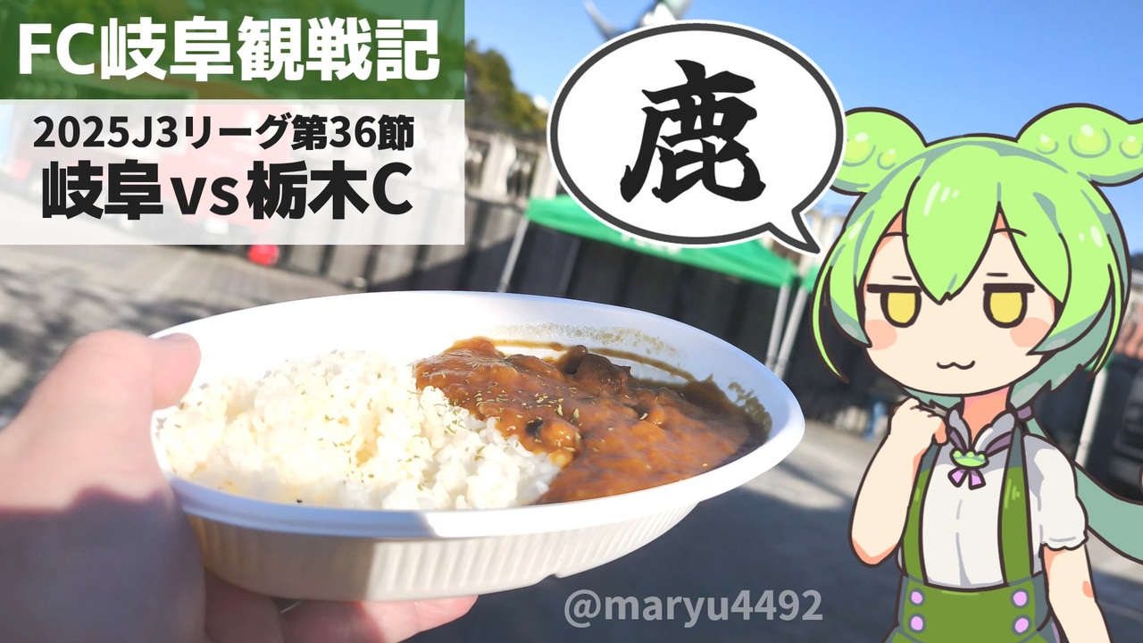 2025シーズンのJ3リーグは今日を含め、残り3試合。<br>この試合は海津市のホームタウンデーになっており<br>事前に申請すると、海津市民は無料で観戦チケットがもらえます。<br>先週、試合を観たばかりですがせっかくのご厚意<br>ありがたく頂戴しようと思います。<br><br><br><br>前回のFC岐阜:【FC岐阜観戦記】2025J3第35節 FC岐阜vsガイナーレ鳥取(2025.11.09)<br><a href="https://www.nicovideo.jp/watch/sm45611480" target="_blank" rel="noopener nofollow">https://www.nicovideo.jp/watch/sm45611480</a><br><br>【参考】<br>岐阜vs栃木Cの試合結果・データ(明治安田J3リーグ第36節:2025年11月15日)<br><a href="https://www.jleague.jp/match/j3/2025/111503/live" target="_blank" rel="noopener nofollow">https://www.jleague.jp/match/j3/2025/111503/live</a><br><br>【使用した素材】(※敬称略)<br>(合成音声)VOICEVOX/ずんだもん/四国めたん/春日部つむぎ<br><a href="https://voicevox.hiroshiba.jp/" target="_blank" rel="noopener nofollow">https://voicevox.hiroshiba.jp/</a><br>(立ち絵)坂本アヒル<br><a href="https://seiga.nicovideo.jp/seiga/m10788496/im10791276" target="_blank" rel="noopener nofollow">https://seiga.nicovideo.jp/seiga/m10788496/im10791276</a><br>(立ち絵)ハーベスト<br><a href="https://seiga.nicovideo.jp/seiga/im11541234?track=seiga_illust_keyword" target="_blank" rel="noopener nofollow">https://seiga.nicovideo.jp/seiga/im11541234?track=seiga_illust_keyword</a><br>(楽曲)甘茶の音楽工房/「日々是好日」<br><a href="https://amachamusic.chagasi.com" target="_blank" rel="noopener nofollow">https://amachamusic.chagasi.com</a><br>(楽曲)水曜日のフィロソフィ / 仄架よみ feat. Flehmann<br><a href="https://www.youtube.com/watch?v=XNNS0RJlsaU&t=1s" target="_blank" rel="noopener nofollow">https://www.youtube.com/watch?v=XNNS0RJlsaU&t=1s</a>