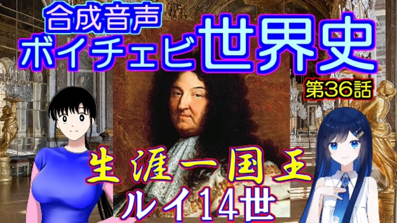 日テレ系「まんが日本史」をオマージュし、<br>学習漫画「世界の歴史」を教科書とした<br>ボイチェビ世界史 第36話は、<br><br>朕は国家なり!<br><span style="font-size: 18px;"><strong>ルイ14世</strong></span>など<br>ブルボン朝フランス王国を<br>中心とした、<br>17世紀のヨーロッパです。<br><br>「歴史学者・ことりさん」が、<br>no.7(voicevox)の声でご案内いたします。<br>そしてアシスタントに双葉湊音ちゃんを起用。<br><br>EDテーマ「風のメルヘン」は、<br>花隈千冬(synthesizerV)が歌います。<br><br>注意点<br><span style="font-size: 16px;"><strong>・【重要!】この動画は、UP主の主観で作成されているため、<br>一般的な解釈とは齟齬が発生する場合があります。</strong></span><br>・セリフおよび画像は、その一部は教科書など参考文献から<br>引用させていただくことがあります。<br>※補足したいとき、思いつかなかったとき、<br> チャットGPTを使うことがあります。<br>・演出のために、舞台の時代にそぐわない画像や<br>音楽を使う場合がございます。<br>・セリフ発声はすべて合成音声<br>・BGMは、ファイナルファンタジー等の、他者作成のBGMや音楽を借ります。<br>・若干の表記ゆれはご容赦ください。<br>・親作品は動画最後のスタッフロール画面に掲載します。<br><br>1:02 第1章 宗教改革の末路<br><a href="https://www.nicovideo.jp/watch/sm45636604?from=62" target="_blank" rel="noopener nofollow">https://www.nicovideo.jp/watch/sm45636604?from=62</a><br><br>4:15 第2章 ルイ13世と三十年戦争<br><a href="https://www.nicovideo.jp/watch/sm45636604?from=255" target="_blank" rel="noopener nofollow">https://www.nicovideo.jp/watch/sm45636604?from=255</a><br><br>9:45 第3章 ベルサイユ宮殿の完成<br><a href="https://www.nicovideo.jp/watch/sm45636604?from=585" target="_blank" rel="noopener nofollow">https://www.nicovideo.jp/watch/sm45636604?from=585</a><br><br>13:40 第4章 生涯一国王・ルイ14世<br><a href="https://www.nicovideo.jp/watch/sm45636604?from=820" target="_blank" rel="noopener nofollow">https://www.nicovideo.jp/watch/sm45636604?from=820</a><br><br>19:10 いきなり!本編終了<br><a href="https://www.nicovideo.jp/watch/sm45636604?from=1150" target="_blank" rel="noopener nofollow">https://www.nicovideo.jp/watch/sm45636604?from=1150</a>