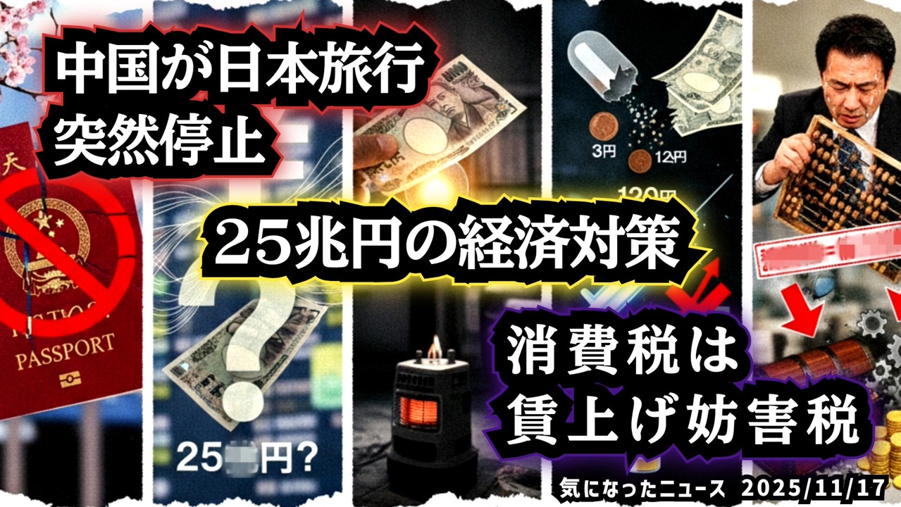 ◆中国が日本旅行を突然停止◆25兆円の経済対策◆電気・ガス補助6000円◆医薬品の原価の闇◆消費税は売上税→賃上げ妨害税<br><br>あらすじ<br>中国が日本旅行の販売を突然止めた背景には、首相の台湾有事発言と、中国総領事の過激な発言による外交の緊張があります。<br>一方で国内では、電気・ガス補助が6000円だけ、財政規模は25兆円へ拡大しながら「何に使うのか見えない」という声が増えています。<br>さらに、降圧薬3円→120円、抗がん剤500円→8万円という医薬品の原価構造や、赤字企業にも容赦なくかかる消費税の問題も噴出。<br><br>◆今回の台本&詳細<a href="https://keiichiro8140.hatenablog.com/entry/25111777333999" target="_blank" rel="noopener nofollow">https://keiichiro8140.hatenablog.com/entry/25111777333999</a><br><br>◆これまでの動画<a href="https://x.gd/sPXoJ" target="_blank" rel="noopener nofollow">https://x.gd/sPXoJ</a><br><br>◆もしも(BAN)の時のためのマイリンク集<a href="https://lit.link/K-16-news-44" target="_blank" rel="noopener nofollow">https://lit.link/K-16-news-44</a><br><br>ご覧いただきありがとうございます<br>m(_ _)m<br>気になったニュース 2025/11/17<br><br />著作権、肖像権に配慮して作成しております。<br><br>◆気になったニュースの台本!?<br>メモ代わりに作った台本をそのままあげてます<br><a href="https://keiichiro8140.hatenablog.com/." target="_blank" rel="noopener nofollow">https://keiichiro8140.hatenablog.com/.</a><br><br><br>ここからはシリーズ紹介<br><br><br>◆ ワクチン解毒・デトックス<br><a href="https://x.gd/fZweg" target="_blank" rel="noopener nofollow">https://x.gd/fZweg</a><br><br>◆ウイリアム・マキス博士のがん治療(イベルメクチン・フェンベンダゾール等)<br><a href="https://x.gd/AtFYS" target="_blank" rel="noopener nofollow">https://x.gd/AtFYS</a><br><br>◆予防接種健康被害救済制度<br><a href="https://x.gd/0xK9x" target="_blank" rel="noopener nofollow">https://x.gd/0xK9x</a><br><br>◆気になったニュース #1501~<br><br>◆ 【ショートver】気になったニュース<br><a href="https://x.gd/7MxXC" target="_blank" rel="noopener nofollow">https://x.gd/7MxXC</a><br><br>◆ 気になったニュース #1001~<br><a href="https://x.gd/Lp8gv" target="_blank" rel="noopener nofollow">https://x.gd/Lp8gv</a><br><br>◆ 気になったニュース #501~<br><a href="https://x.gd/EmbS4" target="_blank" rel="noopener nofollow">https://x.gd/EmbS4</a><br><br>◆ 気になったニュース #1~#500<br><a href="https://x.gd/uPhNb" target="_blank" rel="noopener nofollow">https://x.gd/uPhNb</a><br><br>◆ X(旧Twitter)・テレグラムで気になった情報<br><a href="https://x.gd/YG6FT" target="_blank" rel="noopener nofollow">https://x.gd/YG6FT</a><br><br>◆ 日比谷5万人パレードデ⚪生放送アーカイブ動画<br><a href="https://x.gd/3CHJv" target="_blank" rel="noopener nofollow">https://x.gd/3CHJv</a><br><br>◆日比谷5万人パレード⚪モのマイリスト作ってみました<br><a href="https://nico.ms/mylist/76828848?ref=sp_other" target="_blank" rel="noopener nofollow">https://nico.ms/mylist/76828848?ref=sp_other</a><br><br>◆3.30 令和の百姓⚪⚪<br><a href="https://www.nicovideo.jp/series/511791?ref=garage_share_other" target="_blank" rel="noopener nofollow">https://www.nicovideo.jp/series/511791?ref=garage_share_other</a><br><br>◆ 及川幸久さんの【XNEWS】シリーズ<br><a href="https://x.gd/3k78K" target="_blank" rel="noopener nofollow">https://x.gd/3k78K</a><br><br>◆これまでの動画<a href="https://x.gd/sPXoJ" target="_blank" rel="noopener nofollow">https://x.gd/sPXoJ</a><br><br>◆もしも(BAN)の時のためのマイリンク集<a href="https://lit.link/K-16_News44" target="_blank" rel="noopener nofollow">https://lit.link/K-16_News44</a><br><br>