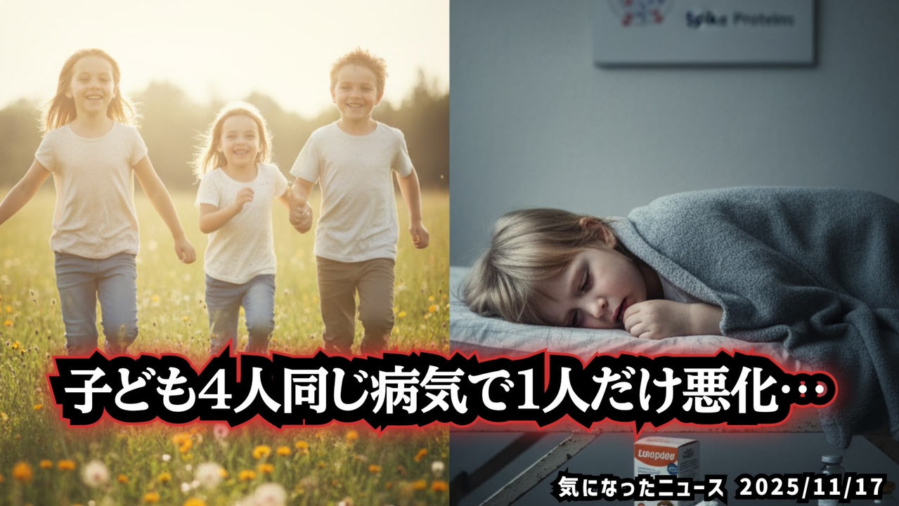 ◆子ども4人、同じ病気なのに1人だけ悪化…そこで浮かび上がった“ある事実”<br><br>あらすじ <br>4人の子どもが同じタイミングで同じ病気にかかった。<br>しかし、なぜか“かつてワクチンを受けていた1人だけ”症状が強く、発熱の期間も長かった――。<br>親が抱いたこの素朴な疑問を出発点に、免疫学の世界では「抗原が長く体に残ると免疫が疲れやすくなる」という研究が語られている。<br>HIV やがんの免疫疲弊と、抗原刺激の持続という共通点。<br>では、人の免疫はどのように差が生まれるのか?<br>本動画では、特定の結論を決めつけるのではなく、最新の知見を手がかりに、「免疫が弱くなるとはどういうことなのか?」を分かりやすく整理していく。<br><br>※特定の医療行為への断定的評価は行わず、あくまで科学的概念の紹介と問題提起の内容です。<br><br>◆今回の台本(詳細)<a href="https://keiichiro8140.hatenablog.com/entry/25111888111" target="_blank" rel="noopener nofollow">https://keiichiro8140.hatenablog.com/entry/25111888111</a><br><br>◆これまでの動画<a href="https://x.gd/sPXoJ" target="_blank" rel="noopener nofollow">https://x.gd/sPXoJ</a><br><br>◆もしも(BAN)の時のためのマイリンク集<a href="https://lit.link/K-16-news-44" target="_blank" rel="noopener nofollow">https://lit.link/K-16-news-44</a><br><br>ご覧いただきありがとうございます<br>m(_ _)m <br><br>気になったニュース 2025/11/18<br><br />著作権、肖像権に配慮して作成しております。<br><br>◆気になったニュースの台本!?<br>メモ代わりに作った台本をそのままあげてます<br><a href="https://keiichiro8140.hatenablog.com/." target="_blank" rel="noopener nofollow">https://keiichiro8140.hatenablog.com/.</a><br><br><br>ここからはシリーズ紹介<br><br><br>◆ ワクチン解毒・デトックス<br><a href="https://x.gd/fZweg" target="_blank" rel="noopener nofollow">https://x.gd/fZweg</a><br><br>◆ウイリアム・マキス博士のがん治療(イベルメクチン・フェンベンダゾール等)<br><a href="https://x.gd/AtFYS" target="_blank" rel="noopener nofollow">https://x.gd/AtFYS</a><br><br>◆予防接種健康被害救済制度<br><a href="https://x.gd/0xK9x" target="_blank" rel="noopener nofollow">https://x.gd/0xK9x</a><br><br>◆気になったニュース #1501~<br><br>◆ 【ショートver】気になったニュース<br><a href="https://x.gd/7MxXC" target="_blank" rel="noopener nofollow">https://x.gd/7MxXC</a><br><br>◆ 気になったニュース #1001~<br><a href="https://x.gd/Lp8gv" target="_blank" rel="noopener nofollow">https://x.gd/Lp8gv</a><br><br>◆ 気になったニュース #501~<br><a href="https://x.gd/EmbS4" target="_blank" rel="noopener nofollow">https://x.gd/EmbS4</a><br><br>◆ 気になったニュース #1~#500<br><a href="https://x.gd/uPhNb" target="_blank" rel="noopener nofollow">https://x.gd/uPhNb</a><br><br>◆ X(旧Twitter)・テレグラムで気になった情報<br><a href="https://x.gd/YG6FT" target="_blank" rel="noopener nofollow">https://x.gd/YG6FT</a><br><br>◆ 日比谷5万人パレードデ⚪生放送アーカイブ動画<br><a href="https://x.gd/3CHJv" target="_blank" rel="noopener nofollow">https://x.gd/3CHJv</a><br><br>◆日比谷5万人パレード⚪モのマイリスト作ってみました<br><a href="https://nico.ms/mylist/76828848?ref=sp_other" target="_blank" rel="noopener nofollow">https://nico.ms/mylist/76828848?ref=sp_other</a><br><br>◆3.30 令和の百姓⚪⚪<br><a href="https://www.nicovideo.jp/series/511791?ref=garage_share_other" target="_blank" rel="noopener nofollow">https://www.nicovideo.jp/series/511791?ref=garage_share_other</a><br><br>◆ 及川幸久さんの【XNEWS】シリーズ<br><a href="https://x.gd/3k78K" target="_blank" rel="noopener nofollow">https://x.gd/3k78K</a><br><br>◆これまでの動画<a href="https://x.gd/sPXoJ" target="_blank" rel="noopener nofollow">https://x.gd/sPXoJ</a><br><br>◆もしも(BAN)の時のためのマイリンク集<a href="https://lit.link/K-16_News44" target="_blank" rel="noopener nofollow">https://lit.link/K-16_News44</a><br><br>