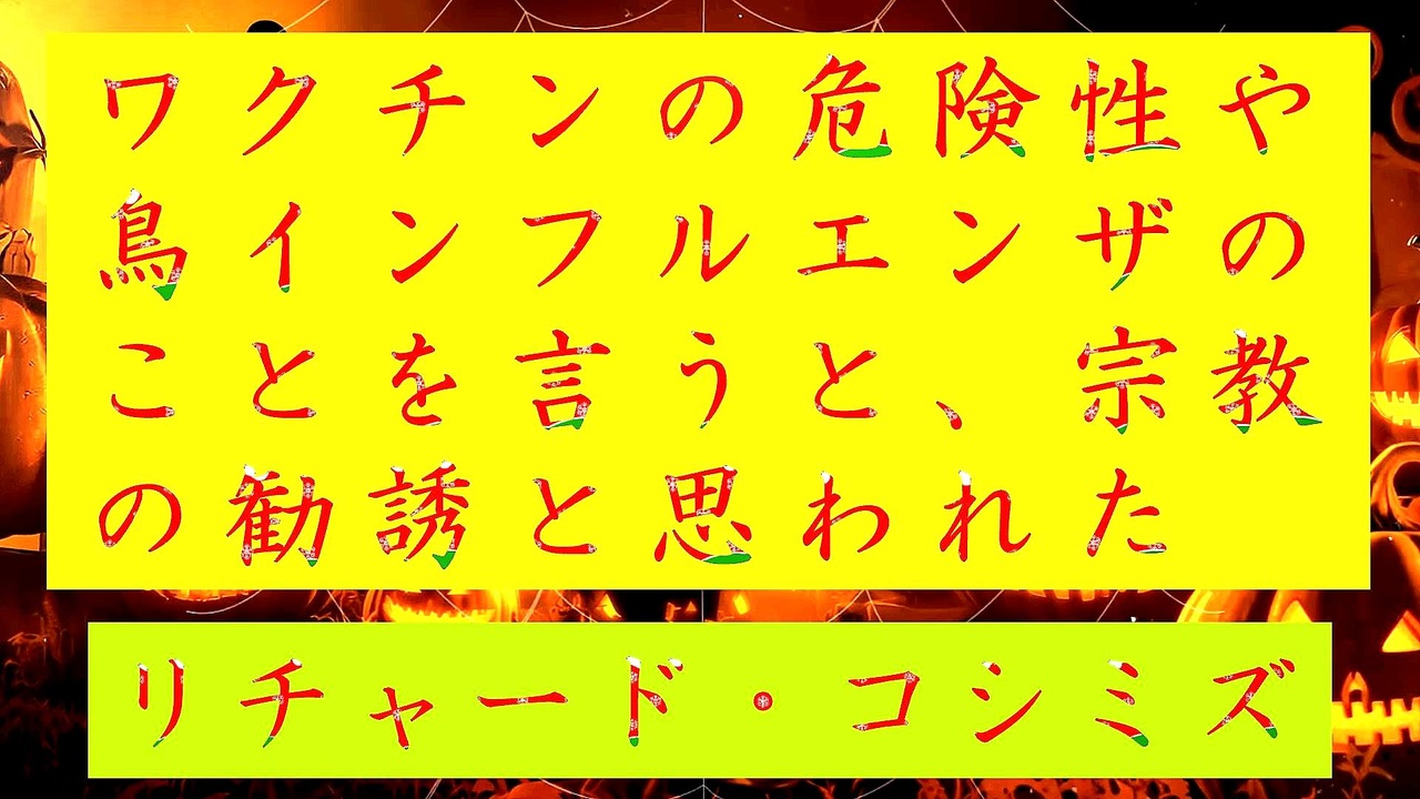 <span style="color: #ff0000;"><strong>◐『 家族 』や『 知り合い 』に、『 ワクチンの危険性 』や『 鳥インフルエンザ 』のことを言うと、『 宗教 』の『 勧誘 』と思われた。</strong></span><br><br> <span style="color: #38761d;"><strong>◐『「 リチャード・コシミズ・チャンネル 」</strong></span><span style="color: #ff0000;"><strong>⦅ ニコニコ チャンネル ⦆</strong></span><span style="color: #38761d;"><strong>』</strong></span><br> <span style="color: #0000ff;"><strong><a href="https://ch.nicovideo.jp/richardkoshimizu" target="_blank" rel="noopener nofollow">https://ch.nicovideo.jp/richardkoshimizu</a></strong></span><br><br><span style="color: #38761d;"><strong> ◐『「 リチャード・コシミズ 講演会 」</strong></span><span style="color: #ff0000;"><strong>公式「 動画ギャラリー 」⦅ 最新動画 ⦆⦅ YouTube版 ⦆</strong></span><span style="color: #38761d;"><strong>』</strong></span><br> <span style="color: #0000ff;"><strong><a href="https://www.youtube.com/@richardkoshimizu-video-gallery" target="_blank" rel="noopener nofollow">https://www.youtube.com/@richardkoshimizu-video-gallery</a></strong></span><br><br> <span style="color: #38761d;"><strong>◐『「 リチャード・コシミズ 講演会 」</strong></span><span style="color: #ff0000;"><strong>公式「 動画ギャラリー 」⦅ テーマ別 ⦆⦅ YouTube版 ⦆</strong></span><span style="color: #38761d;"><strong>』</strong></span><br> <span style="color: #0000ff;"><strong><a href="https://www.youtube.com/@RK-Video-Gallery2" target="_blank" rel="noopener nofollow">https://www.youtube.com/@RK-Video-Gallery2</a></strong></span><br>