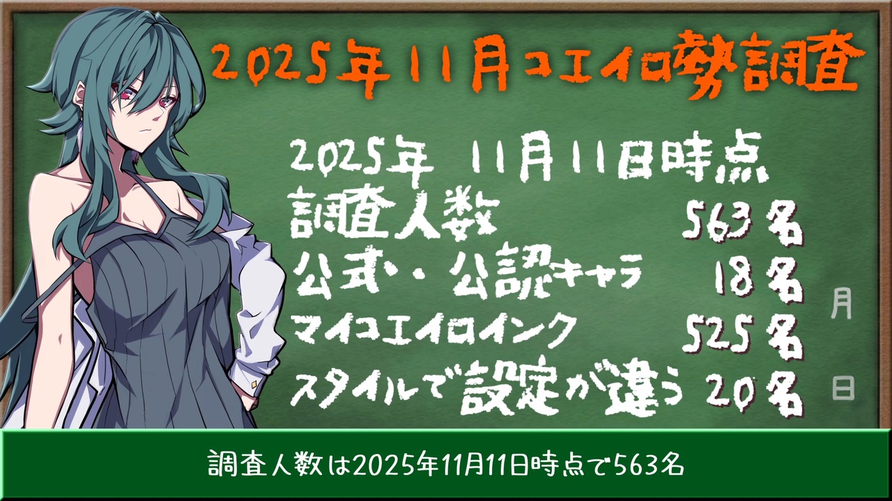 COEIROINK公式・公認キャラクターとMYCOEIROINKキャラクター達のプロフィールを調査したものになります<br>曖昧な数値はその数値で集計しているので正確なデータではありません。(例:「外見は16歳」は16歳として集計)<br>なのでネタとして視聴していただければ嬉しいです。<br><br>使用させて頂いた音声(順不同)<br>COEIROINK:クリノクロア<br>COEIROINK:エリアス<br>COEIROINK:宝条セキ<br>COEIROINK:カニ娘<br>COEIROINK:葦江音綺<br>COEIROINK:鉄河原夜幌<br>COEIROINK:A-アドリフター<br>COEIROINK:ミルルちゃん<br>COEIROINK:北星ポーラ<br>COEIROINK:車城翡翠<br>COEIROINK:TypeS<br>COEIROINK:コシラズ<br>COEIROINK:音風ヰクル<br>COEIROINK:惨音ンムネン<br>COEIROINK:委音アクタ<br>COEIROINK:七瀬狛子<br>COEIROINK:ユビキリヤ<br>COEIROINK:蔓歌せら<br>COEIROINK:ユニティ・がる〜ぞ <br>COEIROINK:虚音イフ<br>COEIROINK:杜 ‐コト‐<br><br>Kanaka Font <a href="https://073-kanakafont.booth.pm/items/5500648" target="_blank" rel="noopener nofollow">https://073-kanakafont.booth.pm/items/5500648</a><br>無料AIトークソフトCOEIROINK: <a href="https://coeiroink.com" target="_blank" rel="noopener nofollow">https://coeiroink.com</a><br>フリーBGM・音楽素材MusMus <a href="https://musmus.main.jp" target="_blank" rel="noopener nofollow">https://musmus.main.jp</a><br>OKUMONO-背景フリー素材 <a href="https://sozaino.site" target="_blank" rel="noopener nofollow">https://sozaino.site</a><br>いらすとや 他(コンテンツリー参照)<br><br>今回纏めた表を下記に置きます(2026年11月ぐらいまで)<br><a href="https://docs.google.com/spreadsheets/d/1obta_7tH13fH_iha7LX7QV4SJd_tVHRHAA_LvT7dIuc/edit?usp=drive_link" target="_blank" rel="noopener nofollow">https://docs.google.com/spreadsheets/d/1obta_7tH13fH_iha7LX7QV4SJd_tVHRHAA_LvT7dIuc/edit?usp=drive_link</a><br><br>何かあればこちらへ<br>マシュマロ: <a href="https://marshmallow-qa.com/clfoy4e03bdjng9" target="_blank" rel="noopener nofollow">https://marshmallow-qa.com/clfoy4e03bdjng9</a><br>@karasumi@voskey.icalo.net<br>Xは@earang47<br><br>2023年11月版:<a href="https://www.nicovideo.jp/watch/sm43033470" class="watch">sm43033470</a><br>2024年03月版:<a href="https://www.nicovideo.jp/watch/sm43651873" class="watch">sm43651873</a><br>2024年08月版:<a href="https://www.nicovideo.jp/watch/sm44074459" class="watch">sm44074459</a><br>2024年11月版:<a href="https://www.nicovideo.jp/watch/sm44322924" class="watch">sm44322924</a><br>2025年04月版:<a href="https://www.nicovideo.jp/watch/sm45087009" class="watch">sm45087009</a>