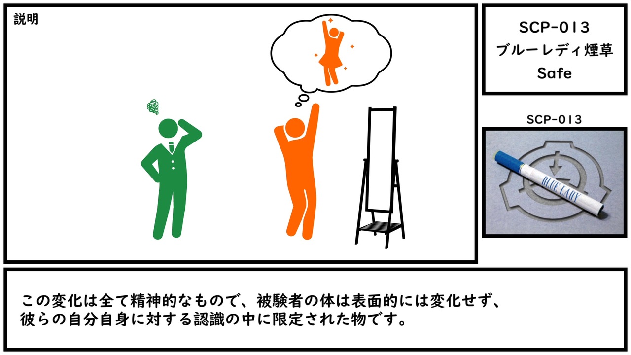 私は彼女を愛している、しかし、何故かはわからない。 <br><br>原語版タイトル: SCP-013 - Blue Lady Cigarettes<br>訳者: 訳者不明<br>原語版作者: Dexanote<br>ソース: <a href="http://scp-jp.wikidot.com/scp-013" target="_blank" rel="noopener nofollow">http://scp-jp.wikidot.com/scp-013</a><br>原語版ソース: <a href="http://scp-wiki.wikidot.com/scp-013" target="_blank" rel="noopener nofollow">http://scp-wiki.wikidot.com/scp-013</a><br>ライセンス: CC BY-SA 3.0<br>作成年: 2013<br>原語版作成年: 2012 <br><br>この作品は株式会社アクエストのライセンス(ID:AQALCNTUSR02072507)に基づいて生成された音声データを含んでいます。
