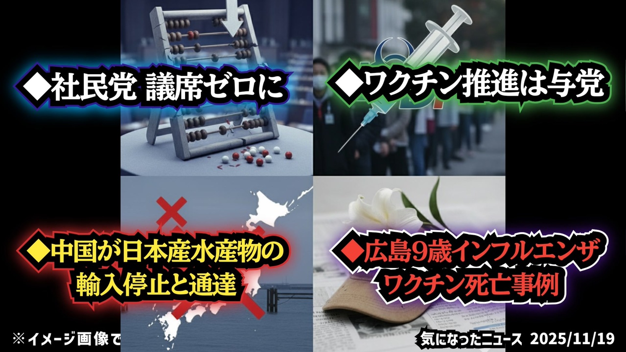 ◆社民党 衆議院の議席ゼロに◆ファイザー製コロナワクチン接種尽力したのは自○党◆中国が日本産水産物の輸入停止と通達◆広島9歳インフルエンザワクチン死亡事例<br><br>◆今回の台本&詳細<a href="https://keiichiro8140.hatenablog.com/entry/25111999222" target="_blank" rel="noopener nofollow">https://keiichiro8140.hatenablog.com/entry/25111999222</a><br><br>◆これまでの動画<a href="https://x.gd/sPXoJ" target="_blank" rel="noopener nofollow">https://x.gd/sPXoJ</a><br><br>◆もしも(BAN)の時のためのマイリンク集<a href="https://lit.link/K-16-news-44" target="_blank" rel="noopener nofollow">https://lit.link/K-16-news-44</a><br><br>ご覧いただきありがとうございます<br>m(_ _)m<br>気になったニュース 2025/11/19 <br><br />著作権、肖像権に配慮して作成しております。<br><br>◆気になったニュースの台本!?<br>メモ代わりに作った台本をそのままあげてます<br><a href="https://keiichiro8140.hatenablog.com/." target="_blank" rel="noopener nofollow">https://keiichiro8140.hatenablog.com/.</a><br><br><br>ここからはシリーズ紹介<br><br><br>◆ ワクチン解毒・デトックス<br><a href="https://x.gd/fZweg" target="_blank" rel="noopener nofollow">https://x.gd/fZweg</a><br><br>◆ウイリアム・マキス博士のがん治療(イベルメクチン・フェンベンダゾール等)<br><a href="https://x.gd/AtFYS" target="_blank" rel="noopener nofollow">https://x.gd/AtFYS</a><br><br>◆予防接種健康被害救済制度<br><a href="https://x.gd/0xK9x" target="_blank" rel="noopener nofollow">https://x.gd/0xK9x</a><br><br>◆気になったニュース #1501~<br><br>◆ 【ショートver】気になったニュース<br><a href="https://x.gd/7MxXC" target="_blank" rel="noopener nofollow">https://x.gd/7MxXC</a><br><br>◆ 気になったニュース #1001~<br><a href="https://x.gd/Lp8gv" target="_blank" rel="noopener nofollow">https://x.gd/Lp8gv</a><br><br>◆ 気になったニュース #501~<br><a href="https://x.gd/EmbS4" target="_blank" rel="noopener nofollow">https://x.gd/EmbS4</a><br><br>◆ 気になったニュース #1~#500<br><a href="https://x.gd/uPhNb" target="_blank" rel="noopener nofollow">https://x.gd/uPhNb</a><br><br>◆ X(旧Twitter)・テレグラムで気になった情報<br><a href="https://x.gd/YG6FT" target="_blank" rel="noopener nofollow">https://x.gd/YG6FT</a><br><br>◆ 日比谷5万人パレードデ⚪生放送アーカイブ動画<br><a href="https://x.gd/3CHJv" target="_blank" rel="noopener nofollow">https://x.gd/3CHJv</a><br><br>◆日比谷5万人パレード⚪モのマイリスト作ってみました<br><a href="https://nico.ms/mylist/76828848?ref=sp_other" target="_blank" rel="noopener nofollow">https://nico.ms/mylist/76828848?ref=sp_other</a><br><br>◆3.30 令和の百姓⚪⚪<br><a href="https://www.nicovideo.jp/series/511791?ref=garage_share_other" target="_blank" rel="noopener nofollow">https://www.nicovideo.jp/series/511791?ref=garage_share_other</a><br><br>◆ 及川幸久さんの【XNEWS】シリーズ<br><a href="https://x.gd/3k78K" target="_blank" rel="noopener nofollow">https://x.gd/3k78K</a><br><br>◆これまでの動画<a href="https://x.gd/sPXoJ" target="_blank" rel="noopener nofollow">https://x.gd/sPXoJ</a><br><br>◆もしも(BAN)の時のためのマイリンク集<a href="https://lit.link/K-16_News44" target="_blank" rel="noopener nofollow">https://lit.link/K-16_News44</a><br><br>