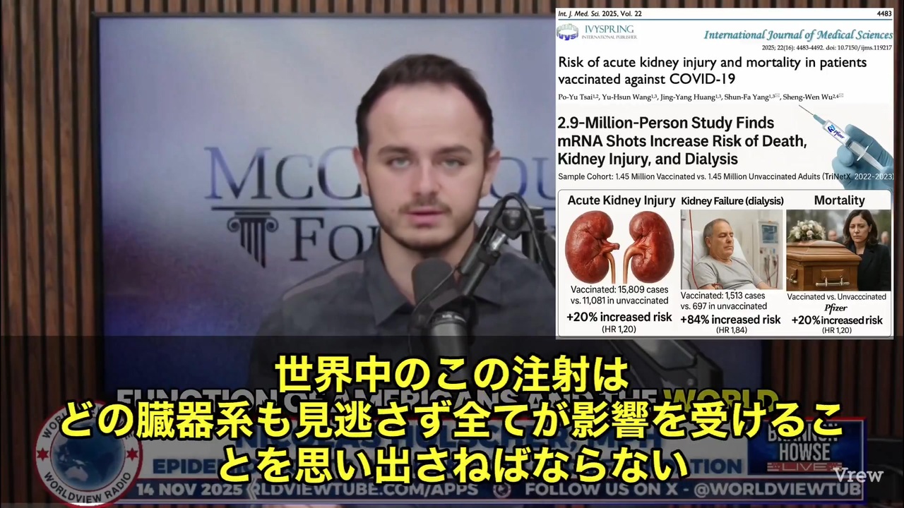 元の動画 → <a href="https://x.com/i/status/1989801461858070662" target="_blank" rel="noopener nofollow">https://x.com/i/status/1989801461858070662</a><br>🚨驚くような統計が出てきました。<br>あれを“打った人”と“打たなかった人”、その差を290万人規模で徹底的に比べた研究です😷<br><br>台湾・中部医科大学などの研究チームが、2022年から2023年にかけて145万人のワクチン接種者と、同じ人数の非接種者を比較したところ…<br>見えてきたのは、臓器へのダメージでした。<br><br>まず腎臓。<br>接種者の中では、急性腎障害(AKI)や腎不全による透析の発生率が爆増。<br><br>未接種者697人に対し、接種者は1,513人。<br>その差、+84%(HR 1.84)<br><br>しかも…悪化は接種の翌月から始まり、毎月少しずつ進行し続けているという指摘もあります。<br>ストップが効かないんです。<br><br>さらに死亡率も見てみると…<br>非接種者が11,081人だったのに対し、接種者は15,809人。<br>こちらも+20%の上昇(HR 1.20)📈<br><br>研究者たちは、mRNAワクチンに含まれる脂質ナノ粒子(LNP)が、腎臓だけでなく全身の臓器に到達していると考えています。<br><br>これ、1人や2人の話じゃないです。<br>290万人分の医療記録を解析して出た数字なんです。<br><br>しかも掲載されたのは、2025年の国際医学ジャーナル(IJMS)。<br>立派な査読付き論文です📚<br><br>これまでメディアが伝えてこなかった「臓器ダメージ」の実態。<br><br>“もしかして…”と感じていた方にとっては、数字ではっきり裏付けが出たことになるかもしれません。<br> 11月16日<br><br><br><br><a href="https://x.com/w2skwn3" target="_blank" rel="noopener nofollow">https://x.com/w2skwn3</a><br>トッポ<br><br>@w2skwn3<br>趣味は国際政治ですが大学では医学を学びました。テレビの嘘報道にはうんざりしてツイッターで情報交換したいです。