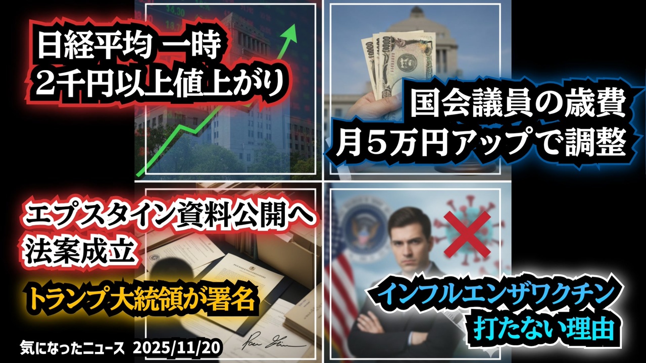 エプスタイン深掘りしてたら遅くなりました<br><br>◆日経平均 一時2千円以上値上がり◆国会議員の歳費、月5万円アップで調整◆エプスタイン氏の資料公開へ 法案成立 トランプ大統領が署名◆薬剤師がインフルエンザワクチン打たない理由<br><br>世界の市場が大きく揺れた一日。日経平均は一時2000円超の急騰で5万円台を回復し、背景にはエヌビディアの歴史的好決算がある。しかし、その高揚感の一方で、国内では議員歳費の月5万円アップが静かに進み、国民負担とのギャップが深まる。またアメリカでは、エプスタイン関連資料の公開法案に大統領が署名し、国際政治の裏側でも新たな動きが加速。薬剤師が語るインフルエンザワクチン接種をしない理由も必見です。<br><br>◆今回の台本&詳細<a href="https://keiichiro8140.hatenablog.com/entry/25112000222" target="_blank" rel="noopener nofollow">https://keiichiro8140.hatenablog.com/entry/25112000222</a><br><br>◆これまでの動画<a href="https://x.gd/sPXoJ◆もしも(BAN)の時のためのマイリンク集https://lit.link/K-16-news-44" target="_blank" rel="noopener nofollow">https://x.gd/sPXoJ◆もしも(BAN)の時のためのマイリンク集https://lit.link/K-16-news-44</a><br><br>ご覧いただきありがとうございます<br>m(_ _)m <br><br>気になったニュース 2025/11/20<br><br />著作権、肖像権に配慮して作成しております。<br><br>◆気になったニュースの台本!?<br>メモ代わりに作った台本をそのままあげてます<br><a href="https://keiichiro8140.hatenablog.com/." target="_blank" rel="noopener nofollow">https://keiichiro8140.hatenablog.com/.</a><br><br><br>ここからはシリーズ紹介<br><br><br>◆ ワクチン解毒・デトックス<br><a href="https://x.gd/fZweg" target="_blank" rel="noopener nofollow">https://x.gd/fZweg</a><br><br>◆ウイリアム・マキス博士のがん治療(イベルメクチン・フェンベンダゾール等)<br><a href="https://x.gd/AtFYS" target="_blank" rel="noopener nofollow">https://x.gd/AtFYS</a><br><br>◆予防接種健康被害救済制度<br><a href="https://x.gd/0xK9x" target="_blank" rel="noopener nofollow">https://x.gd/0xK9x</a><br><br>◆気になったニュース #1501~<br><br>◆ 【ショートver】気になったニュース<br><a href="https://x.gd/7MxXC" target="_blank" rel="noopener nofollow">https://x.gd/7MxXC</a><br><br>◆ 気になったニュース #1001~<br><a href="https://x.gd/Lp8gv" target="_blank" rel="noopener nofollow">https://x.gd/Lp8gv</a><br><br>◆ 気になったニュース #501~<br><a href="https://x.gd/EmbS4" target="_blank" rel="noopener nofollow">https://x.gd/EmbS4</a><br><br>◆ 気になったニュース #1~#500<br><a href="https://x.gd/uPhNb" target="_blank" rel="noopener nofollow">https://x.gd/uPhNb</a><br><br>◆ X(旧Twitter)・テレグラムで気になった情報<br><a href="https://x.gd/YG6FT" target="_blank" rel="noopener nofollow">https://x.gd/YG6FT</a><br><br>◆ 日比谷5万人パレードデ⚪生放送アーカイブ動画<br><a href="https://x.gd/3CHJv" target="_blank" rel="noopener nofollow">https://x.gd/3CHJv</a><br><br>◆日比谷5万人パレード⚪モのマイリスト作ってみました<br><a href="https://nico.ms/mylist/76828848?ref=sp_other" target="_blank" rel="noopener nofollow">https://nico.ms/mylist/76828848?ref=sp_other</a><br><br>◆3.30 令和の百姓⚪⚪<br><a href="https://www.nicovideo.jp/series/511791?ref=garage_share_other" target="_blank" rel="noopener nofollow">https://www.nicovideo.jp/series/511791?ref=garage_share_other</a><br><br>◆ 及川幸久さんの【XNEWS】シリーズ<br><a href="https://x.gd/3k78K" target="_blank" rel="noopener nofollow">https://x.gd/3k78K</a><br><br>◆これまでの動画<a href="https://x.gd/sPXoJ" target="_blank" rel="noopener nofollow">https://x.gd/sPXoJ</a><br><br>◆もしも(BAN)の時のためのマイリンク集<a href="https://lit.link/K-16_News44" target="_blank" rel="noopener nofollow">https://lit.link/K-16_News44</a><br><br>